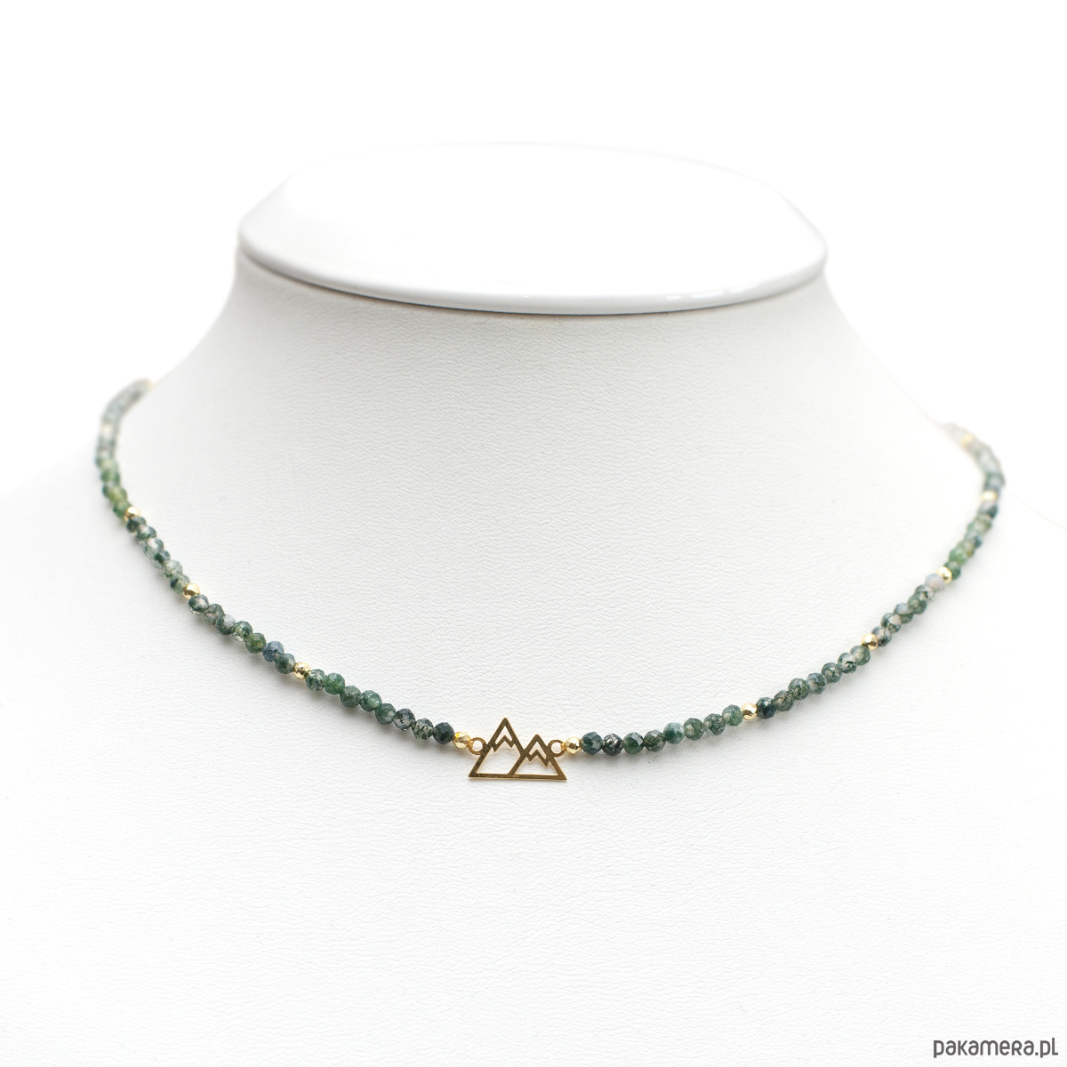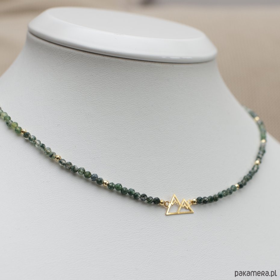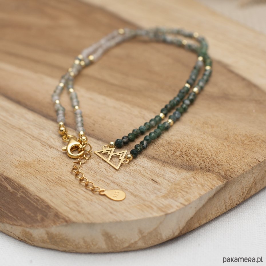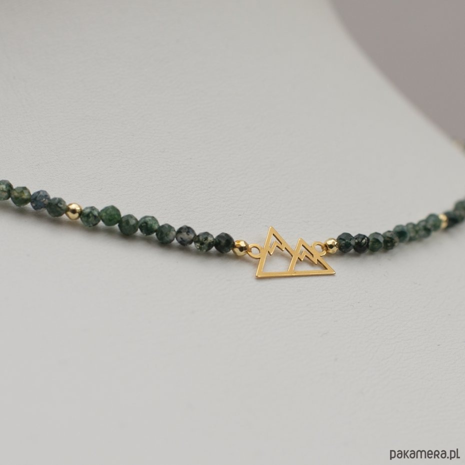 Agat to kamień równowagi i ochrony, którego ziemiste barwy działają niezwykle kojąco na serce. Fasetowane kuleczki odbijają światło niczym rosa na leśnym mchu, wprowadzając do Twojego dnia spokój i poczucie uziemienia. To naszyjnik, który wspiera emocjonalną stabilność nawet w obliczu największych życiowych wyzwań. Złocony motyw Gór symbolizuje niezłomność, ambicję i jasność umysłu. Noszenie tego symbolu blisko siebie pomaga zachować koncentrację na wyznaczonych celach i dodaje odwagi w pokonywaniu własnych ograniczeń. Dodatek złotego hematytu wzmacnia wiarę we własne możliwości, zamieniając każde marzenie w plan działania. Amulet został wykonany na wytrzymałym sznurku jubilerskim, co symbolizuje elastyczność i odporność niezbędną na każdym szlaku. Elementy ozdobne oraz zapięcie wykonano ze srebra próby 925, złoconego grubą warstwą 24-karatowego złota, co gwarantuje najwyższą jakość i długowieczny blask Twojej biżuterii.