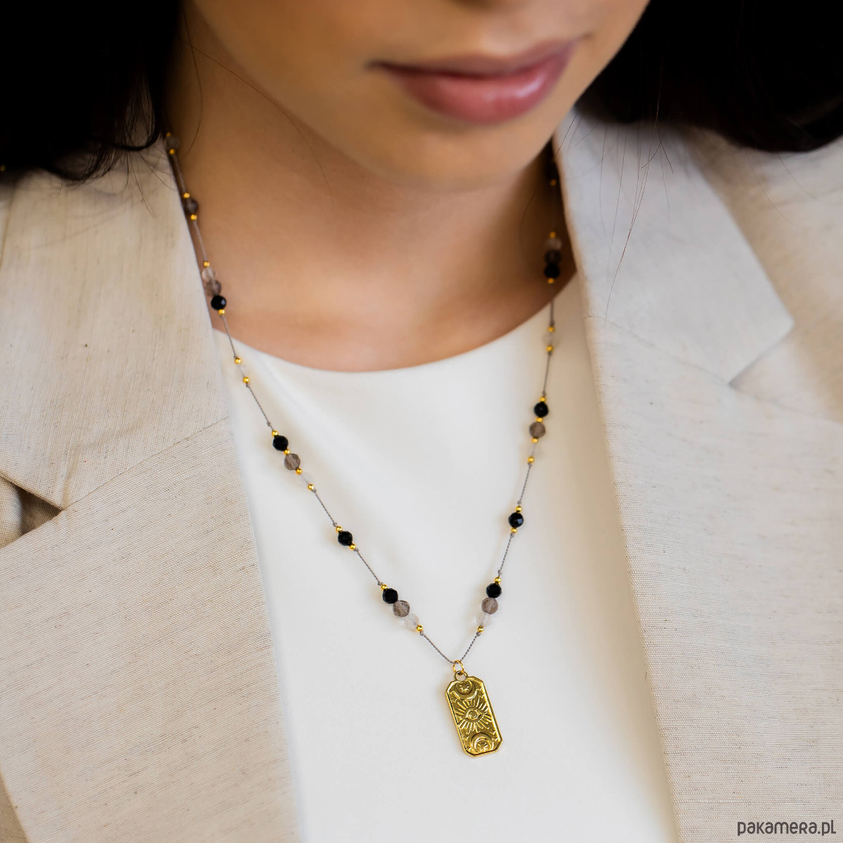 Regulowany naszyjnik na jedwabnej nici z kamieniami naturalnymi, którym przypisuje się właściwości chroniące przed negatywną energią.