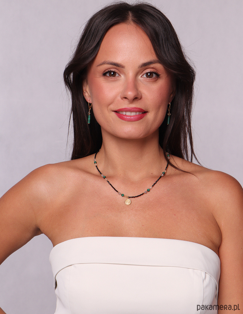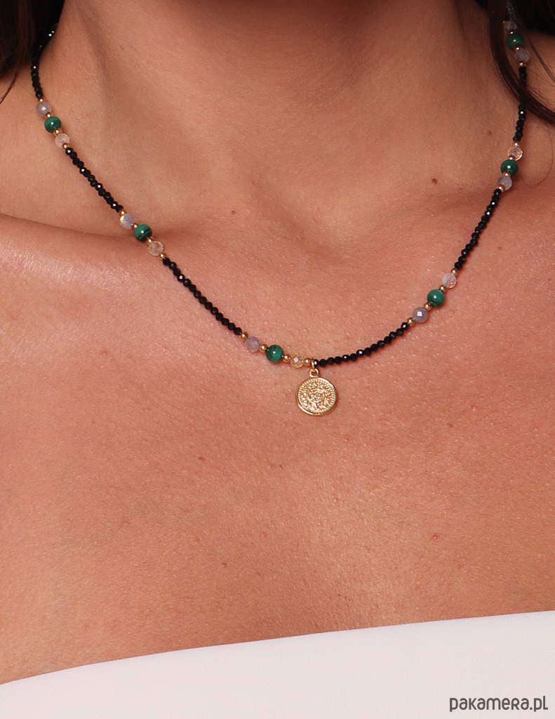 Połączenie czerni, zieleni, złota i delikatnych, opalizujących refleksów tworzy nowoczesny, zmysłowy i bardzo talizmaniczny naszyjnik. Pozłacana zawieszka nadaje biżuterii eleganckie, biżuteryjne wykończenie.
