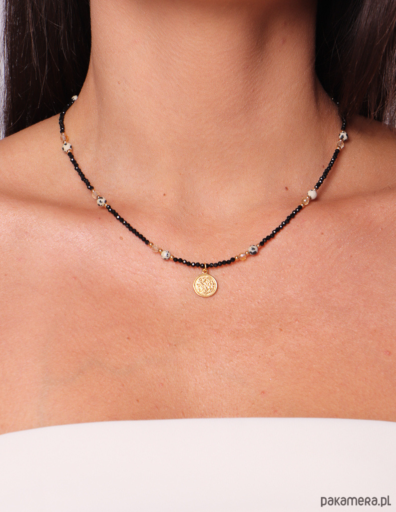 Cechy produktuKamień: czarny turmalin, japis dalmatyński, hematytWielkość kamieni: czarny turmalin 2 mm, jaspis dalmatyński 4 mm, cytryn 4 mm, hematyt 2 mmKolor: złoty, biały w czarne kropki, jasno żółty, czarny