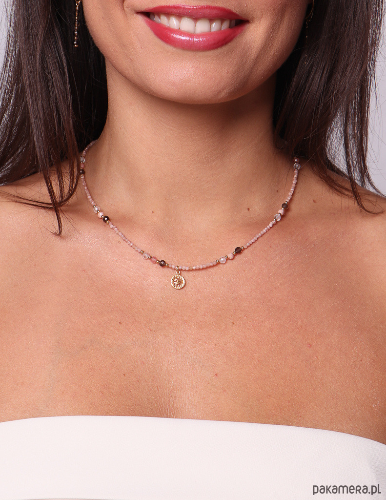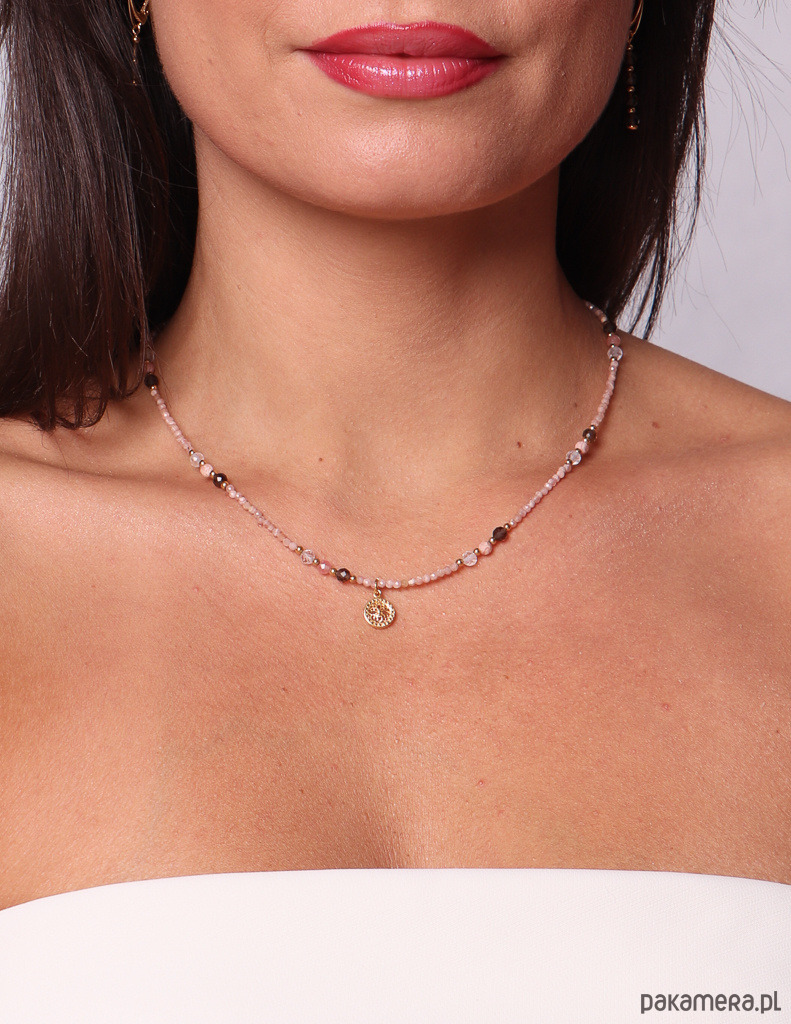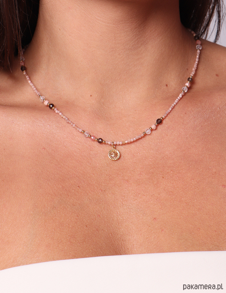 Cechy produktuKamień: rodochrozyt, kryształ górski, kwarc dymnyWielkość kamieni: rodochrozyt 2 mm, rodochrozyt 4 mm, kwarc dymny 4 mm, kryształ górski 4 mm, hematyt 2 mmKolor: złoty, biały, pudrowy róż, różowy