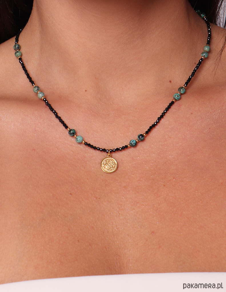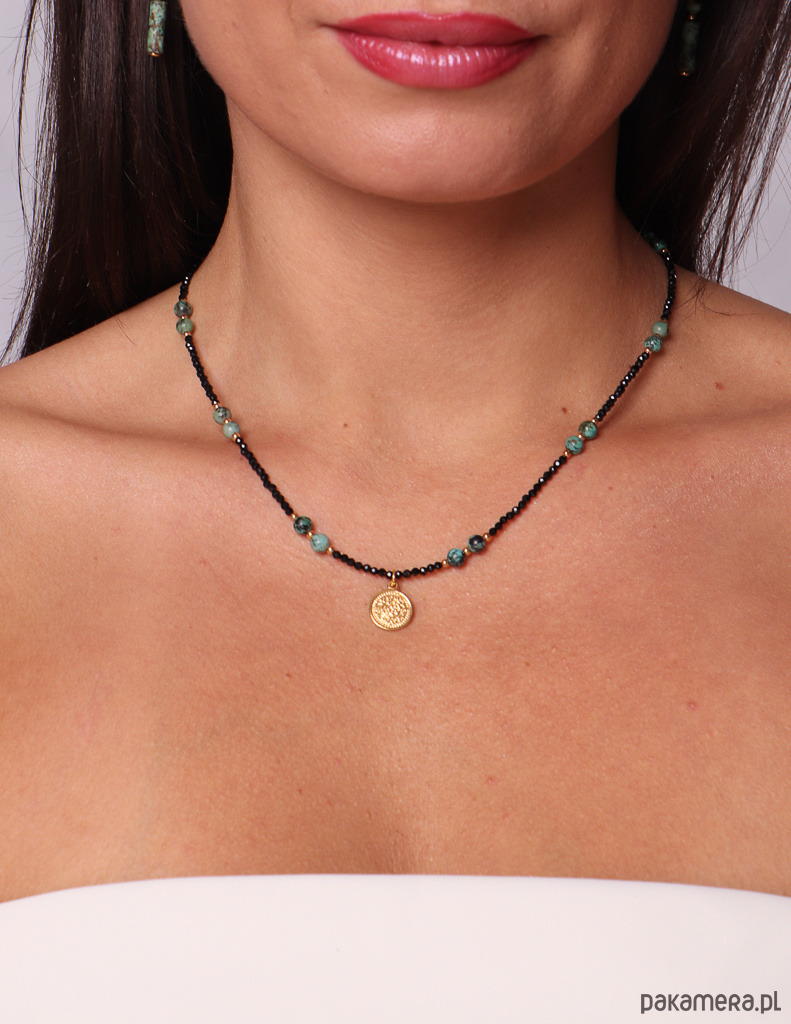 Połączenie turkusowych, nakrapianych kamieni z czernią turmalinu i złotymi akcentami tworzy biżuterię nowoczesną, z charakterem i pełną symbolicznej mocy. Centralna zawieszka podkreśla talizmaniczny charakter naszyjnika.