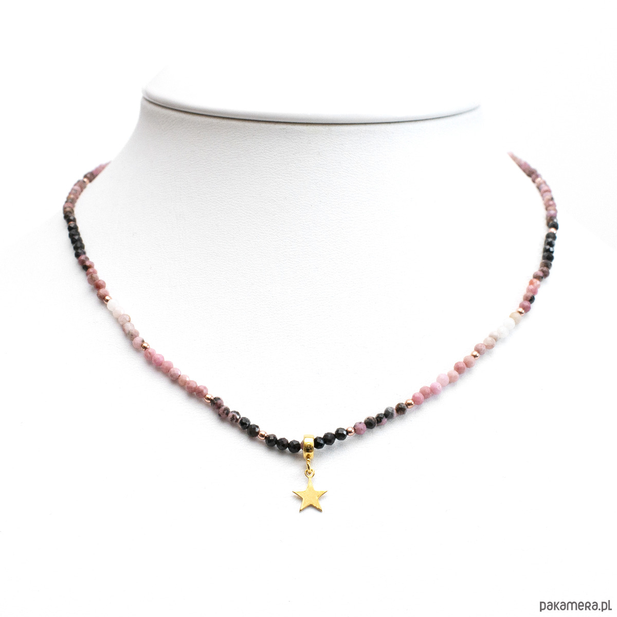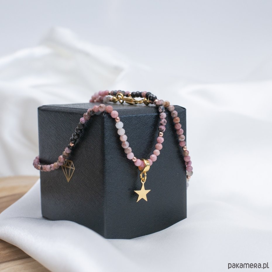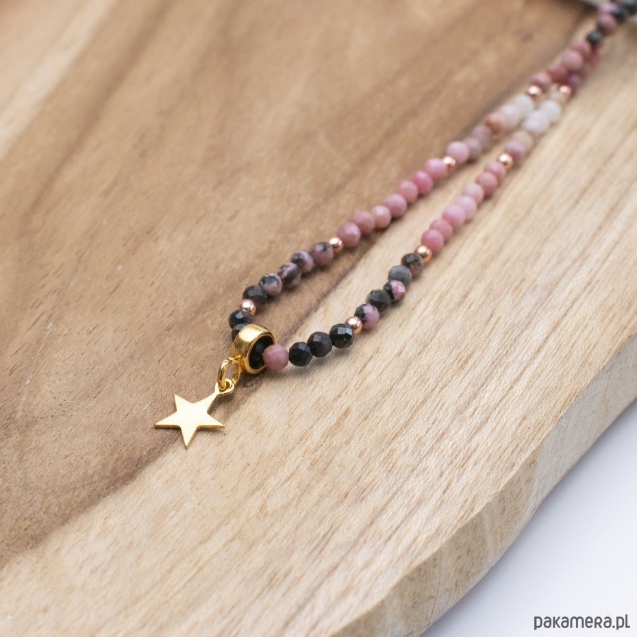 Rodonit to jeden z najpotężniejszych kamieni dla Twojego serca. Pomaga leczyć dawne rany, uczy wybaczenia i otwiera na bezwarunkową miłość do samej siebie. Jego pudrowy róż, przeplatany naturalnymi ciemniejszymi inkluzjami, uspokaja emocje i przynosi poczucie głębokiego bezpieczeństwa. Złocona gwiazdka symbolizuje nadzieję, inspirację i dążenie do celu. Nosząc ten symbol, wspierasz swoją intuicję i jasność umysłu. Rodonit pomaga odkryć Twoje ukryte talenty i daje odwagę, by realizować marzenia, o których boisz się głośno mówić, zamieniając chaos myśli w klarowną wizję przyszłości. Akcenty z hematytu złoconego różowym złotem wzmacniają Twoje poczucie uziemienia. Hematyt dodaje siły i odporności, a różowy odcień złocenia idealnie koresponduje z barwą Rodonitu. Wykonanie na trwałym sznurku z zapięciem ze srebra złoconego 24k złotem to gwarancja szlachetności, która przetrwa próbę czasu.