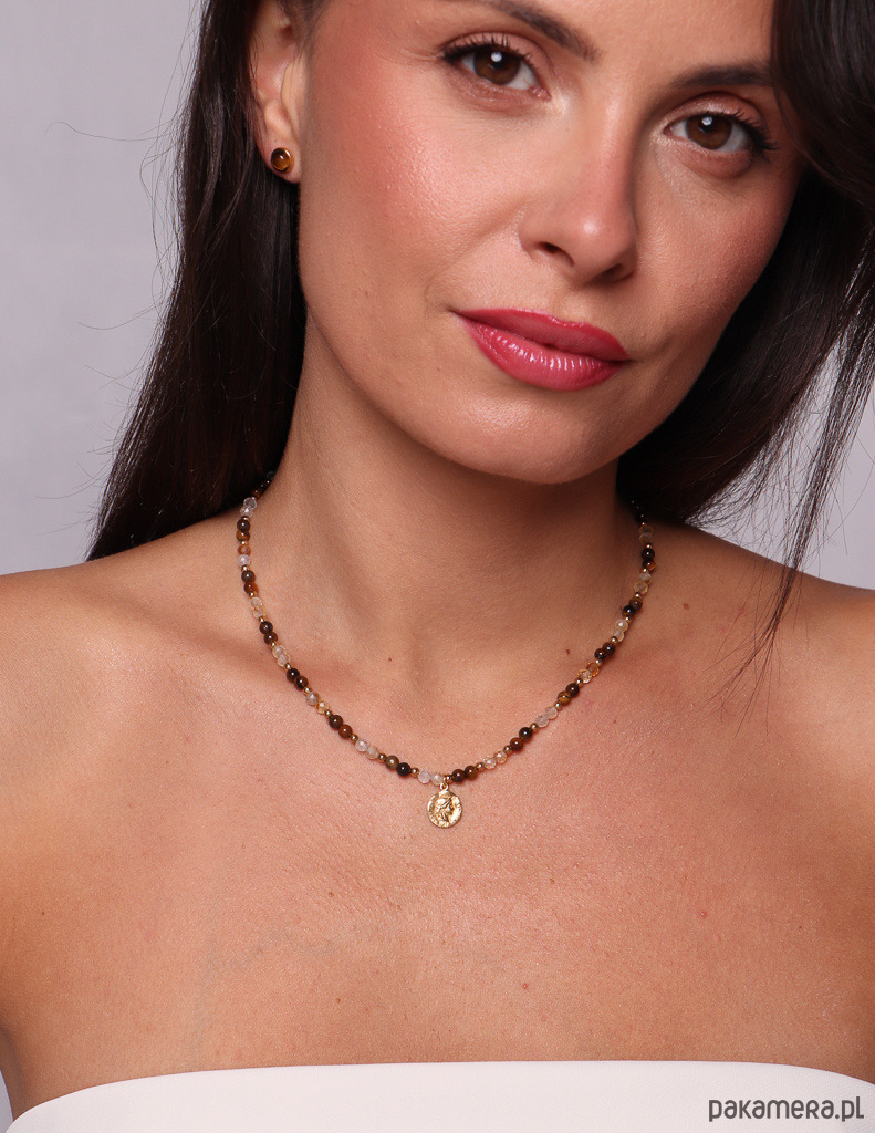 Połączenie miodowych, złotych i brązowych tonów tworzy biżuterię elegancką, nowoczesną i pełną energetycznego ciepła. Pozłacana zawieszka podkreśla talizmaniczny charakter naszyjnika i dodaje mu biżuteryjnego blasku.