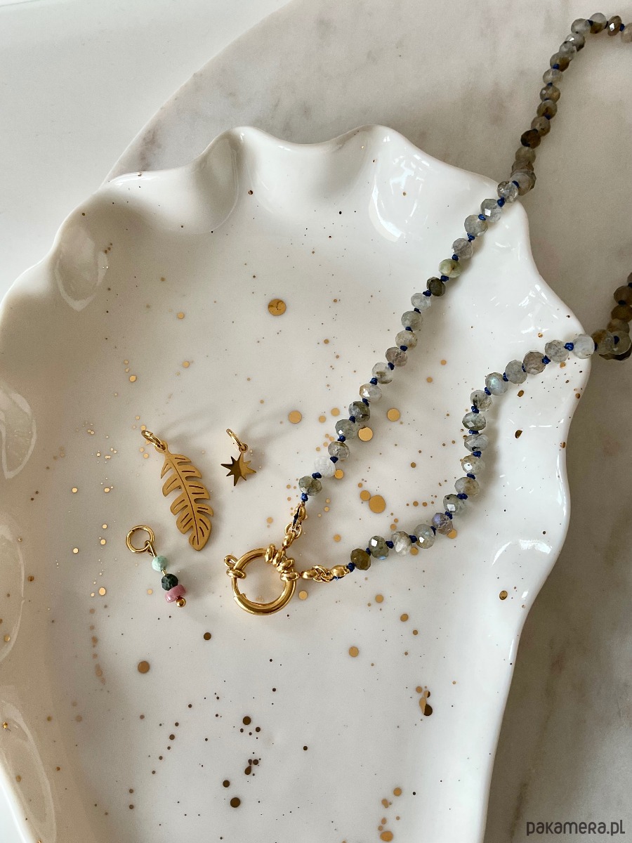 Naszyjnik jest delikatnie zawieszony na jedwabnej nici, przeplatanej supełkami, co nadaje mu lekkości i zwiewności. Zapięcie pierścieniowe daje możliwość personalizacji – możesz dowolnie dobrać zawieszki, by nadać naszyjnikowi indywidualny charakter, lub nosić go samodzielnie, w pełnej prostocie. To biżuteria, która doskonale sprawdzi się w codziennych stylizacjach, a także jako wyjątkowy akcent na specjalne okazje, wnosząc odrobinę magii i tajemniczości do Twojego wyglądu.