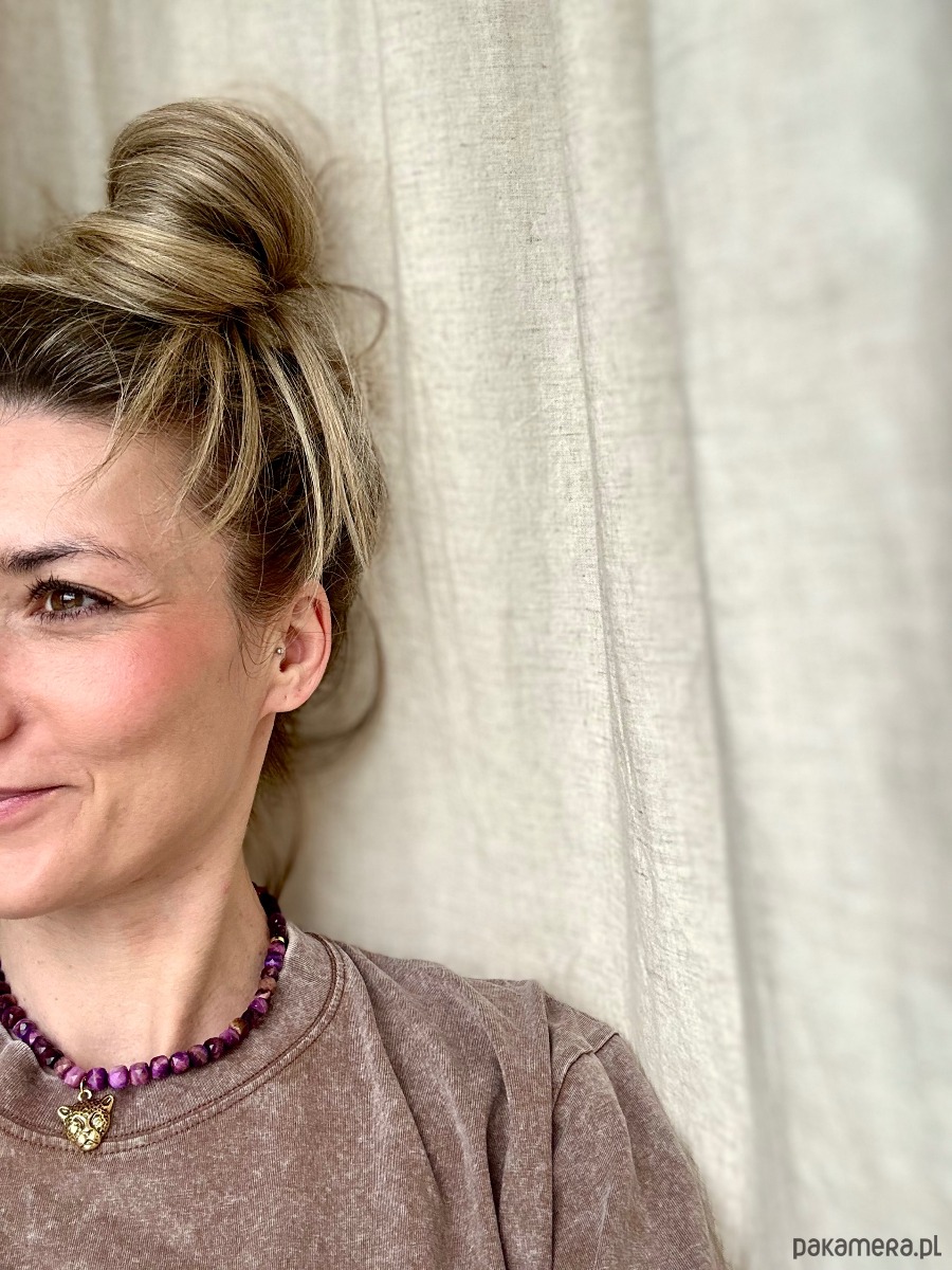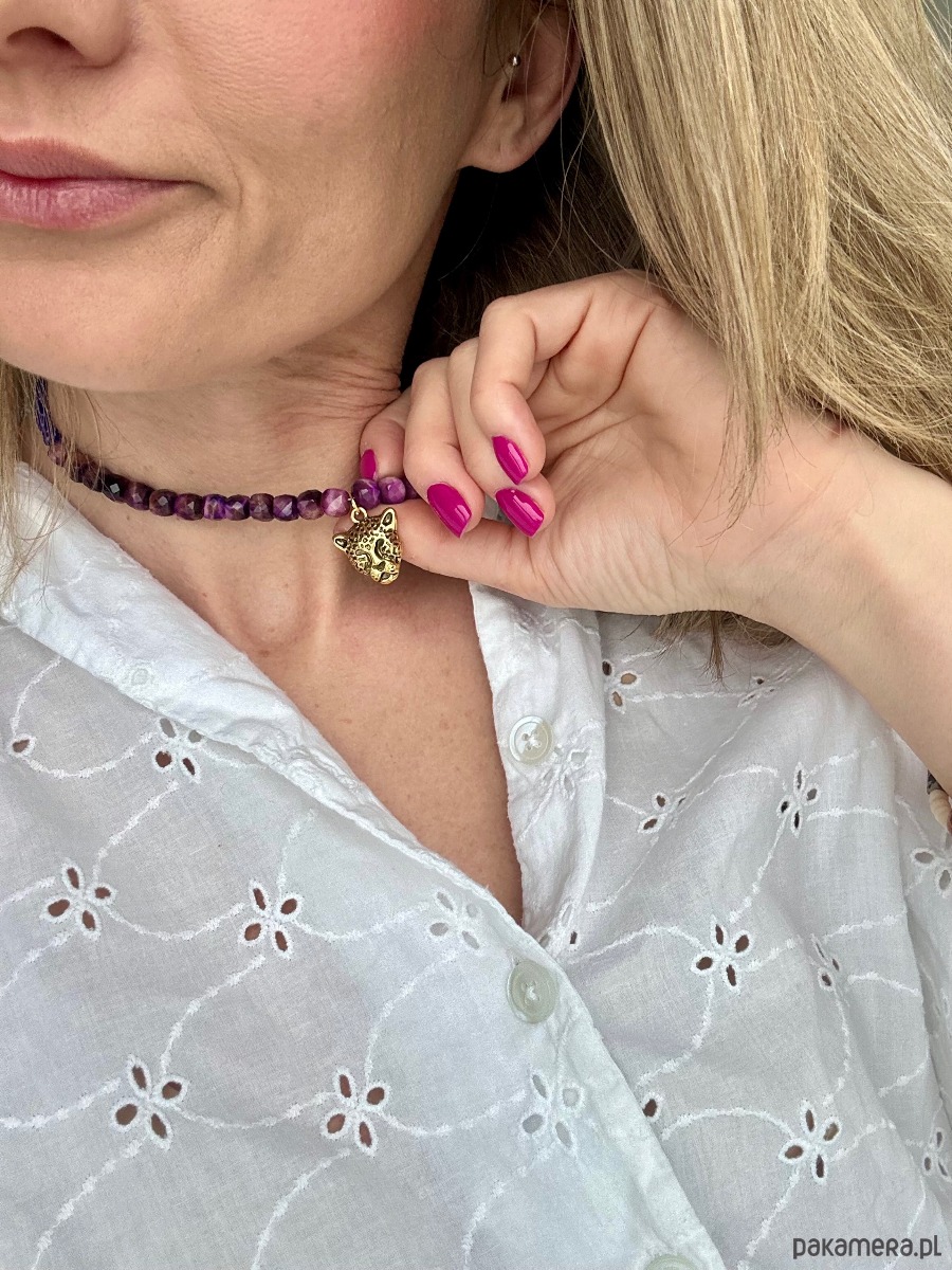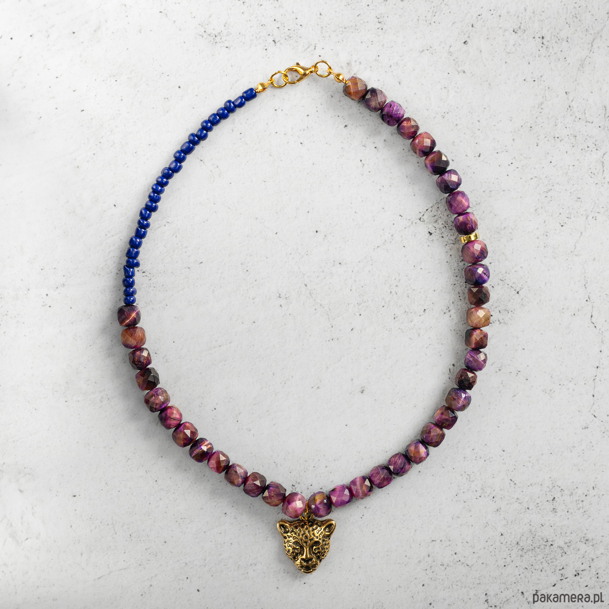 Naszyjnik Tiger. Łączy ze sobą zupełnie zwyczajny koralik w pięknym niebieskim kolorze i absolutnie wyjątkowy kamień naturalny w pięknym fioletowym zmiennym w stronę różu kolorze. Tygrysie oko to kamień o wyjątkowej urodzie. Naszyjnik jest dość masywny, tygrys jakby odważny ale jakże subtelny. Pasuje do wszelakich stylizacji, stanowi dodatek którego nie można nie zauważyć i się nim zachwycić.