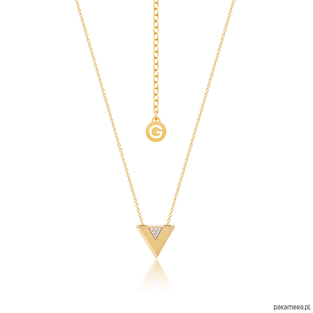 Minimalistyczny złocony naszyjnik z trójkątem ozdobiony sześcioma białymi cyrkoniami, które tworzą literkę V. Niezwykle elegancki wzór zawieszony na delikatnym łańcuszku. Przy zapięciu metka z logo marki.