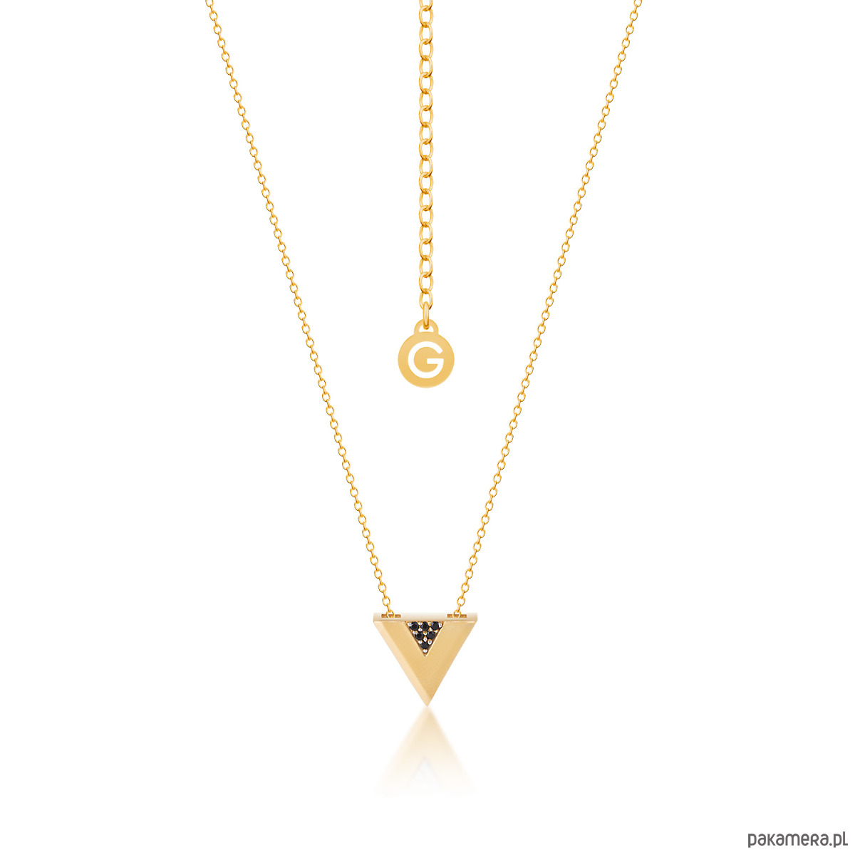 Minimalistyczny złocony naszyjnik z trójkątem ozdobiony sześcioma czarnymi cyrkoniami, które tworzą literkę V. Niezwykle elegancki wzór zawieszony na delikatnym łańcuszku. Przy zapięciu metka z logo marki.