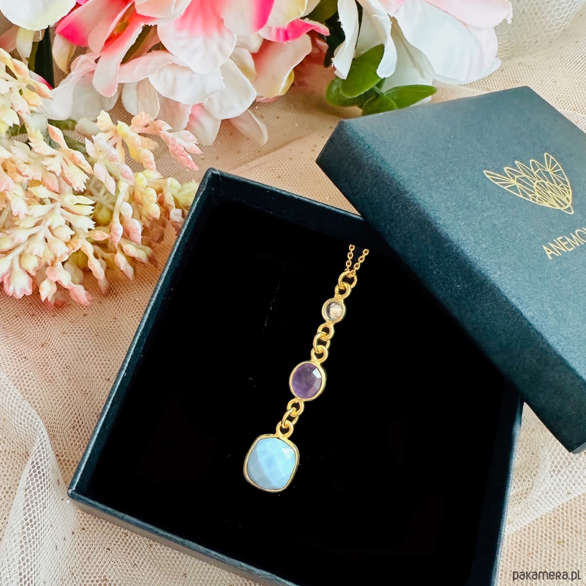 Starannie dobrane kamienie naturalne: chalcedon o wyjątkowej, lekko mlecznej strukturze, głęboki ametyst oraz subtelnie połyskująca cyrkonia. Razem tworzą spójną i przyciągającą uwagę całość. Każdy kamień wyróżnia się unikalnym rysunkiem, dzięki czemu biżuteria nabiera indywidualnego charakteru.