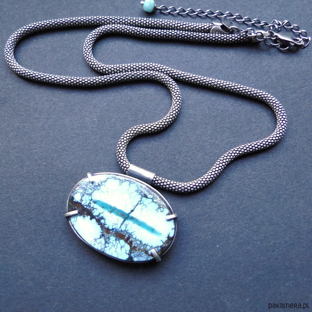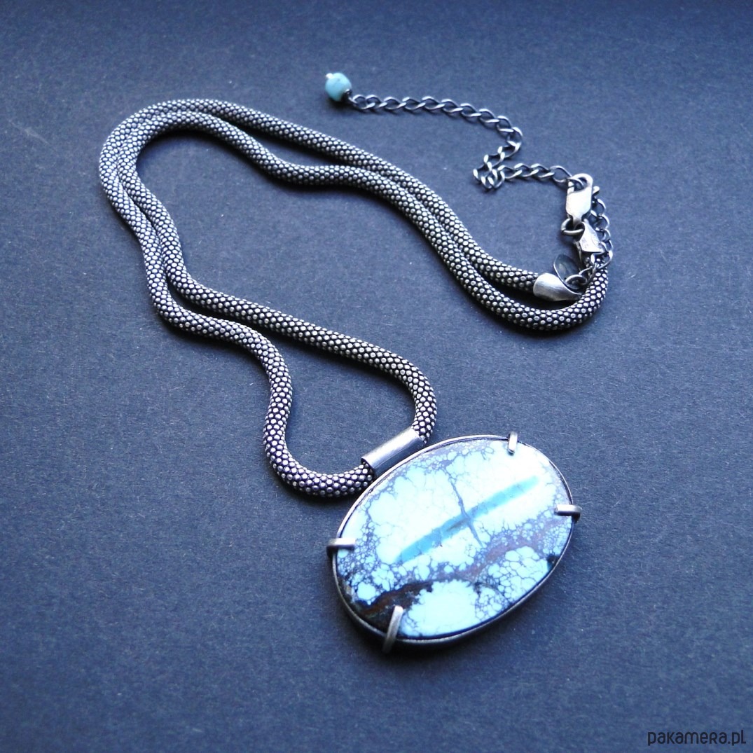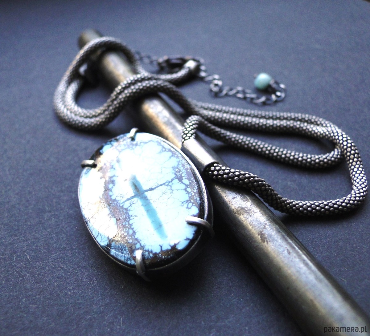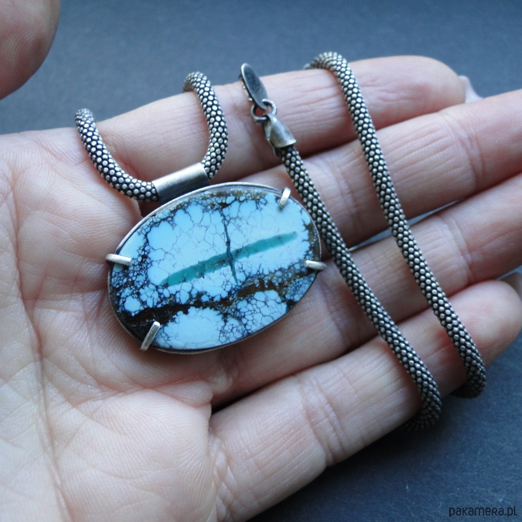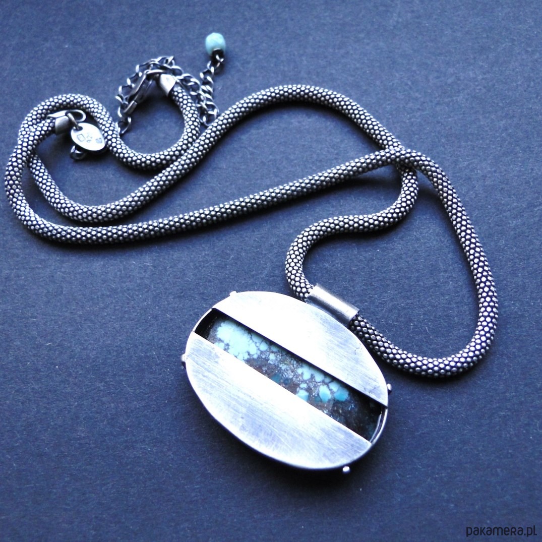 Masywny, unikatowy naszyjnik w surowym wykończeniu. Wykonany własnoręcznie wg tradycyjnych technik jubilerskich typu przetapianie srebra, młotkowanie,lutowanie,oksydowane,walcowanie. Pracochłonny mimo swej prostoty. W całości wykonany ze srebra 930. Kamień: piękny naturalny turkus w odcieniu jasnego lazuru z brązem i zieloną pręgą w poprzek kamienia. Łańcuch gruby śr.3mm, dość nietypowy splot. Zapięcie z regulacją długości od 42 do 50 cm. Przy zapięciu mały amazonit 4 mm. Naszyjnik z imiennikiem jubilerskim,cechowany w UP Wrocław. Nie moczyć w wodzie.