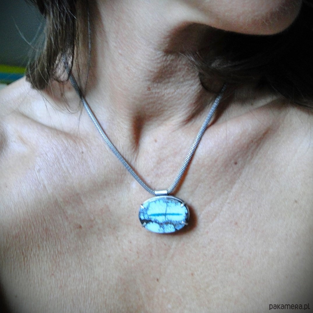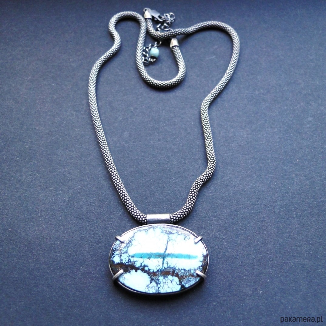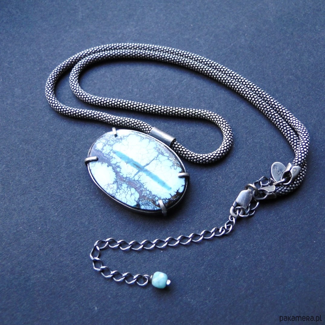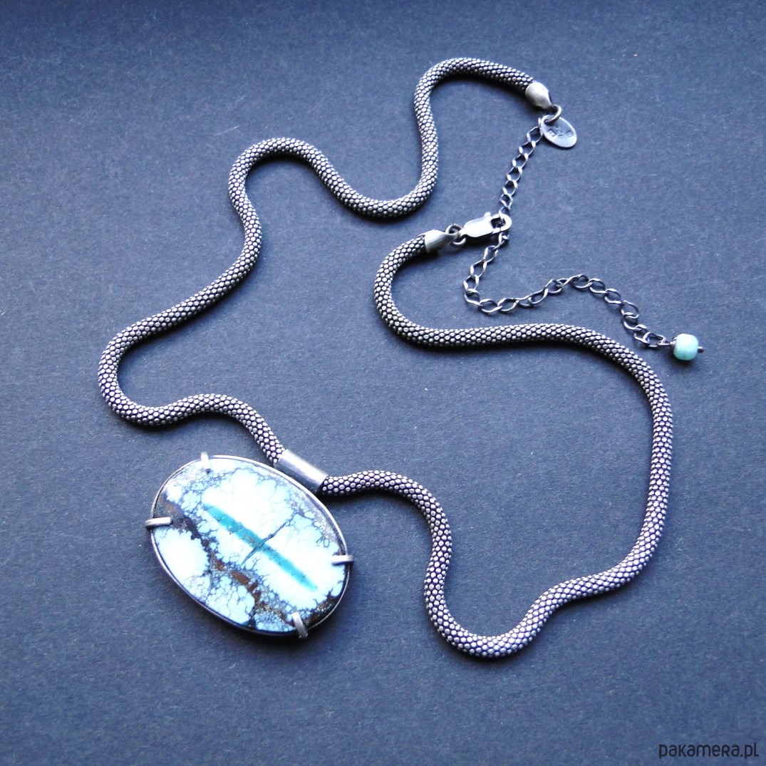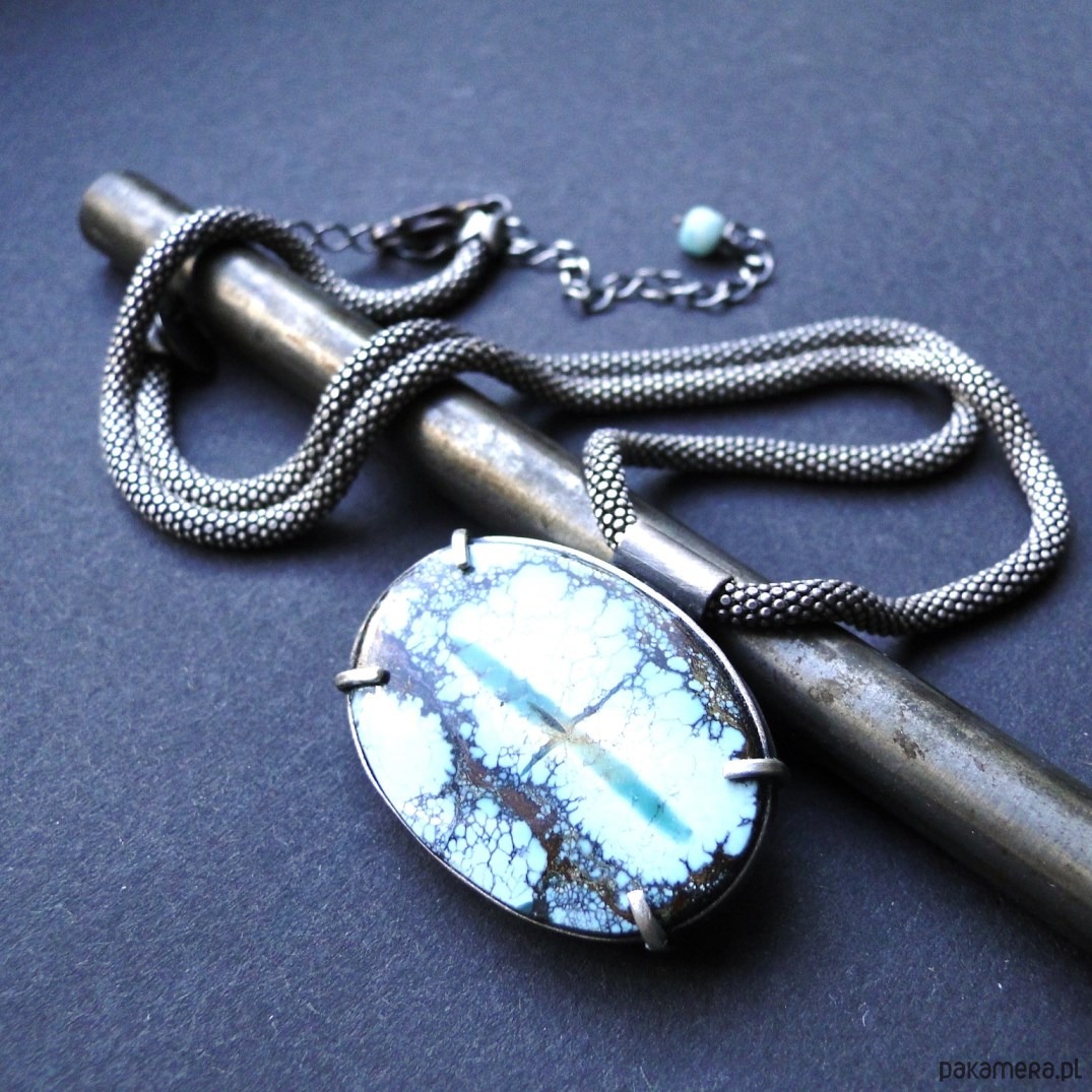 Masywny, unikatowy naszyjnik w surowym wykończeniu. Wykonany własnoręcznie wg tradycyjnych technik jubilerskich typu przetapianie srebra, młotkowanie,lutowanie,oksydowane,walcowanie. Pracochłonny mimo swej prostoty. W całości wykonany ze srebra 930. Kamień: piękny naturalny turkus w odcieniu jasnego lazuru z brązem i zieloną pręgą w poprzek kamienia. Łańcuch gruby śr.3mm, dość nietypowy splot. Zapięcie z regulacją długości od 42 do 50 cm. Przy zapięciu mały amazonit 4 mm. Naszyjnik z imiennikiem jubilerskim,cechowany w UP Wrocław. Nie moczyć w wodzie.