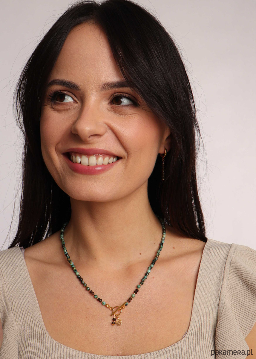 Wielkość kamieni kwarc dymny: 3x4 mm - oponkaKolor: Turkusowy, brązowy, wielokolorowyWykończenie: Srebro pr. 925, pozłacane 24 k złotemWłaściwość kamieniaKwarc dymny pomaga poradzić sobie z negatywnymi emocjami, uwalnia od żalu i pretensji do ludzi. Usuwa energetyczne blokady i przeradza nieśmiałość w duchową siłę. Promuje pozytywne myśli, wspomaga instynkt. Turkus jest kamieniem szlachetnym zwanym również kamieniem niebios. Jego energia strzeże przed negatywnymi emocjami, zapobiegając stanom lękowym. Turkus zapewnia jasny umysł, jest symbolem hojności i oddania, pomaga żyć w zgodzie ze swoim wnętrzem.Idealny na prezentNaszyjnik będzie idealnym pomysłem prezentowym. Biżuteria, wykonywana z kamieni naturalnych wpisuje się w obecne trendy, dzięki czemu możesz mieć pewność, że zachwyci obdarowaną osobę. Nasz naszyjnik z turkusem i kwarcem w żywych kolorach, jest eleganckim elementem ubioru, który obłędnie wyglądać będzie w zestawieniu z każdą stylizacją. Możliwość regulacji długości sprawia, że nie musisz już martwić się o to, że nie trafisz z rozmiarem!OpakowanieNaszyjnik zapakowany będzie w minimalistyczne, granatowe pudełeczko ze złotym logiem. Wewnątrz pudełeczka znajdziesz białą wkładkę z nazwą kamienia oraz jego wyjątkowymi właściwościami.