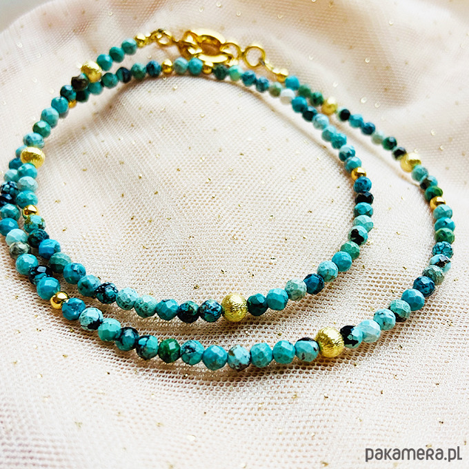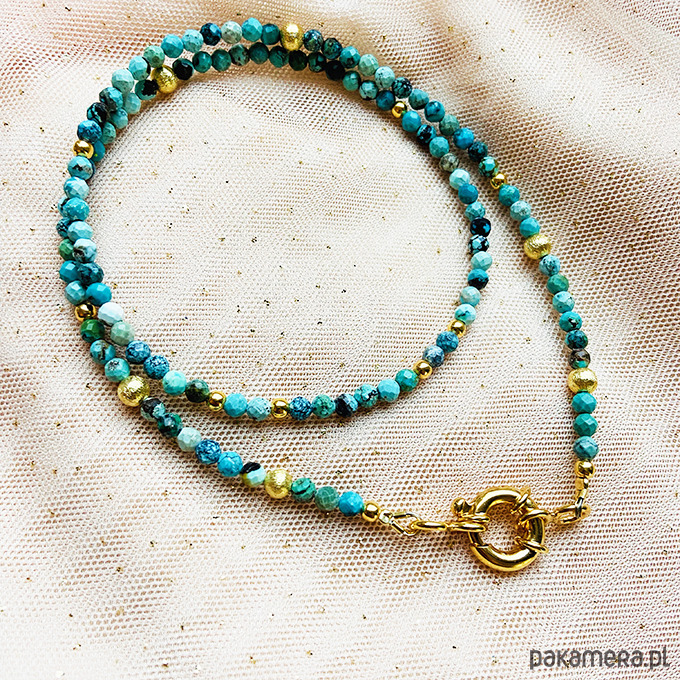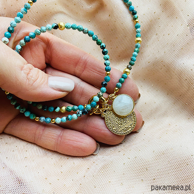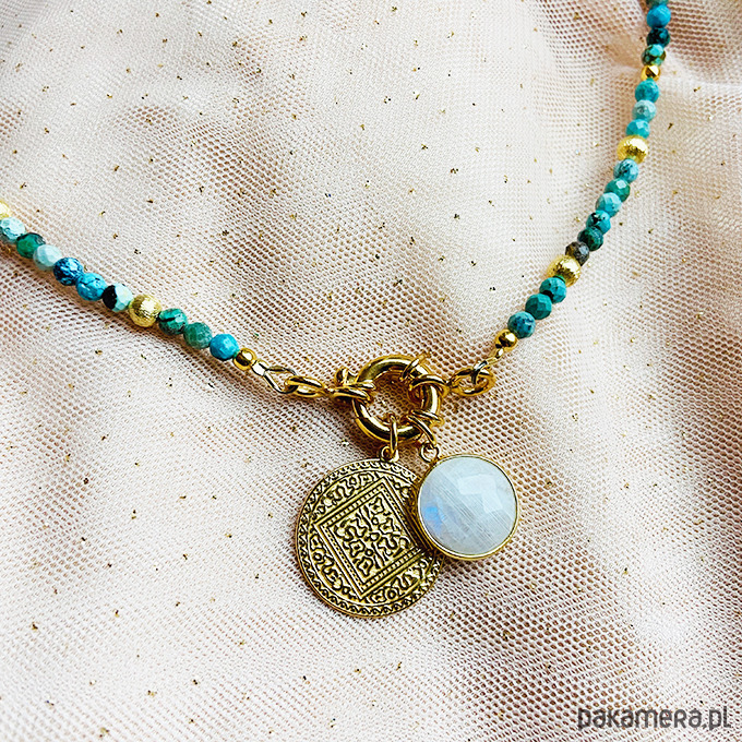 Wykonany ręcznie z naturalnych kamieni - fasetowanych turkusów z zawieszkami - moneta i kamień księżycowy w oprawie. Srebrne złocone 24 k złotem koraliki i elementy. Duże wygodne zapięcie.