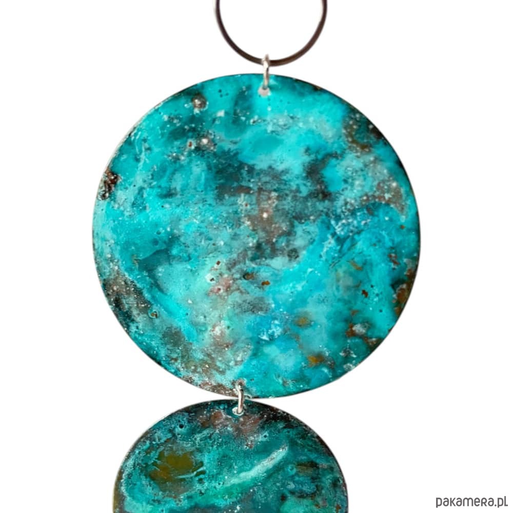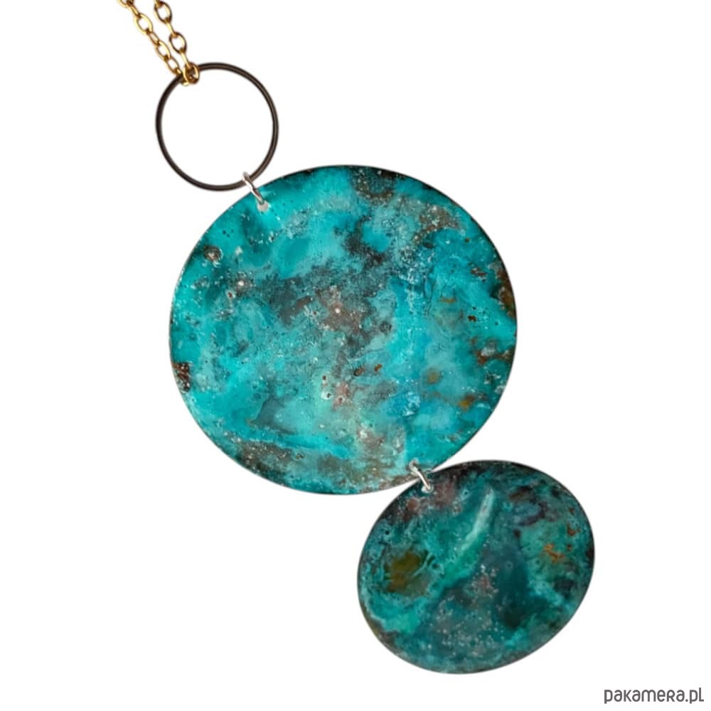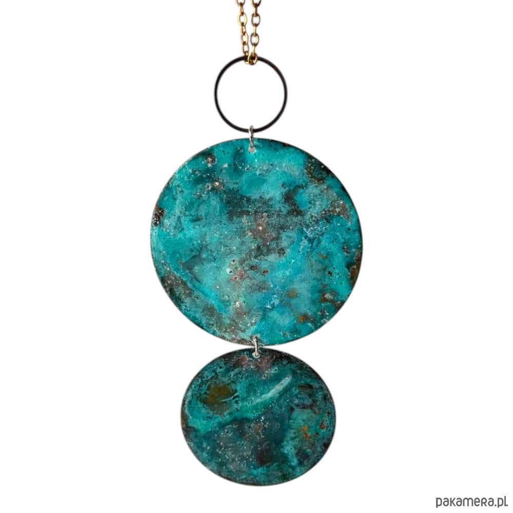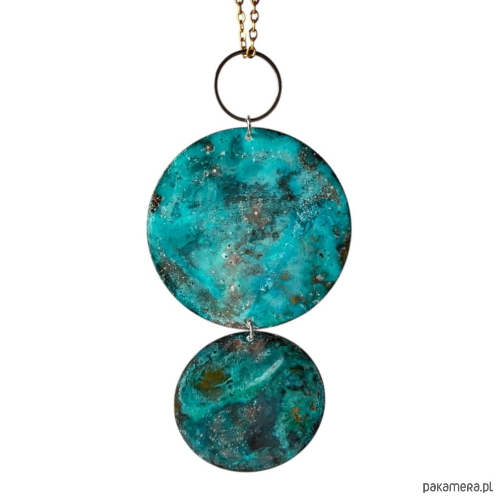 Naszyjnik z patynowanej miedzi złożony z dwóch połączonych kół, uzupełniony złoconym detalem. Turkusowo-zielona kolorystyka nadaje mu świeży, artystyczny wygląd.