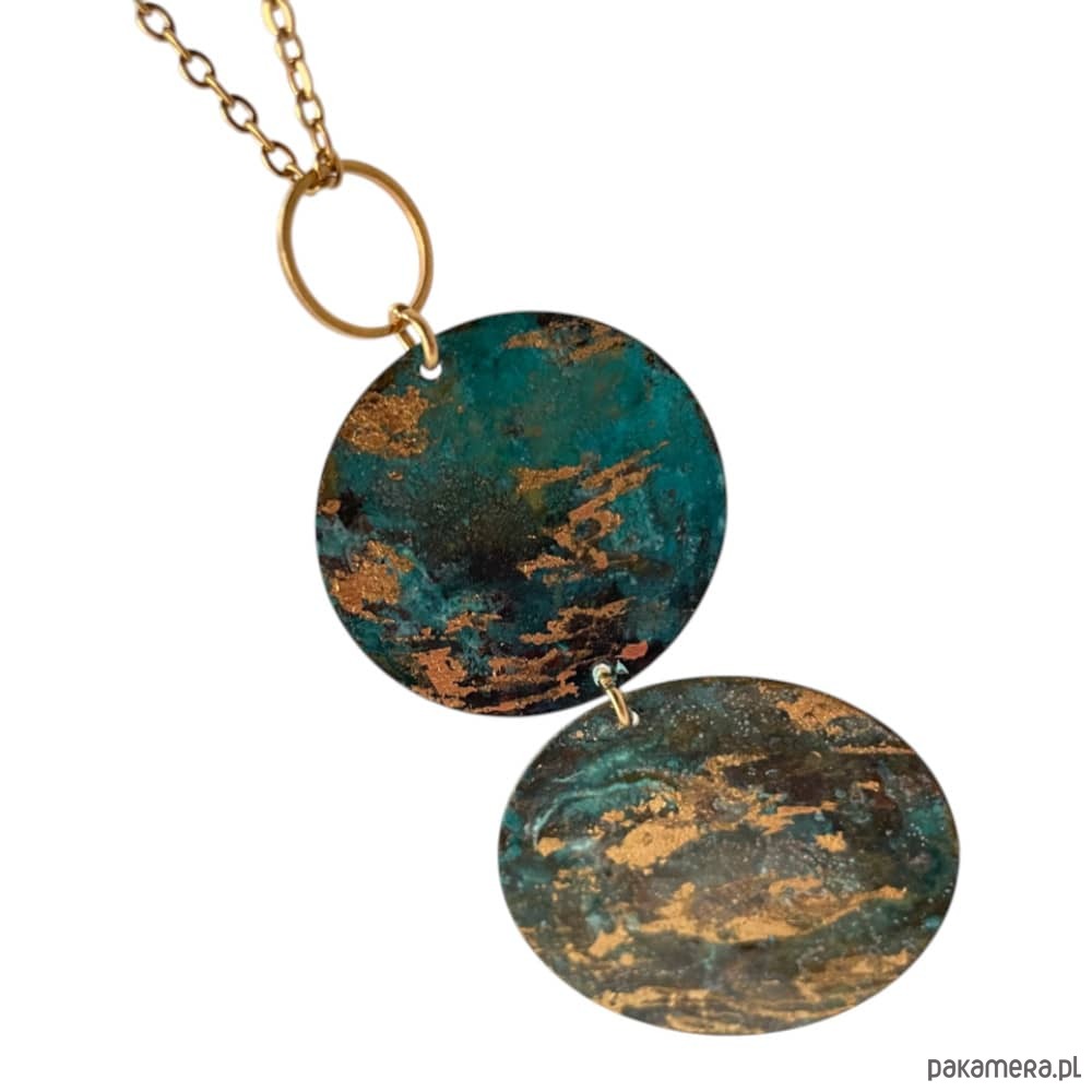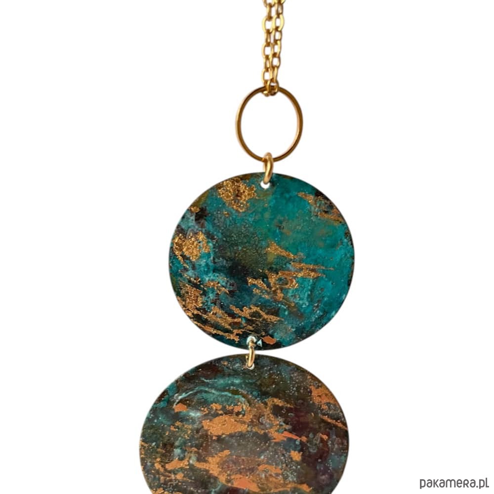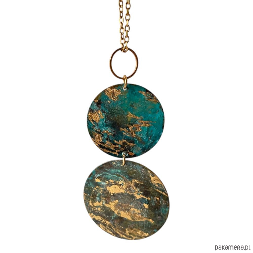 Dwa koła tworzą tu pionową, harmonijną kompozycję, w której każdy element ma własny układ koloru i światła. Patynowana miedź odsłania turkusy, zielenie i subtelne złocenia, które zmieniają odbiór naszyjnika w zależności od oświetlenia.