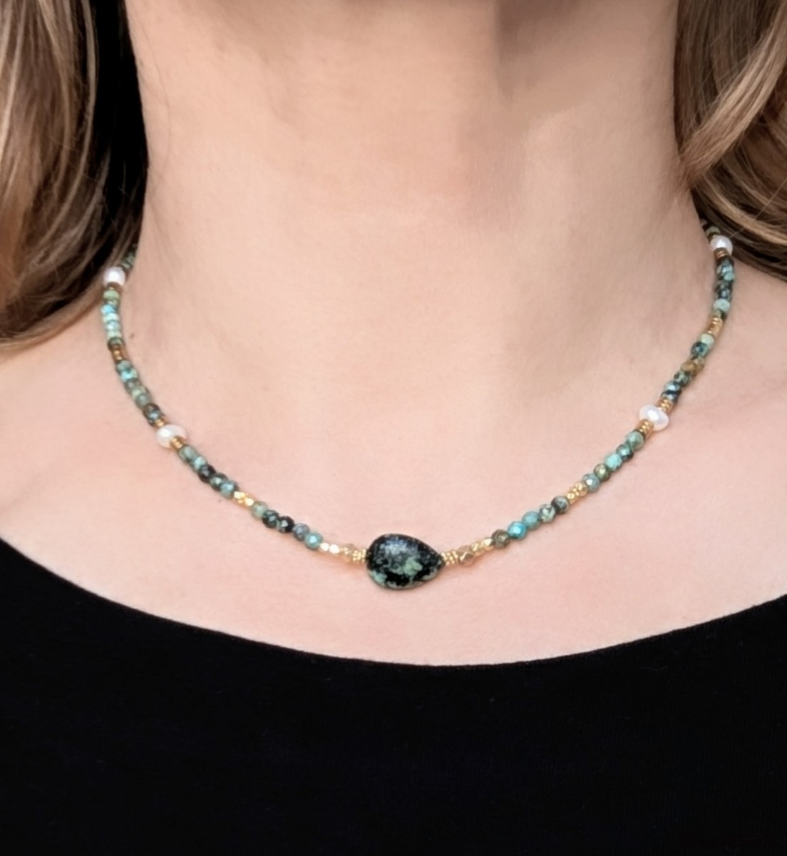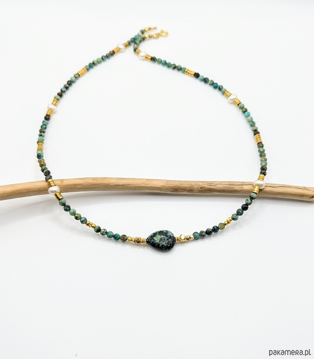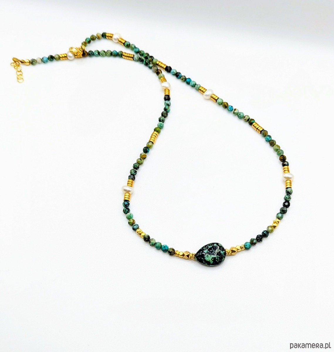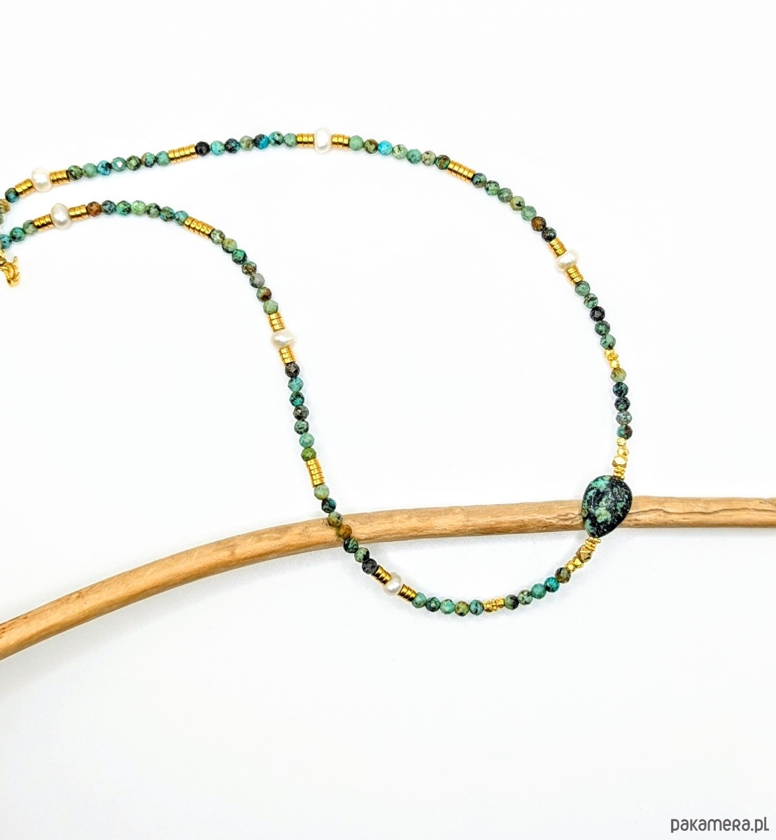 Turkus rozświetlony perełkami i złoconymi dodatkami: srebrem próby 925 i hematytem. Lekki, pozytywny i uroczy. Na środku znajduje się turkusowa łezka. Naszyjnik idealny do letnich stylizacji.