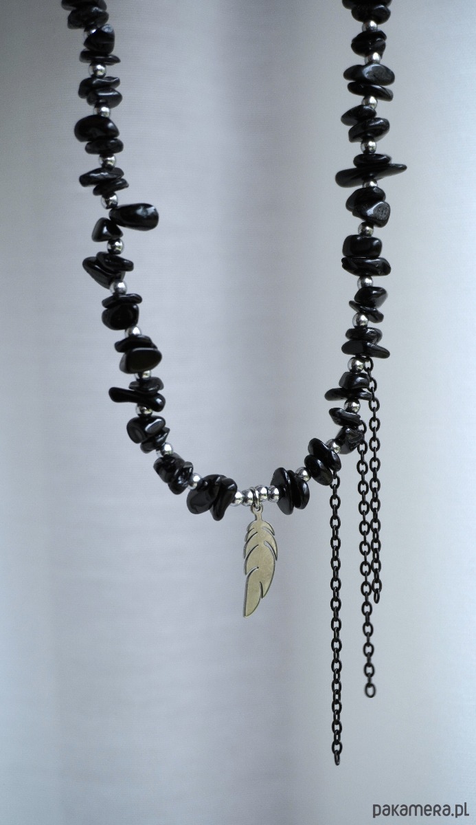 W centralnej części naszyjnika znajduje się zawieszka w kształcie pióra, symbolizująca lekkość i wolność. Całość uzupełniają trzy delikatne, zwisające łańcuszki, które dodają całości nowoczesnego i dynamicznego akcentu.