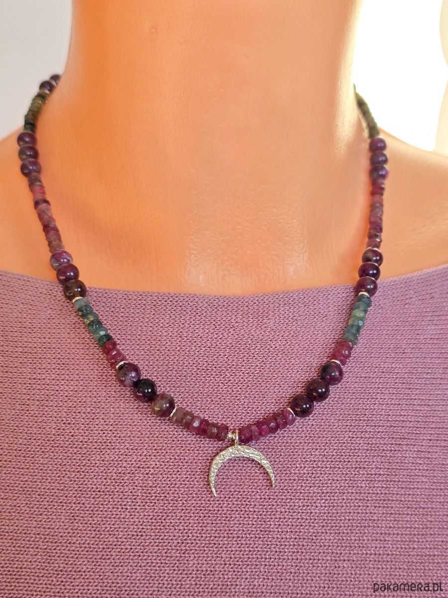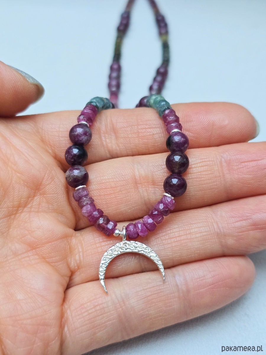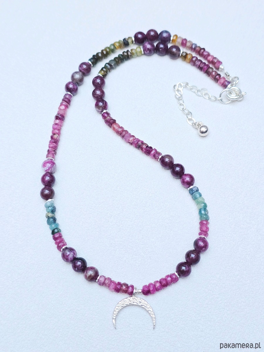 Unikatowy naszyjnik z lunulką. Wykonany z naturalnych, kolorowych oponek i kul turmalinu.