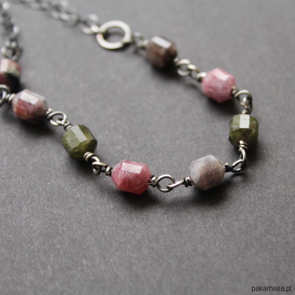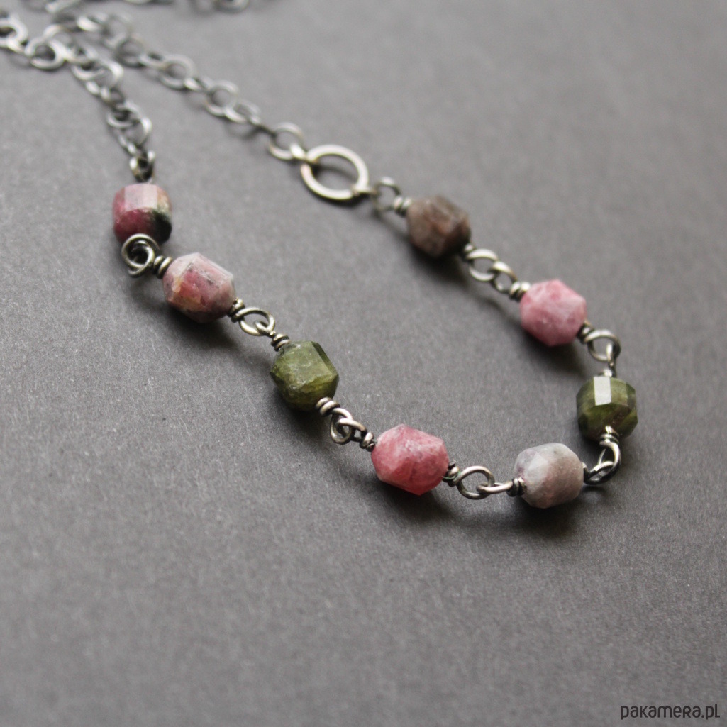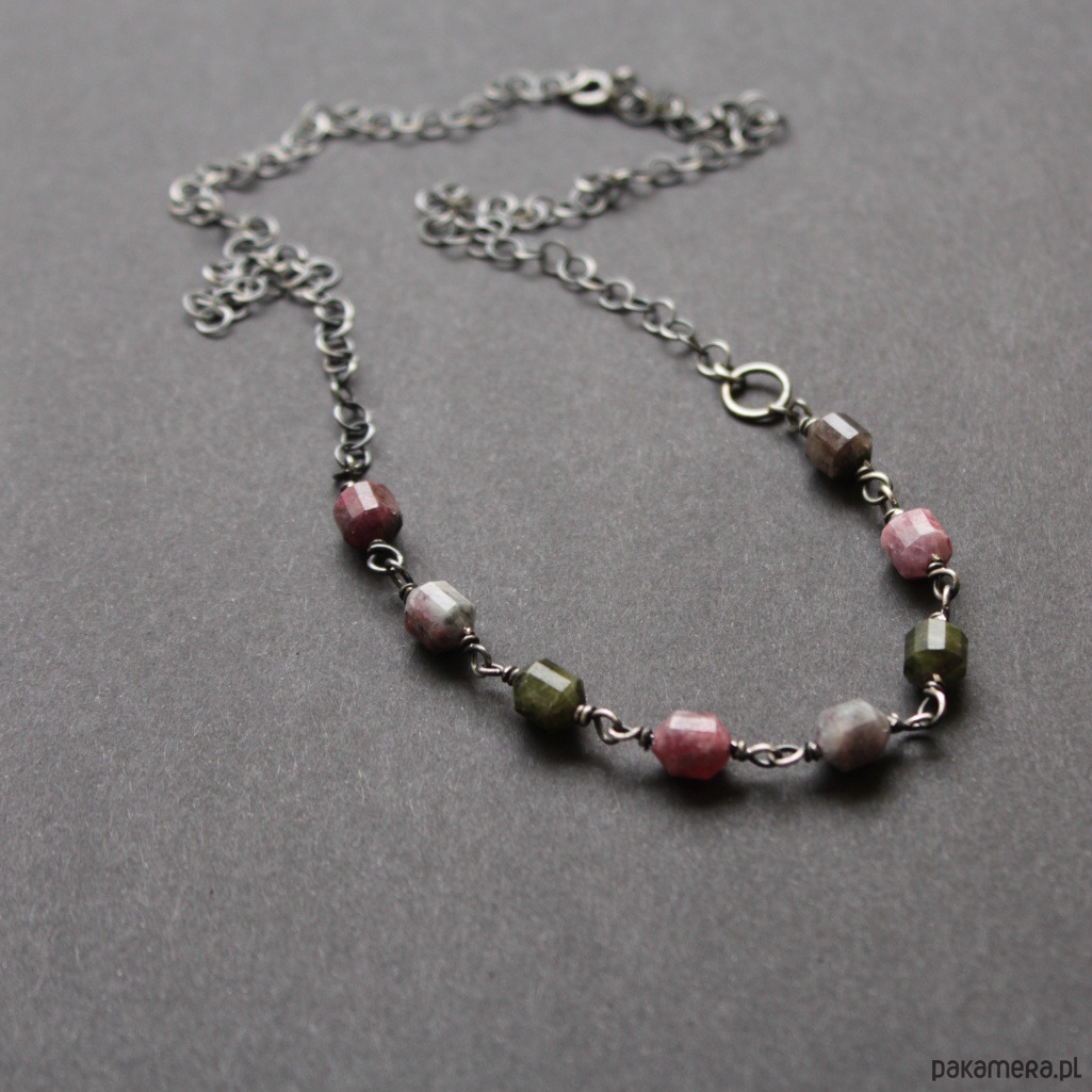 Naszyjnik wykonany został z oksydowanego srebra próby 925 oraz fasetowanych bryłek turmalinów wielkości 0,8 cm.