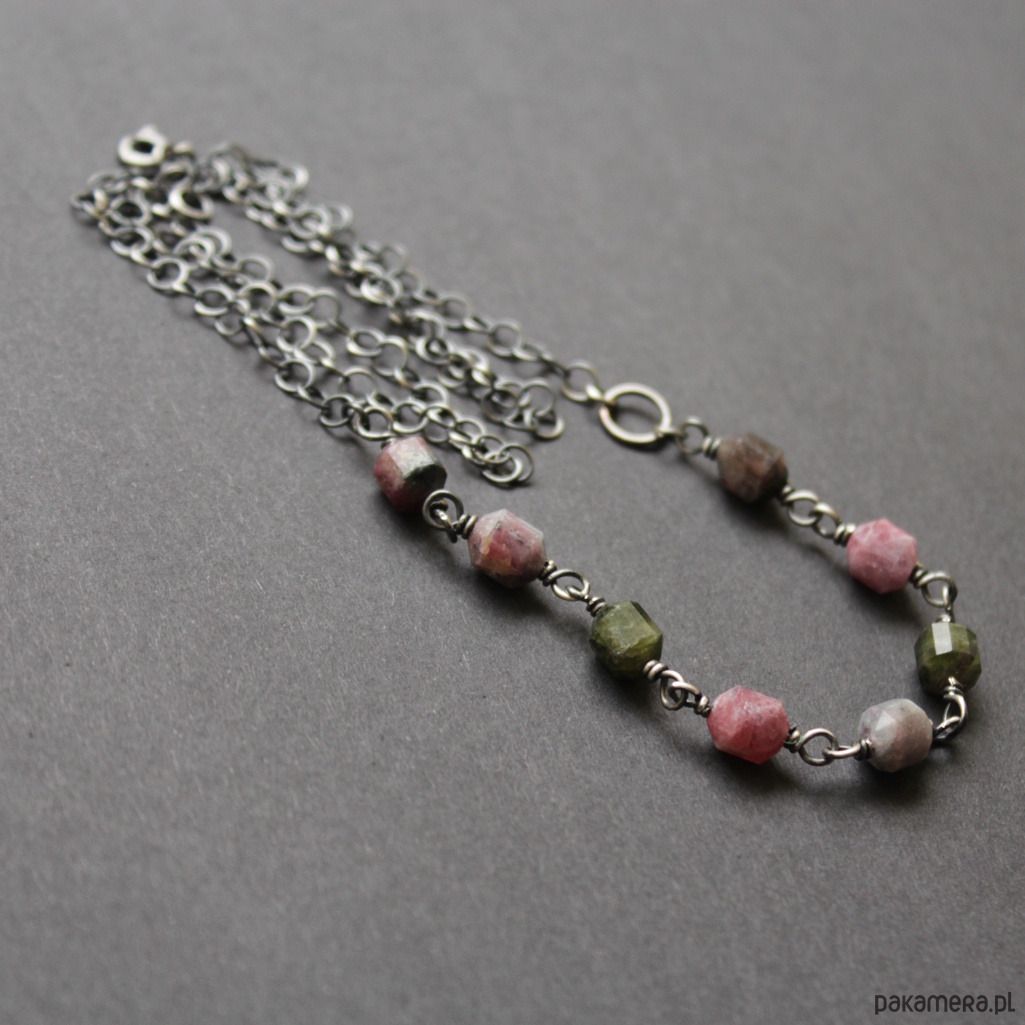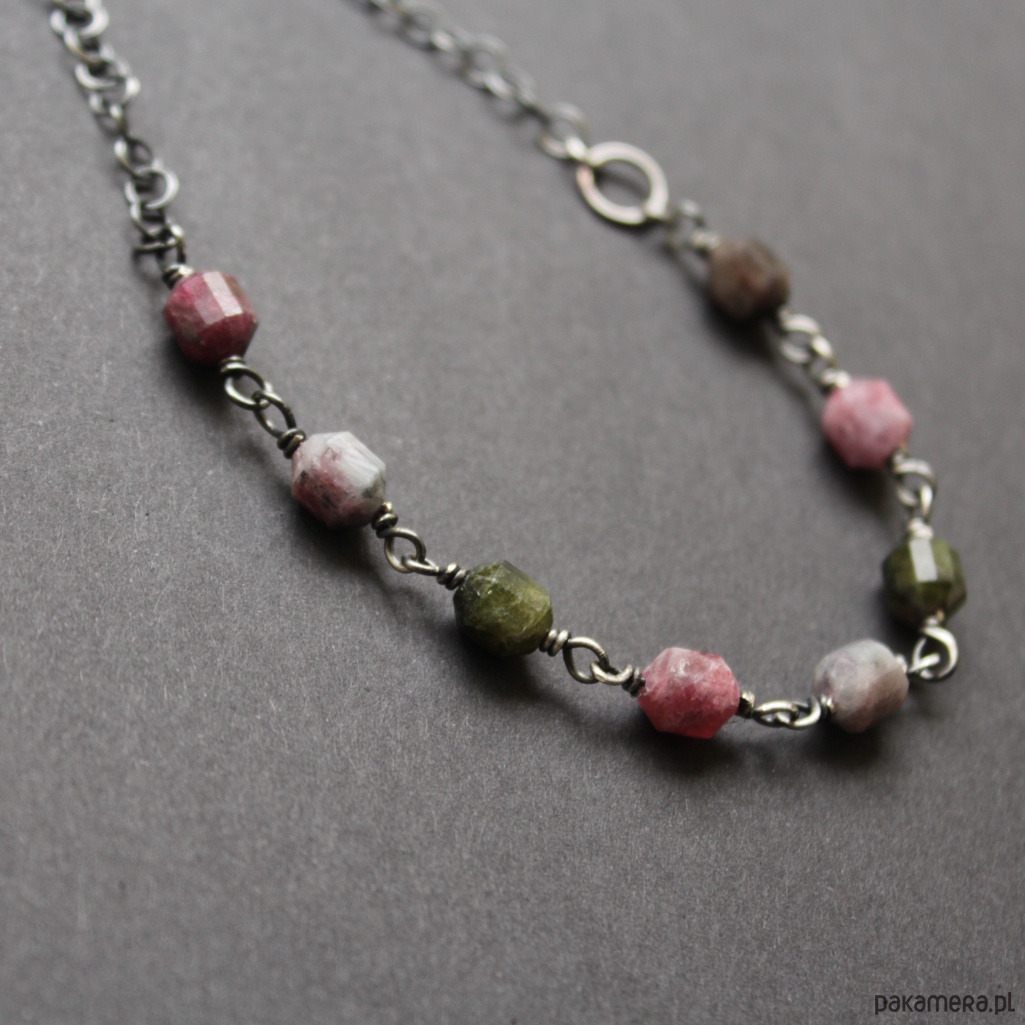 Naszyjnik wykonany został z oksydowanego srebra próby 925 oraz fasetowanych bryłek turmalinów wielkości 0,8 cm.