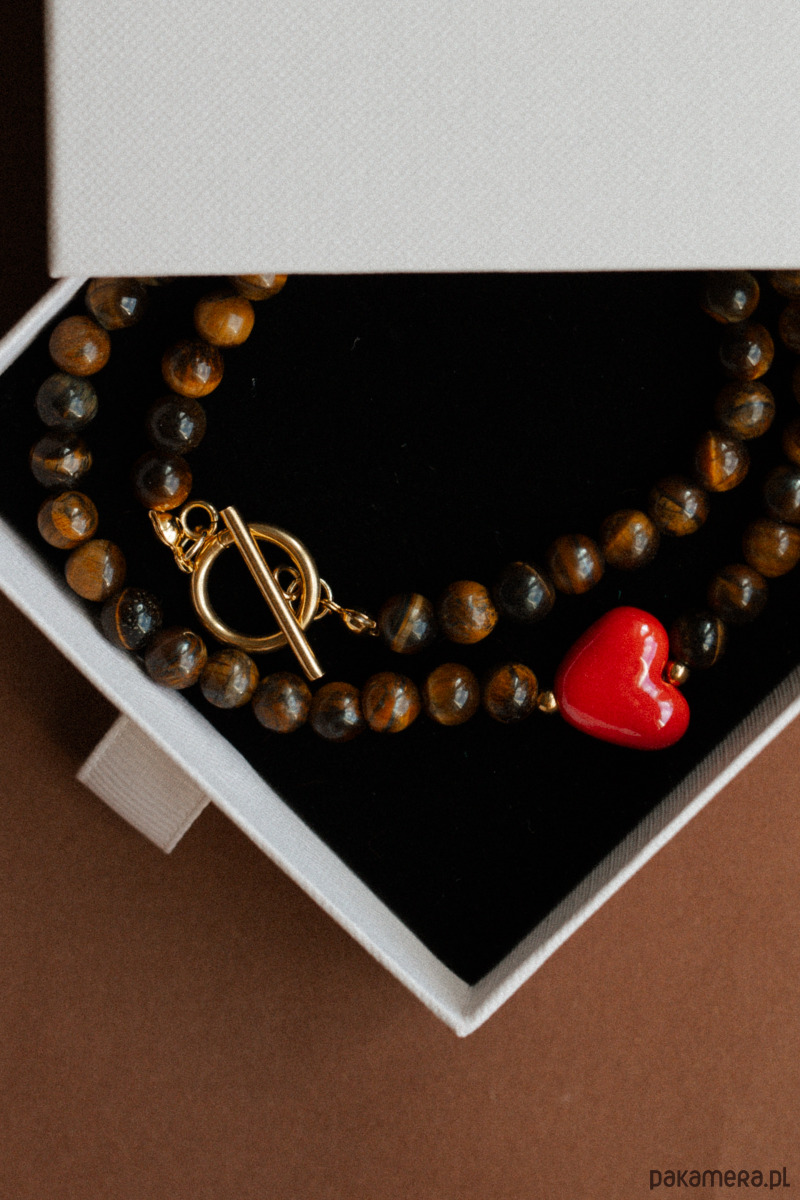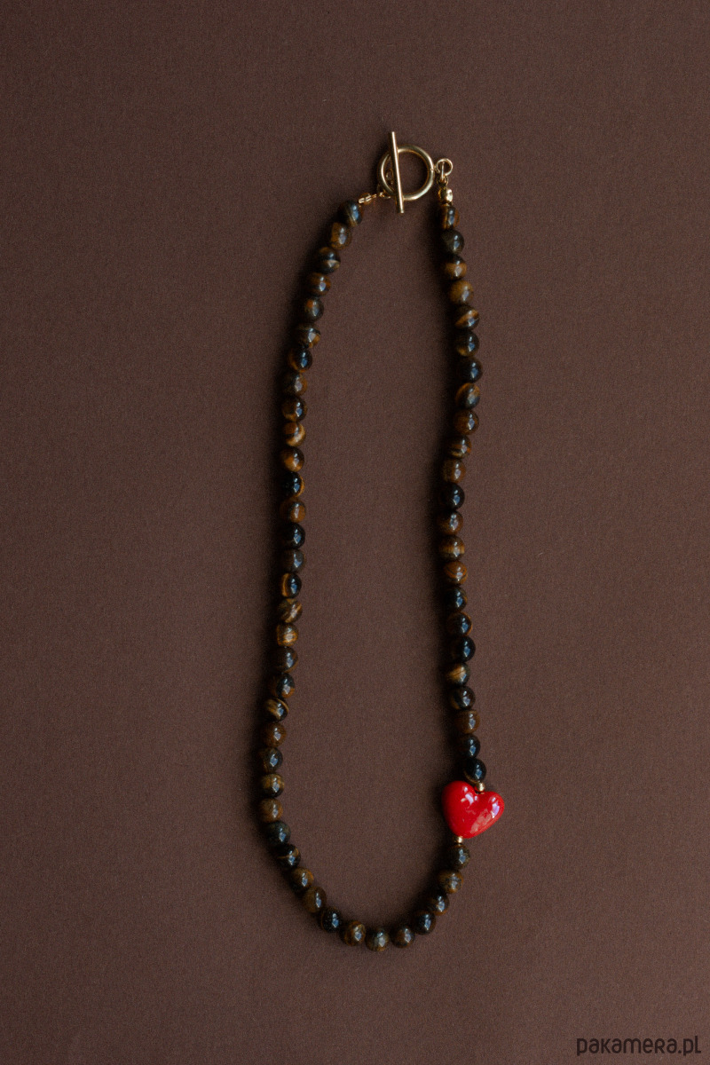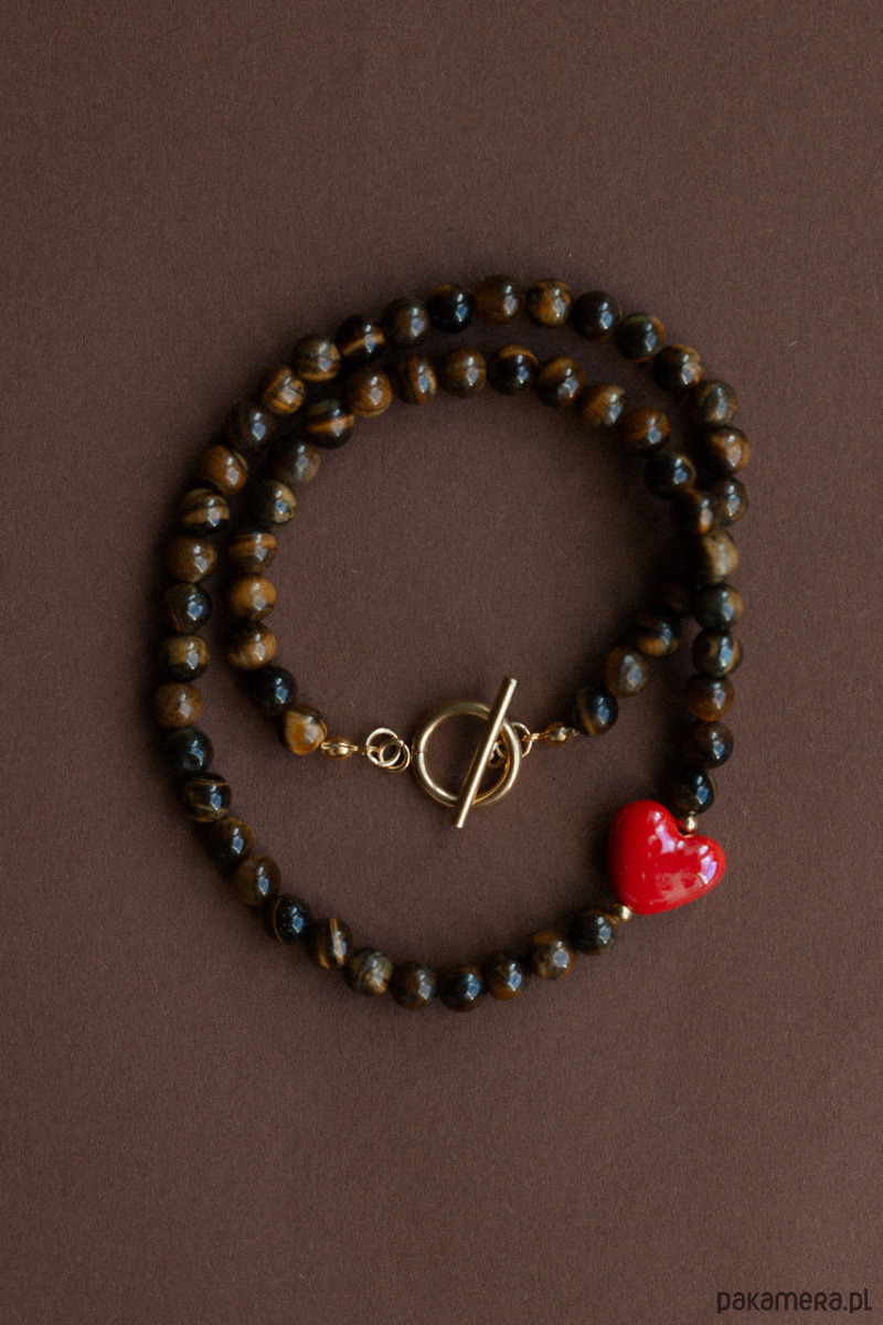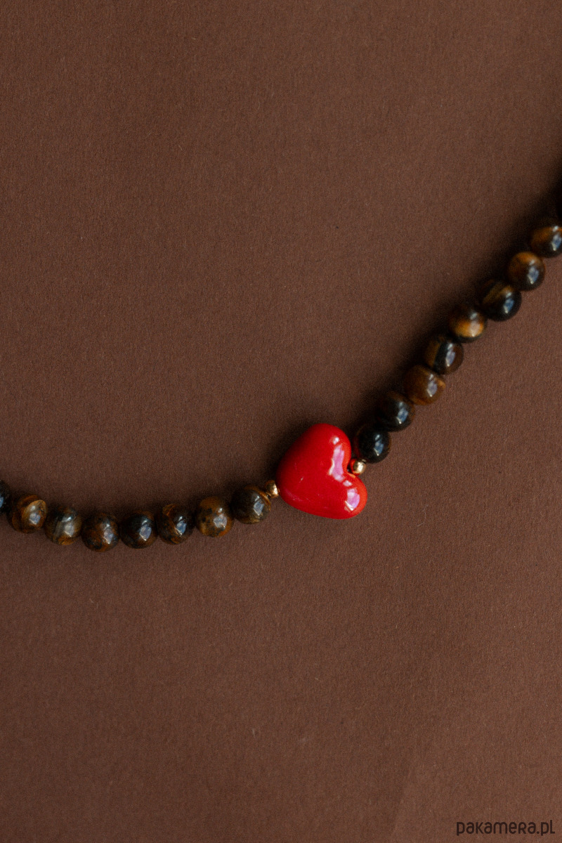 Naszyjnik wykonany z kamieni naturalnych (tygrysie oko) wykończony ceramicznym sercem w pięknej czerwieni.