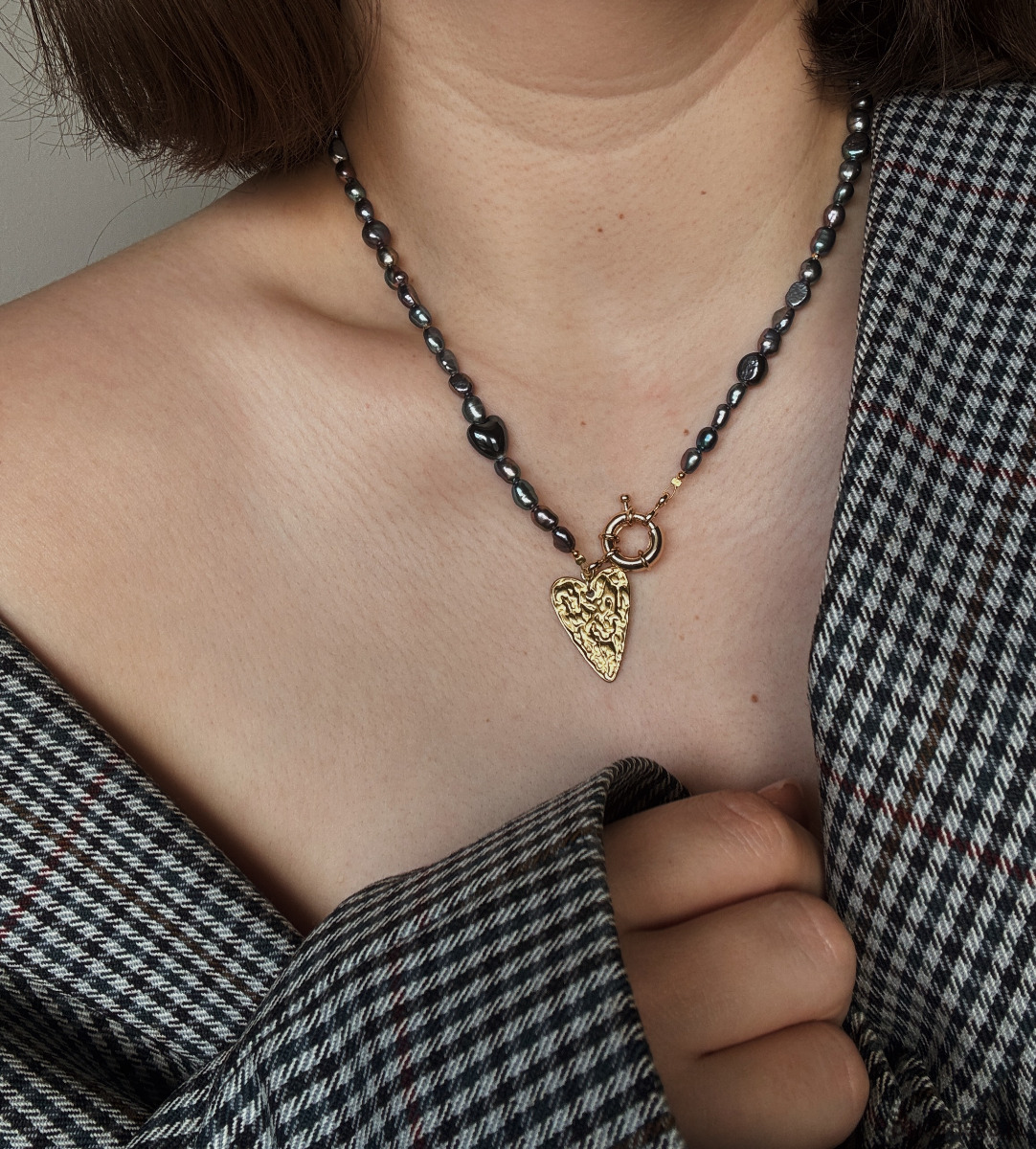 Naszyjnik wykonany jest z pereł naturalnych, zapięcia z mosiądzu pozłacanego 18K złotem oraz zawieszki rodowanej 18K złotem.