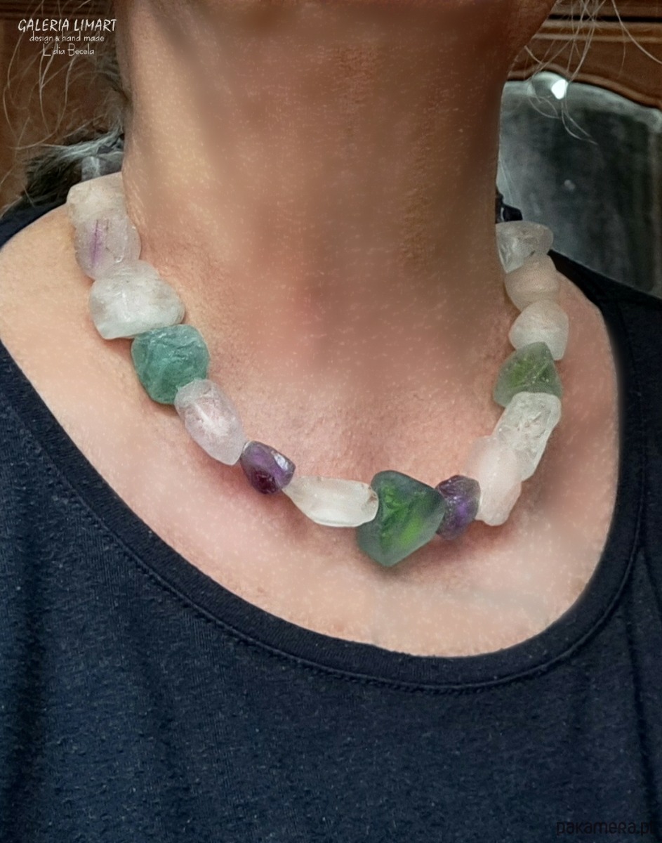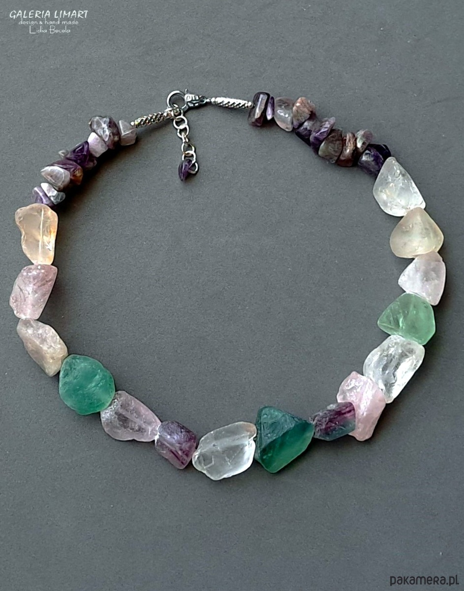 Lubisz styl vintage i biżuterię o jaką w obecnych czasach coraz trudniej? Jeśli tak to polecam ten uroczy i niezwyczajny, bardzo efektowny masywny naszyjnik. Bryłki surowych naturalnych minerałów takich jak: fluoryt, ametyst, kryształ górski i kwarc różowy zostały staranie dobranie kolorystycznie i wielkościowo tworząc niebanalną kolię. To uroczy, raczej minimalistyczny, ale bardzo wyrazisty i szalenie efektowny naszyjnik, to kobieca, utrzymana w duchu vintage, ozdoba.
