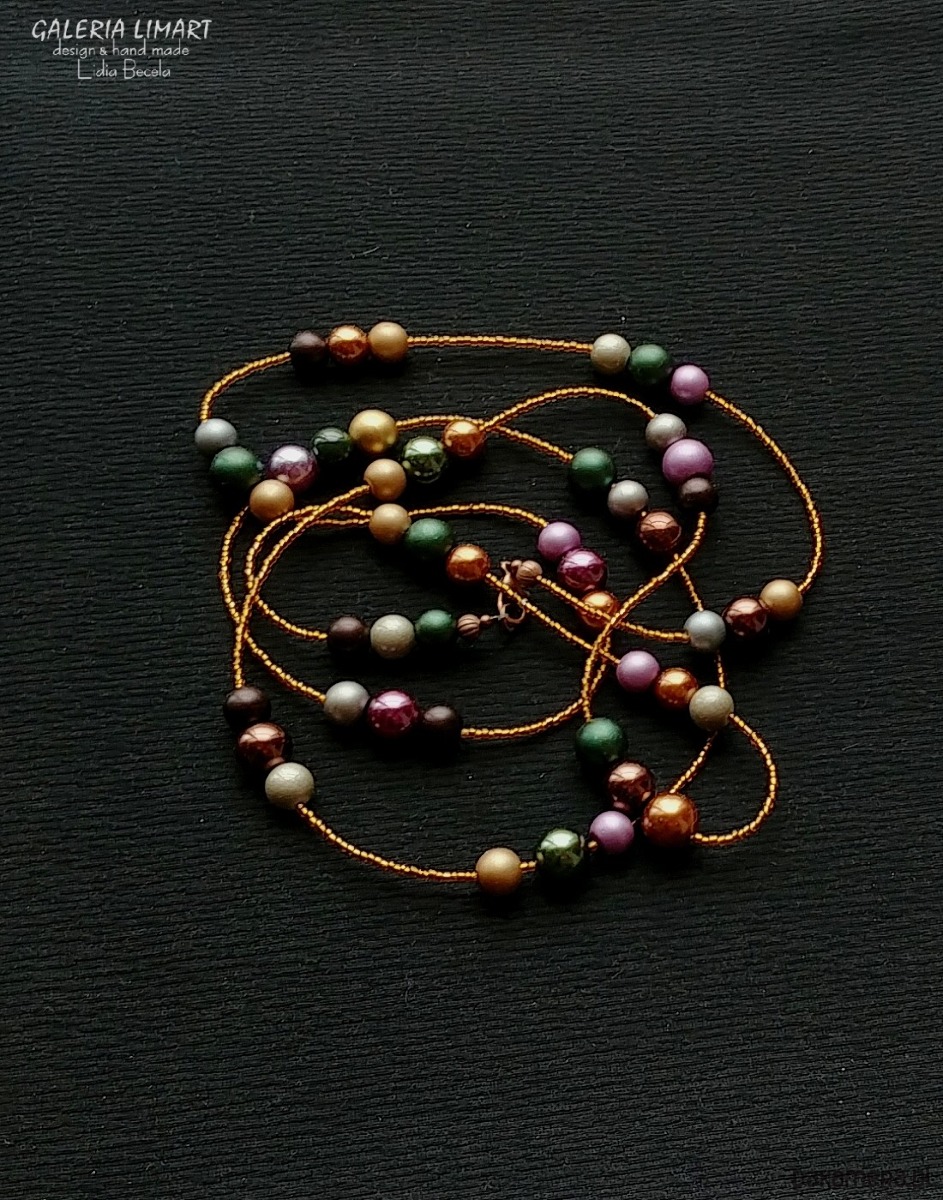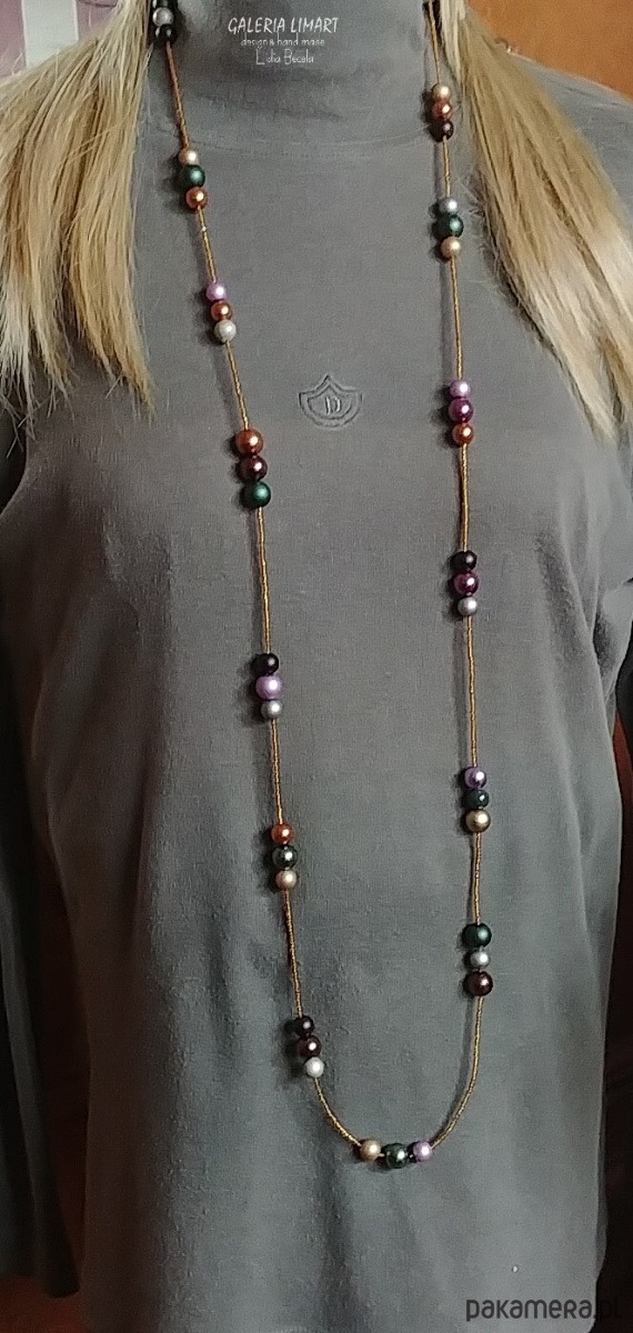 Autorska niebanalna kompozycja mixu bajecznie kolorowych szklanych pereł o różnych wymiarach i odcieniach utrzymanych w pięknych kolorach jesieni przeplecionych z dopasowanymi kolorystycznie drobniutkimi szklanymi koralikami (see beads). Powstał niezwyczajny i ogromnie efektowny, kolorystycznie niebanalny naszyjnik. Długość ok 140 cm, co pozwala dzięki zapięciu owinąć naszyjnik nawet trzykrotnie wokół szyi. Utrzymany w modnym stylu boho.