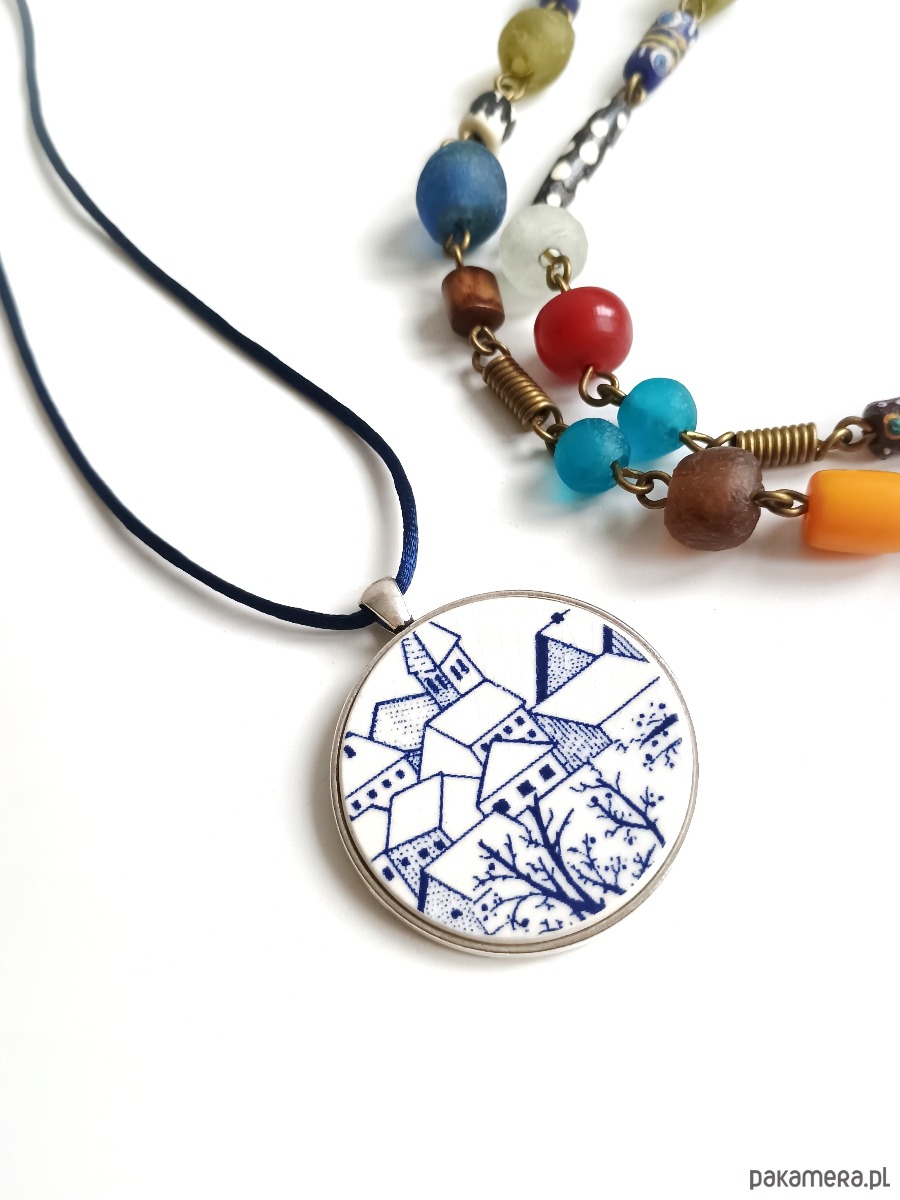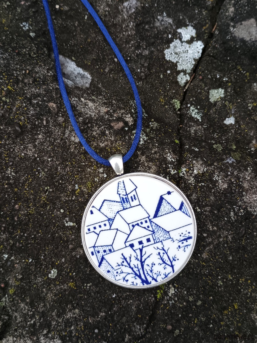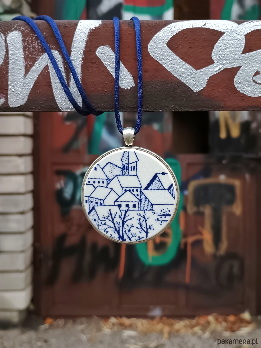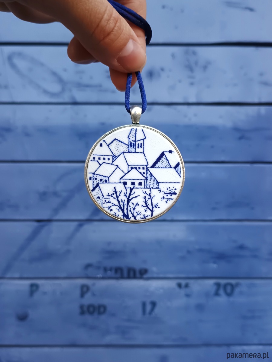 Wyjątkowy naszyjnik, który wykoanałam z fragmentu stłuczonego talerza z zimowym pejzażem. Fragment oszlifowałam w okrągły kształt i osadziłam w metalowej bazie w kolorze srebrnym. Ceramikę zeszlifowałam również z grubości - jest cieńsza niż pierwotnie, dzięki czemu wisior nie jest masywny. Brzegi pokryłam lakierem, co sprawia, że nie brudzą się i nie chłoną wilgoci. Do zawieszki dobrałam satynowy sznureczek w kolorze granatowym. Średnica elementu ceramicznego: 45 mm. Długość sznureczka w całości: ok. 80 cm (naszyjnik zakłada się przez głowę). Sznurek łatwo skrócić lub dobrać swój ulubiony rzemień lub łańcuszek. Upcykling - nie reprodukuję wykorzystywanych wzorów, niczego nie domalowuję - wykorzystuję wyłącznie oryginalne naczynia i motywy, które się na nich znajdują. Tym samym, stłuczce z odzysku nadaję nowe życie.