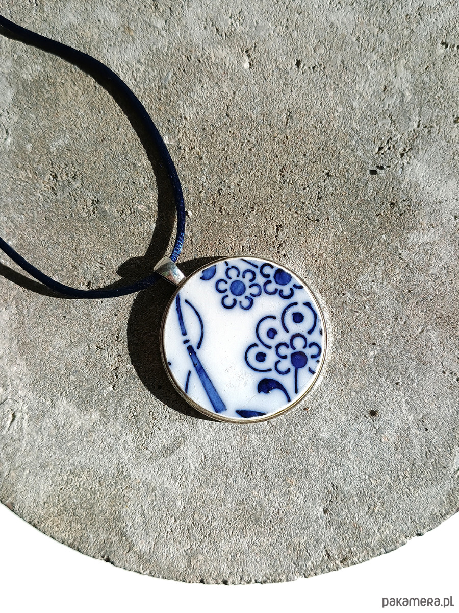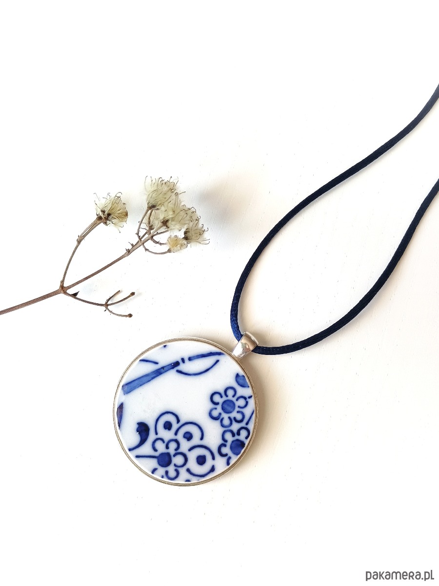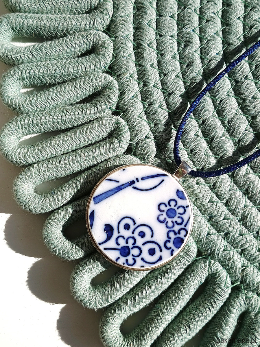 Oto naszyjnik, który wykonałam z fragmentu stłuczonego talerza fajansowego w kobaltowe wzory. Fragment oszlifowałam w okrągły kształt i osadziłam w metalowej bazie w kolorze srebrnym. Ceramikę zeszlifowałam również z grubości - jest cieńsza niż pierwotnie, dzięki czemu wisior nie jest masywny. Brzegi pokryłam lakierem, co sprawia, że nie brudzą się i nie chłoną wilgoci. Do zawieszki dobrałam satynowy sznureczek w kolorze granatowym. Średnica elementu ceramicznego: 40 mm. Długość sznureczka w całości: ok. 80 cm (naszyjnik zakłada się przez głowę). Sznurek łatwo skrócić lub dobrać swój ulubiony rzemień lub łańcuszek. Upcykling - nie reprodukuję wykorzystywanych wzorów, niczego nie domalowuję - wykorzystuję wyłącznie oryginalne naczynia i motywy, które się na nich znajdują. Tym samym, stłuczce z odzysku nadaję nowe życie.