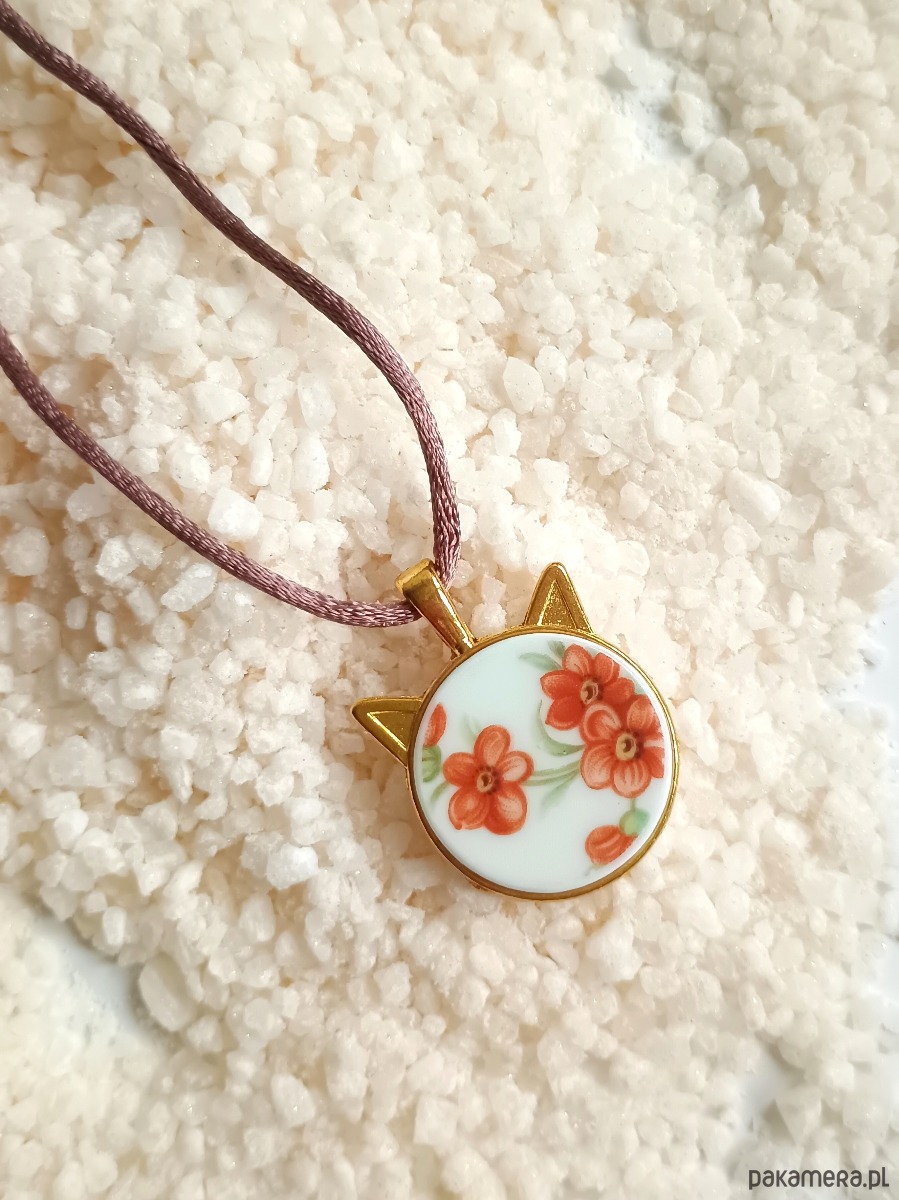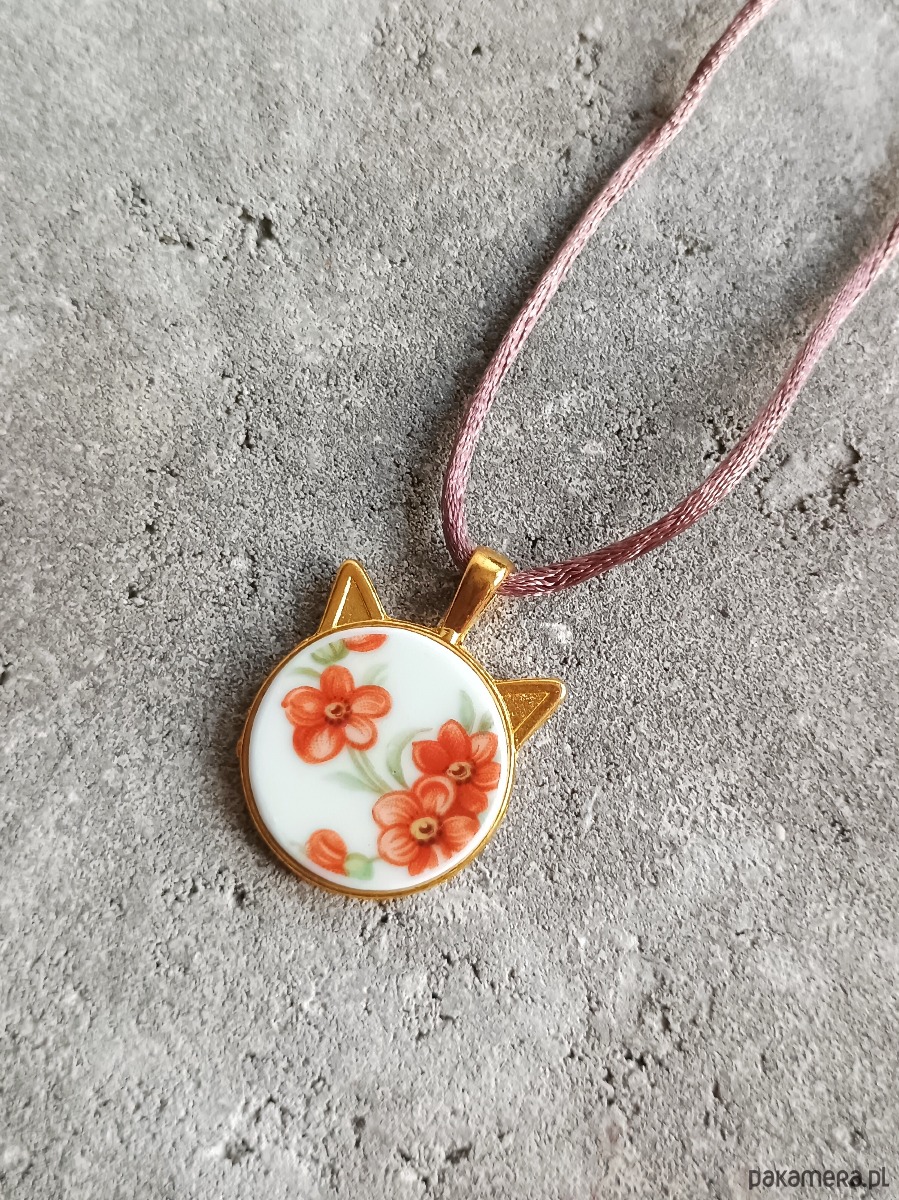 Wyjątkowy naszyjnik, który wykoanałam z fragmentu stłuczonego talerza we wzory kwiatowe. Fragment oszlifowałam w okrągły kształt i osadziłam w metalowej bazie z kocimi uszami w kolorze złotym. Ceramikę zeszlifowałam również z grubości - jest cieńsza niż pierwotnie, dzięki czemu wisior nie jest masywny. Brzegi pokryłam lakierem, co sprawia, że nie brudzą się i nie chłoną wilgoci. Do zawieszki dobrałam satynowy sznureczek w kolorze brązowym. Średnica elementu ceramicznego: 25 mm. Długość sznureczka w całości: ok. 80 cm (naszyjnik zakłada się przez głowę). Sznurek łatwo skrócić lub dobrać swój ulubiony rzemień lub łańcuszek. Upcykling - nie reprodukuję wykorzystywanych wzorów, niczego nie domalowuję - wykorzystuję wyłącznie oryginalne naczynia i motywy, które się na nich znajdują. Tym samym, stłuczce z odzysku nadaję nowe życie.