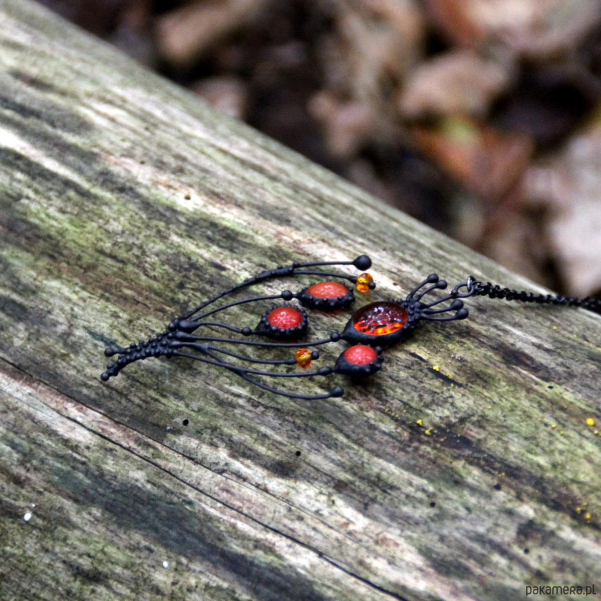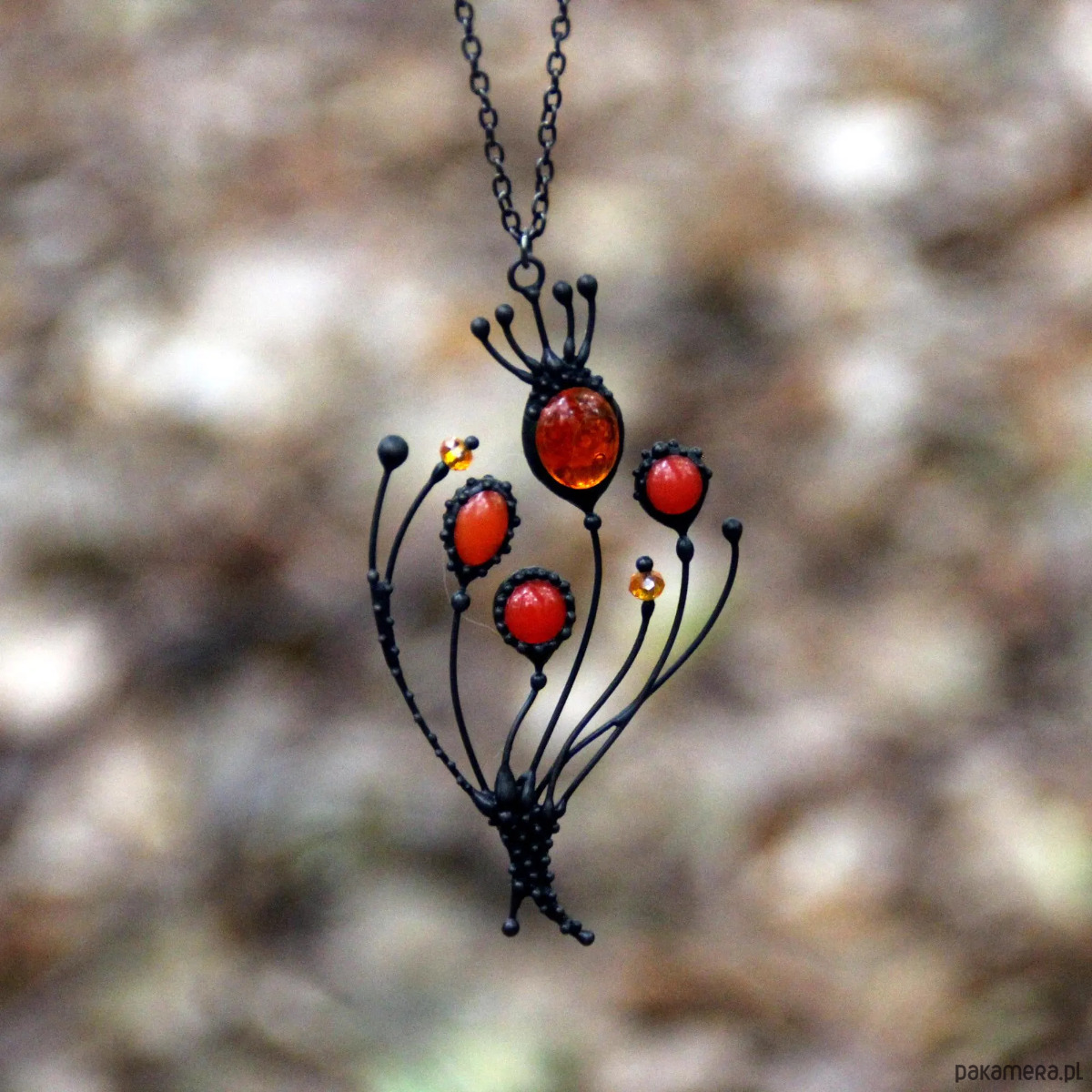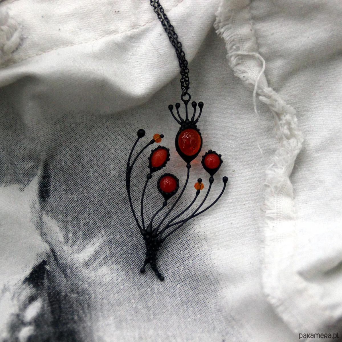 Naszyjnik w stylu boho z motywem dzikich maków i czerwonym szkłem