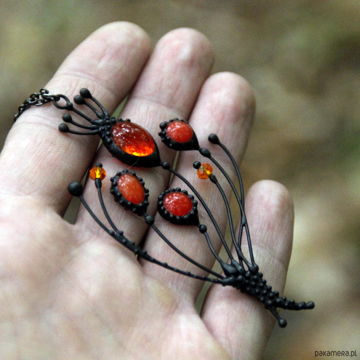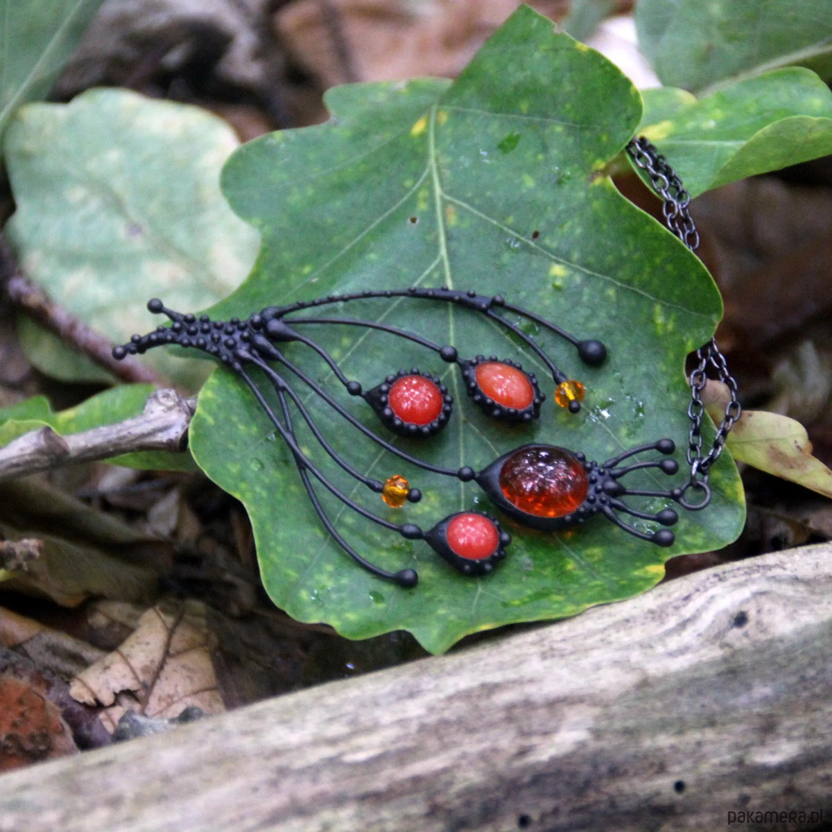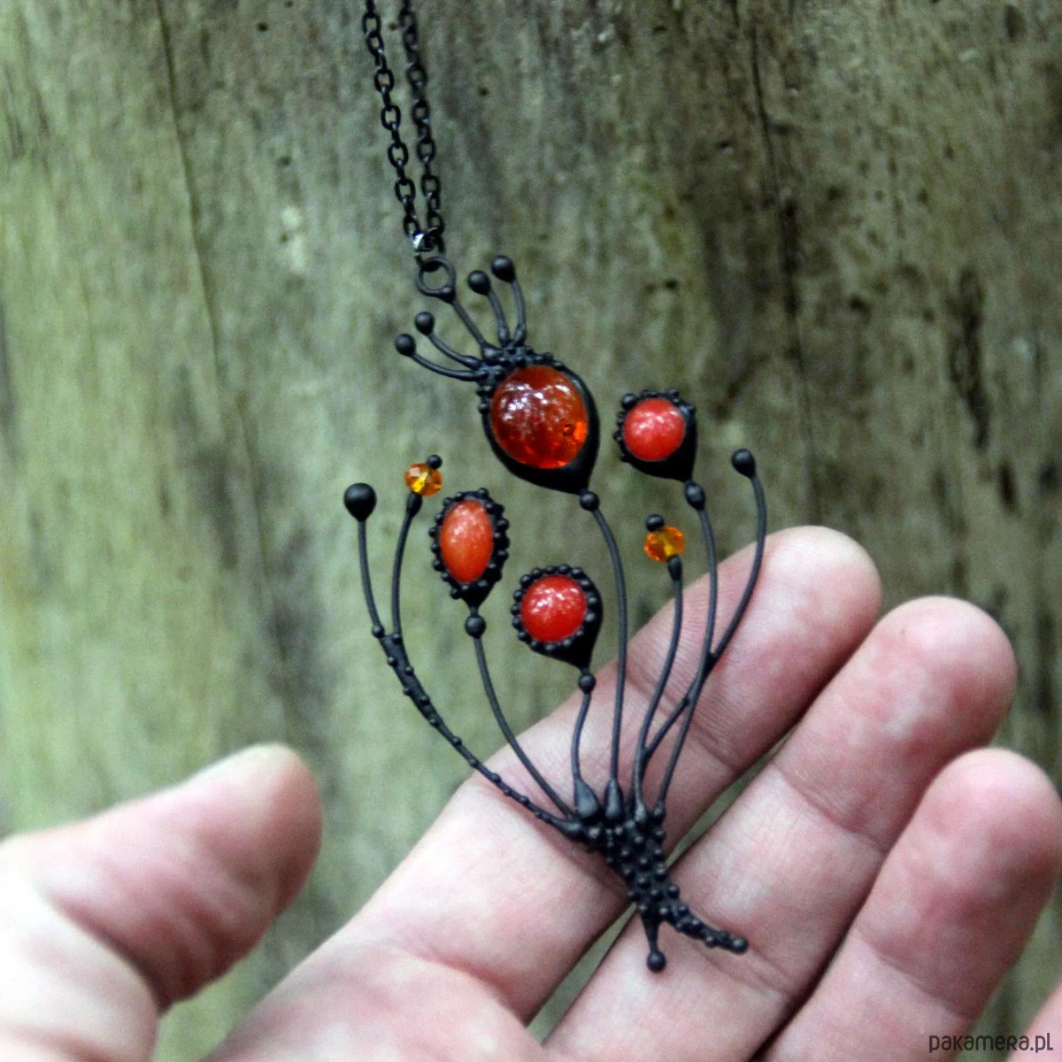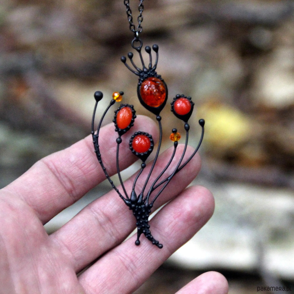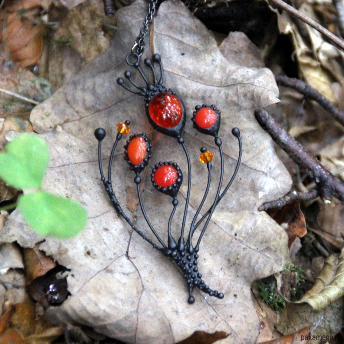 Naszyjnik z witrażowymi polnymi kwiatami i czerwonym makiem, wykonany ręcznie z miedzi, stopu cyny, stali i czerwonego szkła. Pokryty środkiem przeciwutleniającym. Naszyjnik jest lekki i wytrzymały. Wszystkie elementy są wykonane ręcznie, co zapewnia indywidualność każdego produktu wytworzonego w warsztacie Yadovito. Stop cyny i miedzi pokryty jest czarną patyną, wypolerowany roztworem wykończeniowym, aby nadać biżuterii szlachetny wygląd, a jednocześnie zapobiec utlenianiu się metalu. Wyjątkowy prezent dla kobiety – kwiatowy wisiorek botaniczny.Rozmiar około 4/7 cm. Kolor czarny/czerwony.