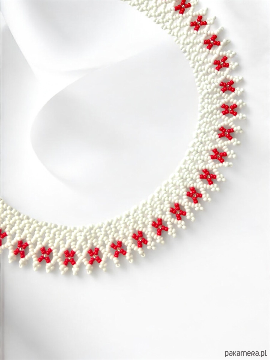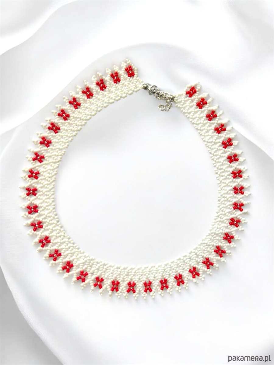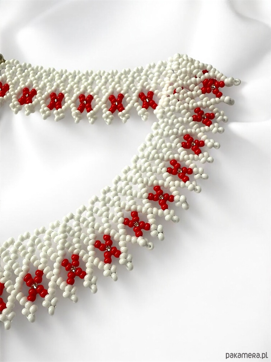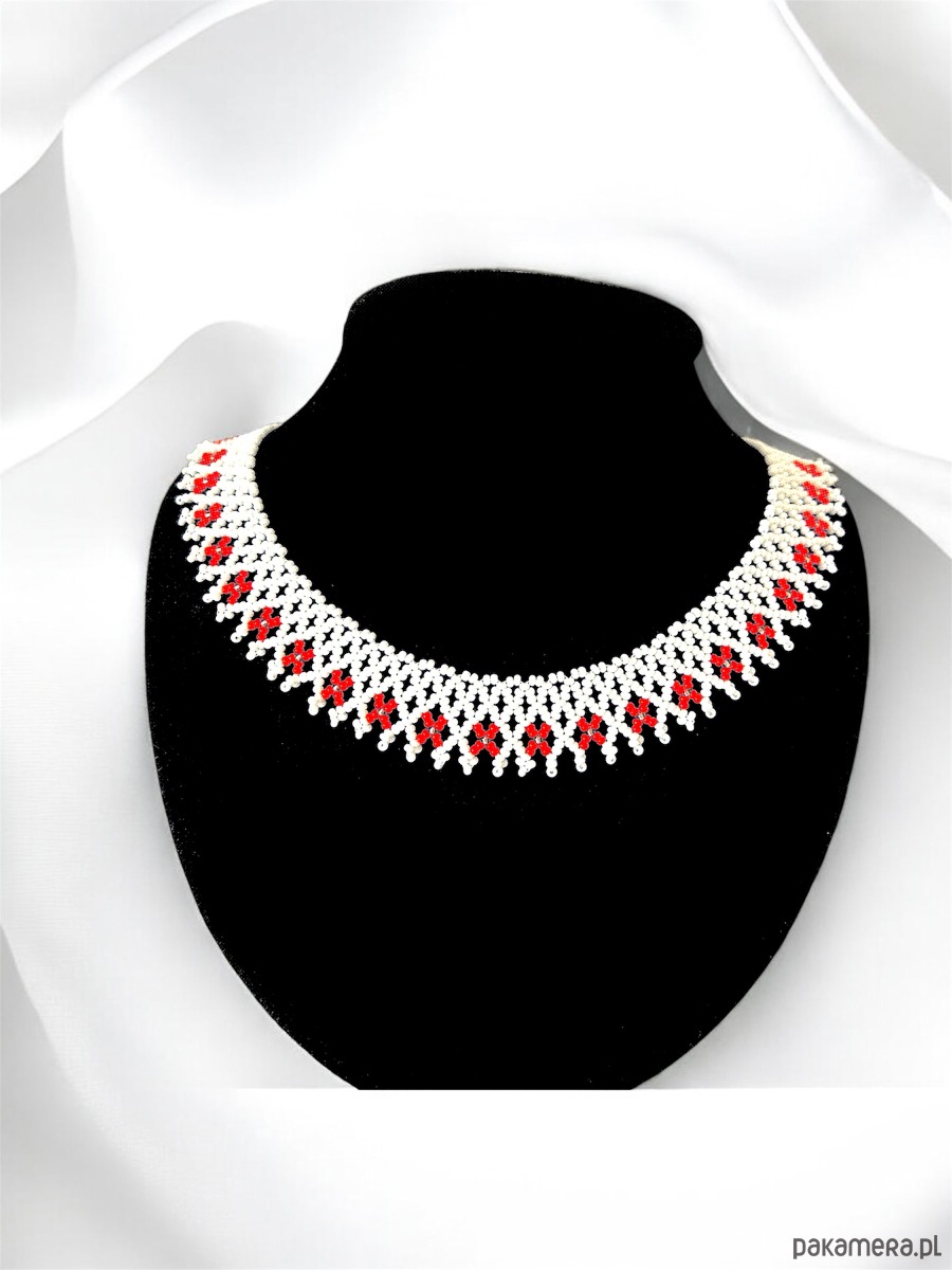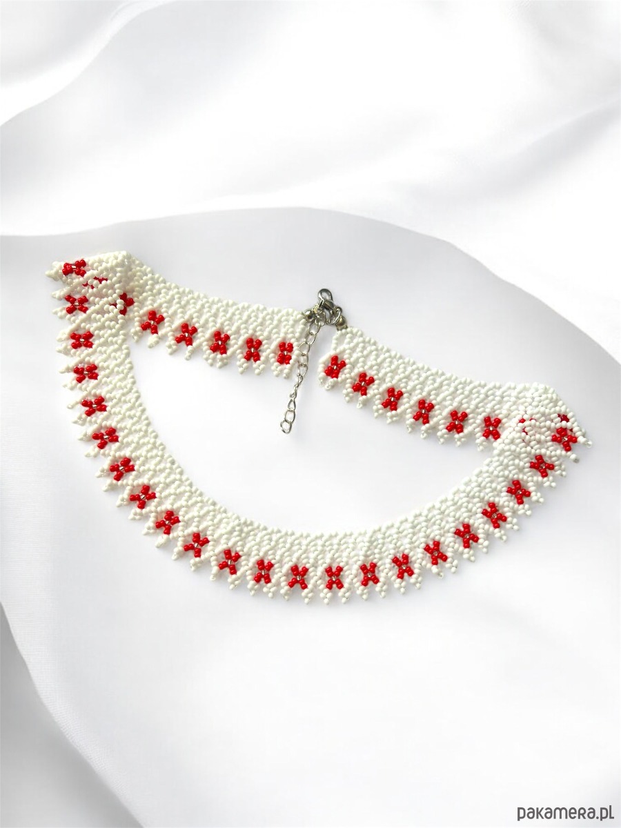 Ręcznie wykonany naszyjnik z koralików w stylu Lemko i Huculskim. Minimalistyczna, ludowa ozdoba w biało-czerwonej kolorystyce.