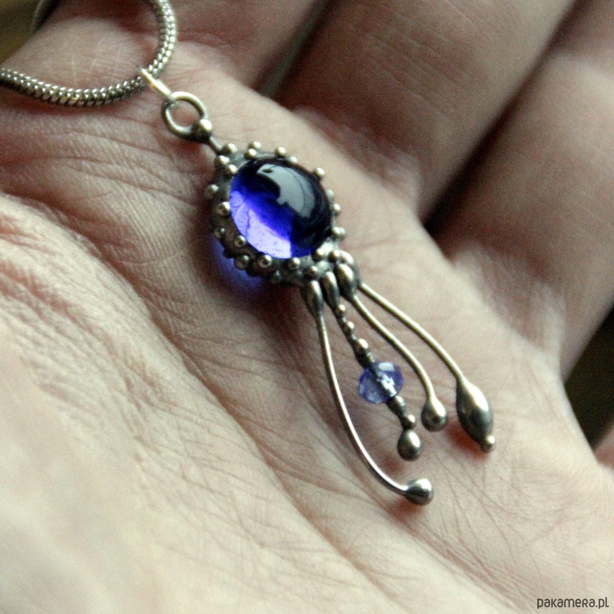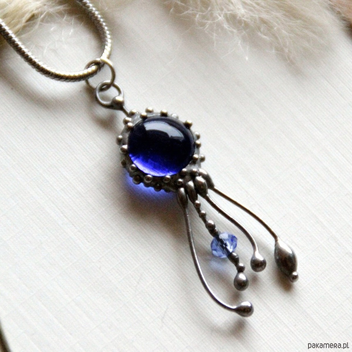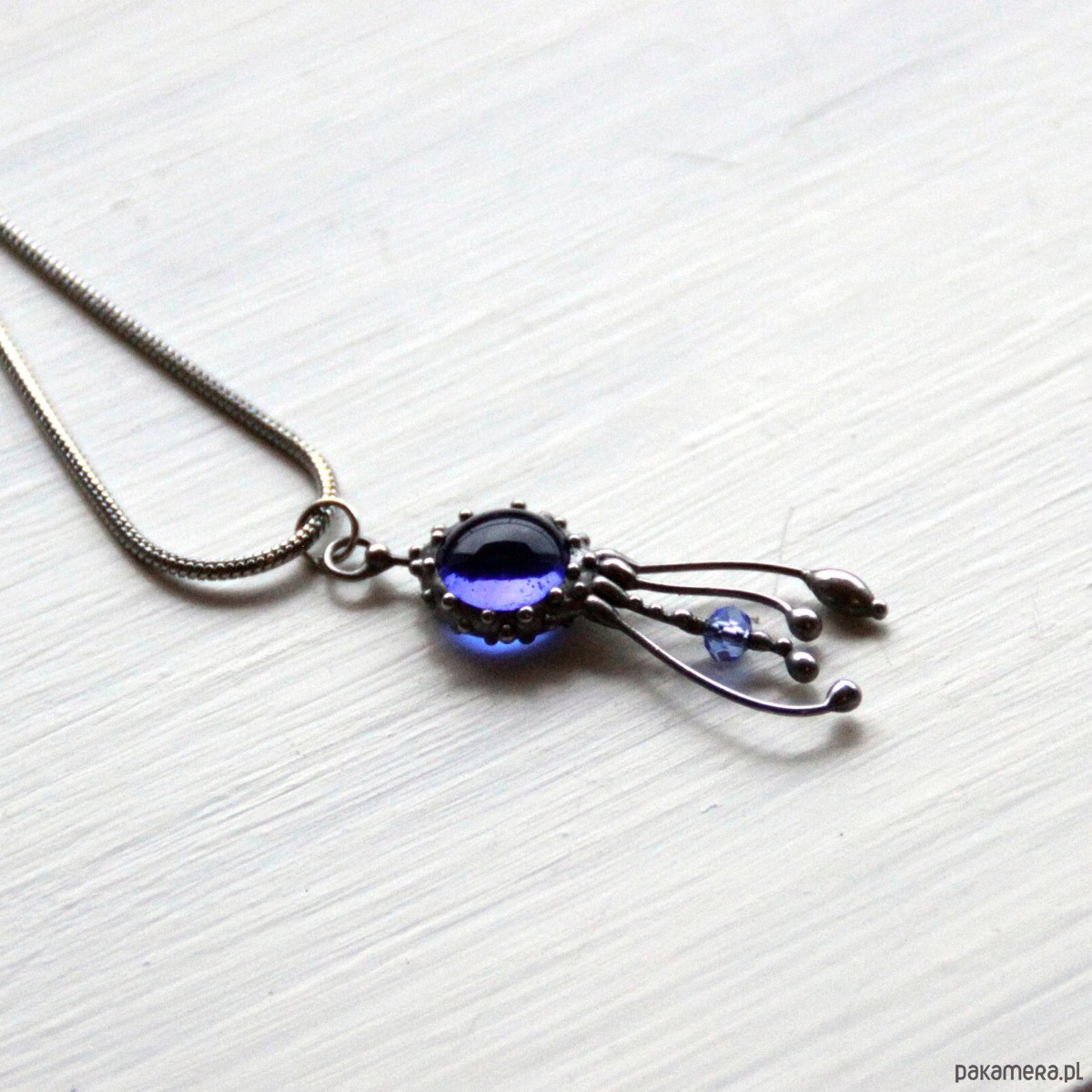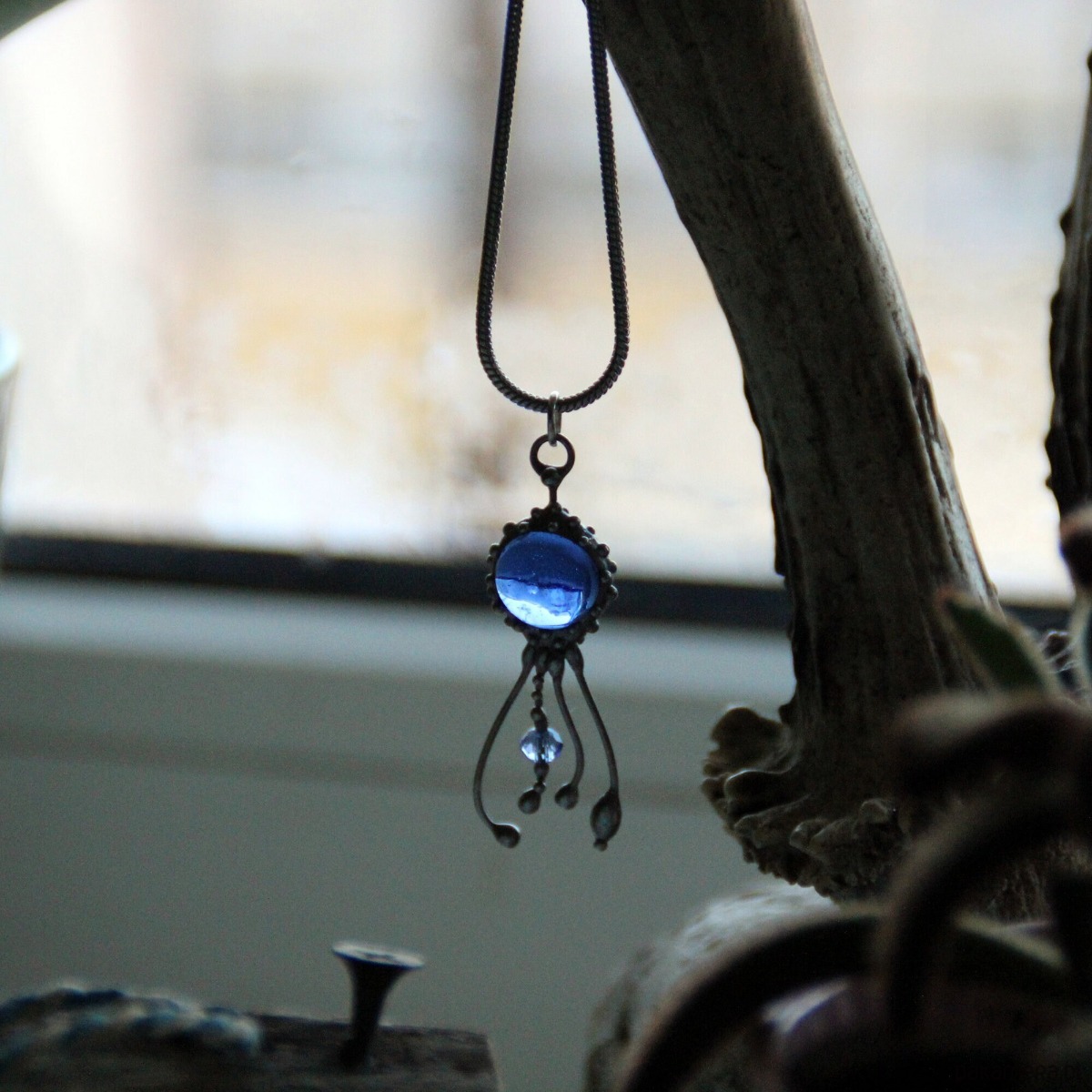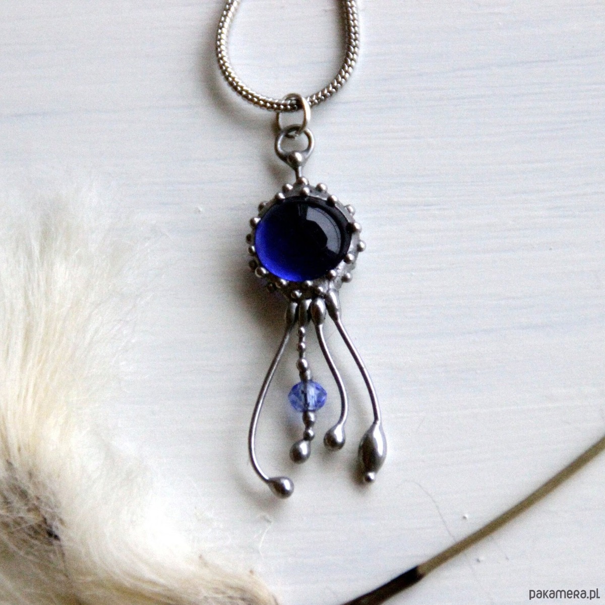Naszyjnik z witrażem przedstawiającym psychodeliczne stworzenia w kształcie meduz, wykonany ręcznie z miedzi, stopu cyny, cyny, stali i niebieskiego szkła. Wisiorek jest lekki i wystarczająco wytrzymały. Wszystkie elementy są wykonane ręcznie, co zapewnia indywidualność każdego produktu wytworzonego w warsztacie Yadovito. Stop cyny i miedzi jest polerowany roztworem wykończeniowym, aby nadać biżuterii szlachetny wygląd, a jednocześnie zapobiec utlenianiu się metalu. Rozmiar około 4/1 cm. Kolor srebrny/niebieski.