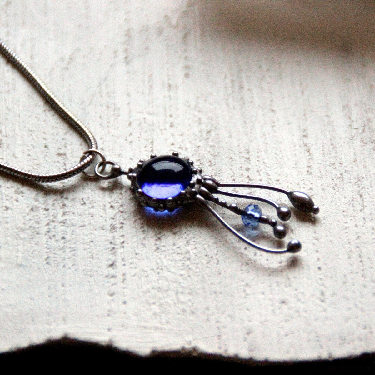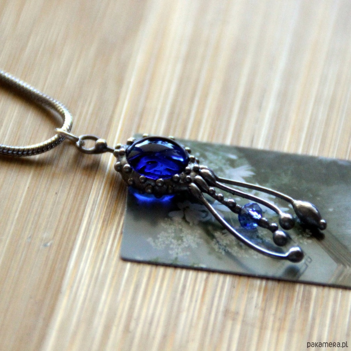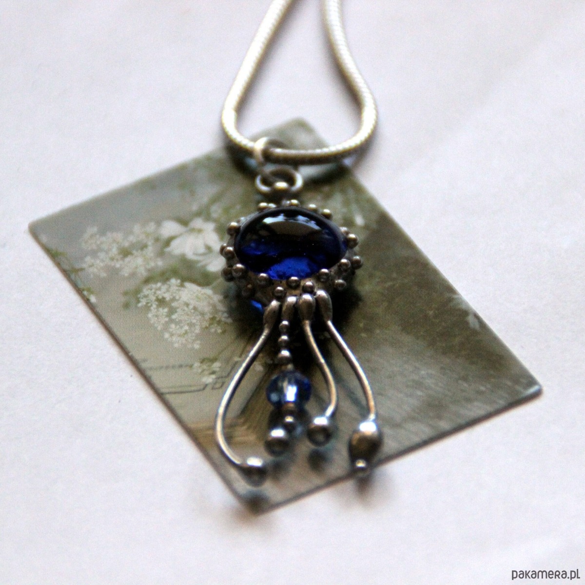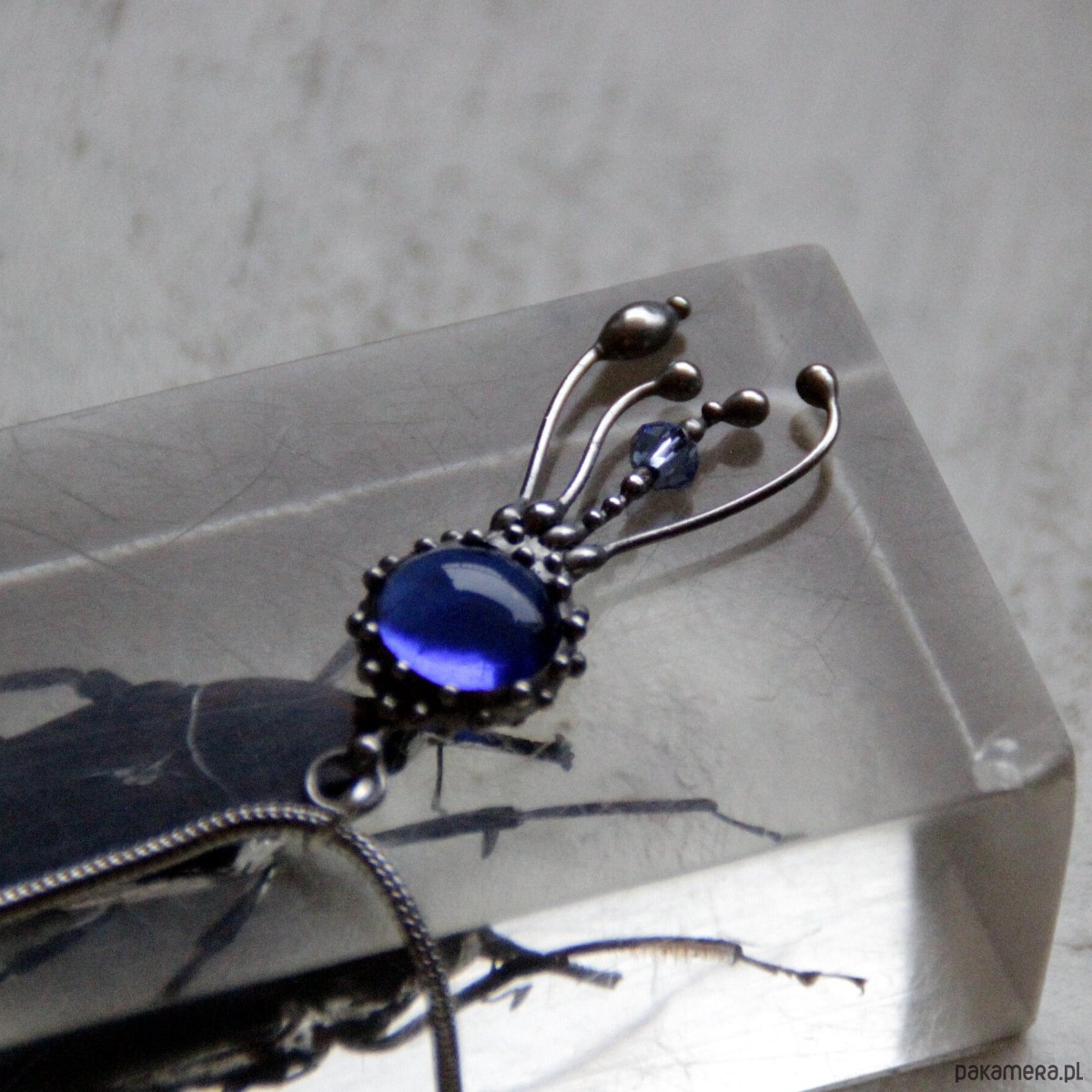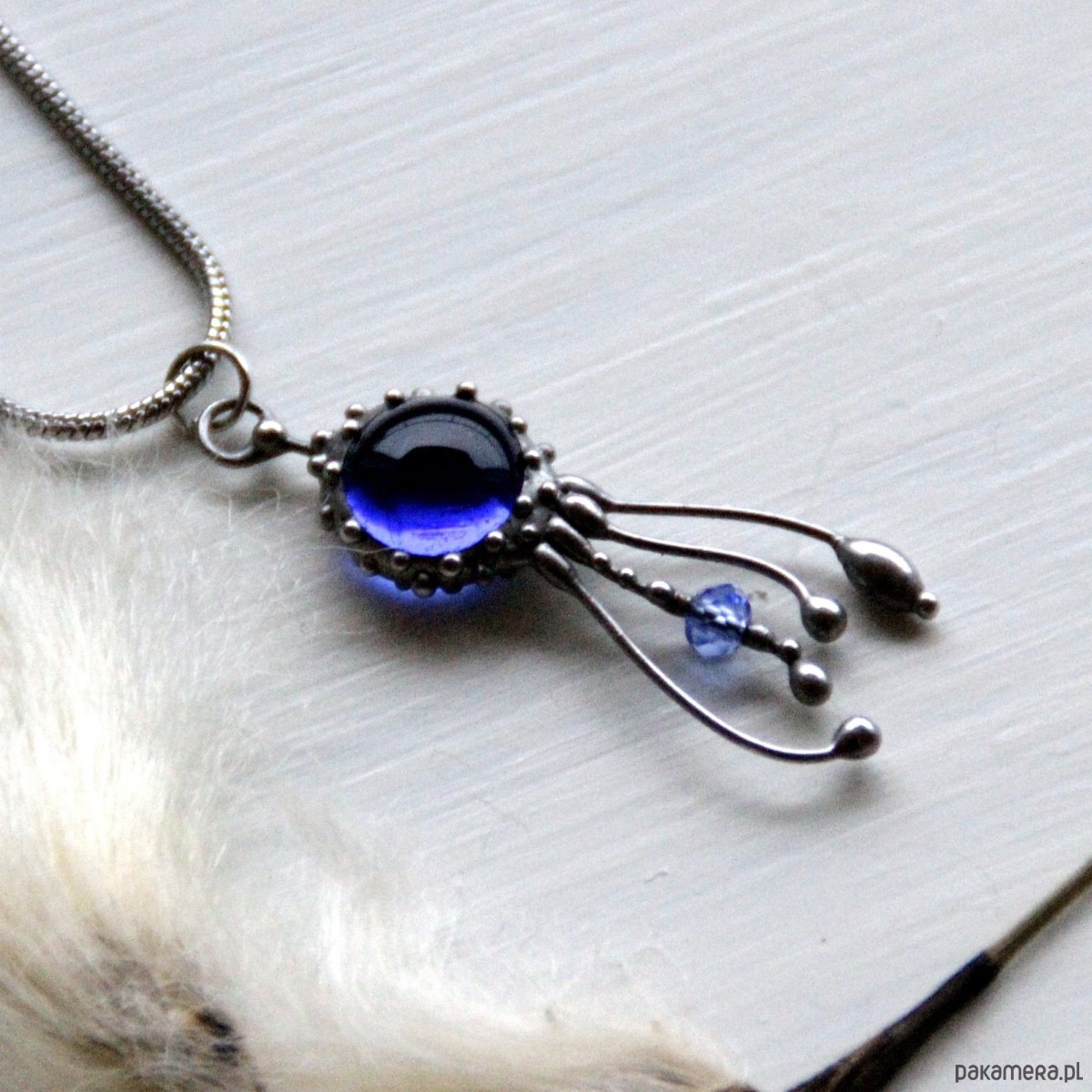 Naszyjnik z witrażem przedstawiającym psychodeliczne stworzenia w kształcie meduz, wykonany ręcznie z miedzi, stopu cyny, cyny, stali i niebieskiego szkła. Wisiorek jest lekki i wystarczająco wytrzymały. Wszystkie elementy są wykonane ręcznie, co zapewnia indywidualność każdego produktu wytworzonego w warsztacie Yadovito. Stop cyny i miedzi jest polerowany roztworem wykończeniowym, aby nadać biżuterii szlachetny wygląd, a jednocześnie zapobiec utlenianiu się metalu. Rozmiar około 4/1 cm. Kolor srebrny/niebieski.