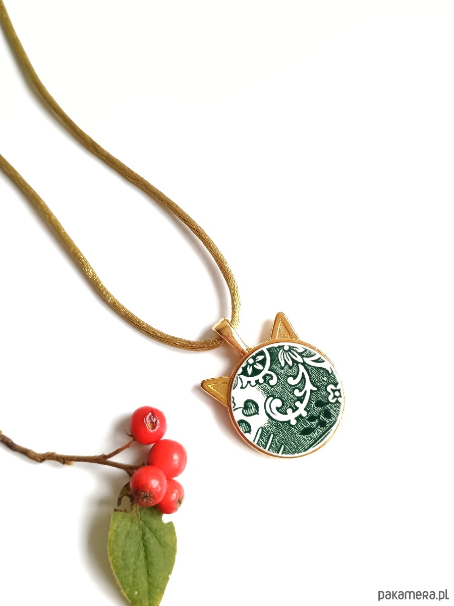Wyjątkowy naszyjnik, który wykoanałam z fragmentu stłuczonego talerza Villeroy & Boch Burgenland w zielone wzory. Fragment oszlifowałam w okrągły kształt i osadziłam w metalowej bazie w kształcie kota w kolorze złotym. Ceramikę zeszlifowałam również z grubości - jest cieńsza niż pierwotnie, dzięki czemu wisior nie jest masywny. Brzegi pokryłam lakierem, co sprawia, że nie brudzą się i nie chłoną wilgoci. Do zawieszki dobrałam satynowy sznureczek w kolorze zielonym. Średnica elementu ceramicznego: 25 mm. Długość sznureczka w całości: ok. 80 cm (naszyjnik zakłada się przez głowę). Sznurek łatwo skrócić lub dobrać swój ulubiony rzemień lub łańcuszek. Upcykling - nie reprodukuję wykorzystywanych wzorów, niczego nie domalowuję - wykorzystuję wyłącznie oryginalne naczynia i motywy, które się na nich znajdują. Tym samym, stłuczce z odzysku nadaję nowe życie.