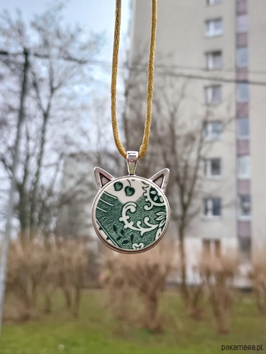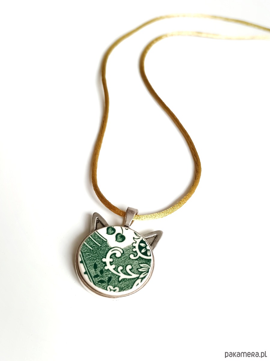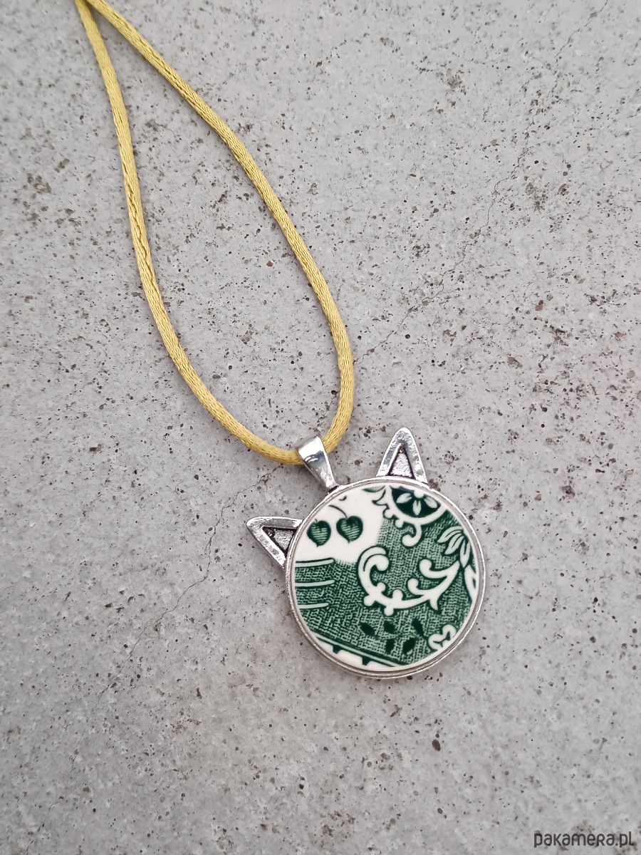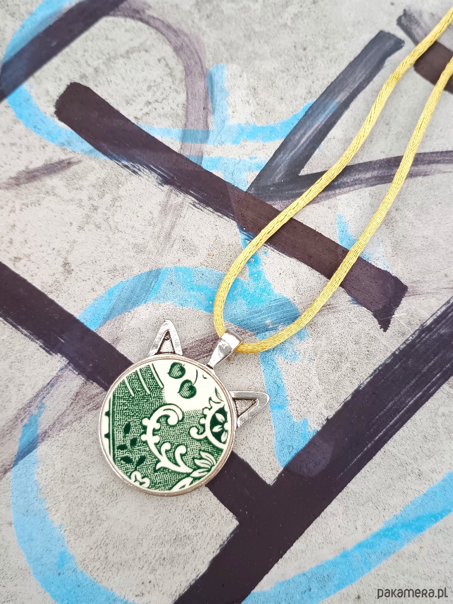 Wyjątkowy naszyjnik, który wykoanałam z fragmentu stłuczonego talerza Villeroy & Boch Burgenland w zielone wzory. Fragment oszlifowałam w okrągły kształt i osadziłam w metalowej bazie w kształcie kota w kolorze srebrnym. Ceramikę zeszlifowałam również z grubości - jest cieńsza niż pierwotnie, dzięki czemu wisior nie jest masywny. Brzegi pokryłam lakierem, co sprawia, że nie brudzą się i nie chłoną wilgoci. Do zawieszki dobrałam satynowy sznureczek w kolorze zielonym. Średnica elementu ceramicznego: 25 mm. Długość sznureczka w całości: ok. 80 cm (naszyjnik zakłada się przez głowę). Sznurek łatwo skrócić lub dobrać swój ulubiony rzemień lub łańcuszek. Upcykling - nie reprodukuję wykorzystywanych wzorów, niczego nie domalowuję - wykorzystuję wyłącznie oryginalne naczynia i motywy, które się na nich znajdują. Tym samym, stłuczce z odzysku nadaję nowe życie.