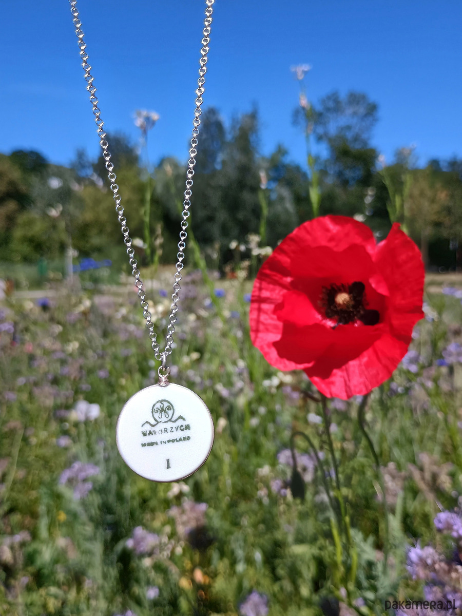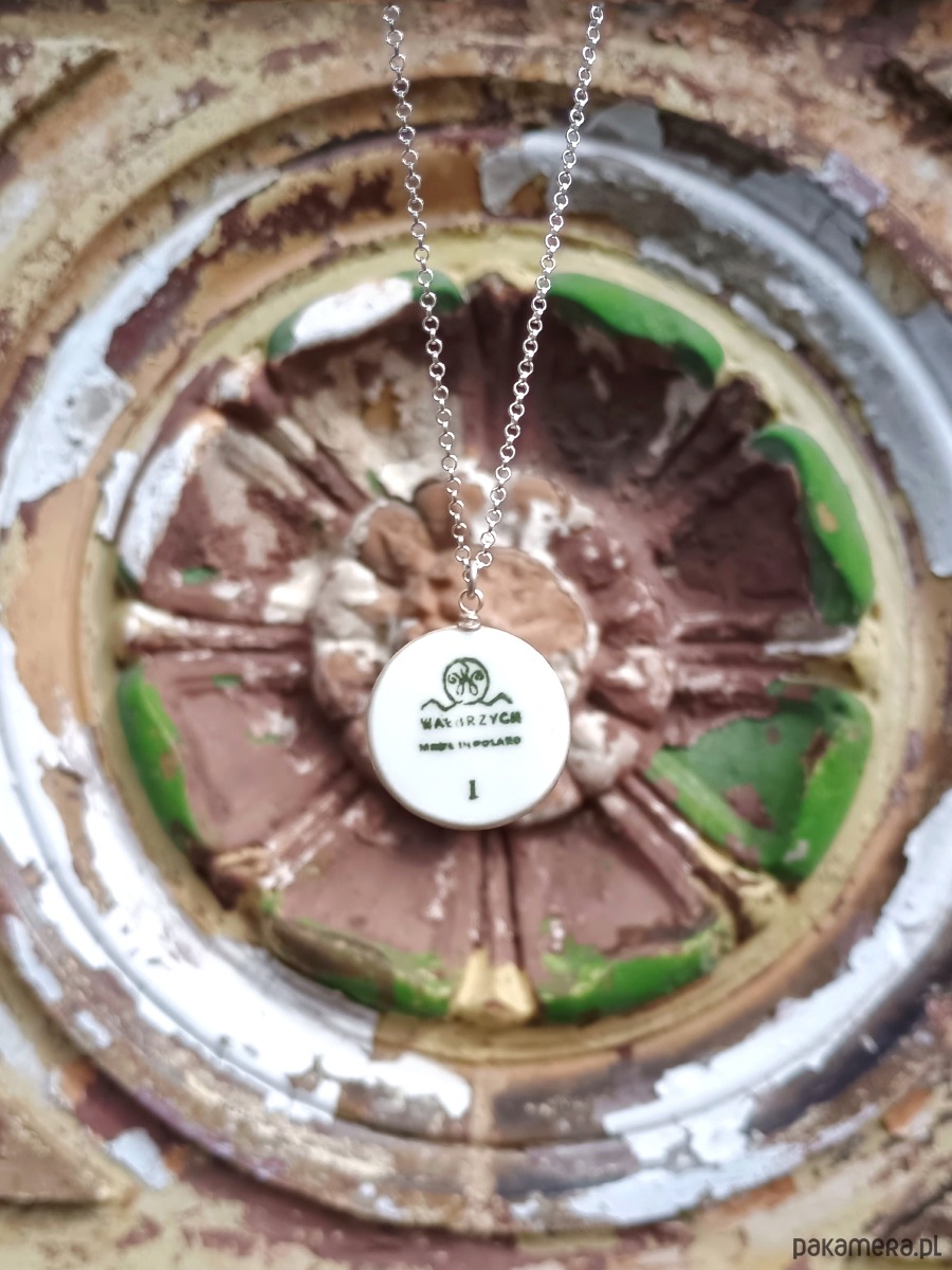 Oto naszyjnik, który wykonałam z fragmentu stłuczonego talerza porcelanowego Wałbrzych z widoczną sygnaturą. Kawałek stłuczki oszlifowałam nadając okrągły ksztalt, oprawiłam w drucik i zamocowałam na srebrnym łańcuszku (srebro 925). Brzegi pokryłam lakierem, co sprawia, że nie brudzą się i nie chłoną wilgoci. Średnica zawieszki ceramicznej: 22 mm. Długość łańcuszka w całości: 45 cm. Praca była eksponowana na wystawie Porcelana TERAZ! I Ogólnopolski Przegląd Twórczości w Porcelanie w BWA Wałbrzych. Unikat - każdy z moich wyrobów występuje w jednym egzemplarzu. Upcykling - nie reprodukuję wykorzystywanych wzorów, niczego nie domalowuję - wykorzystuję wyłącznie oryginalne naczynia i motywy, które się na nich znajdują. Tym samym, stłuczce z odzysku nadaję nowe życie.