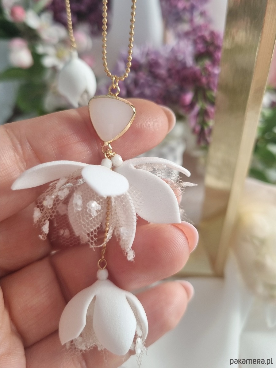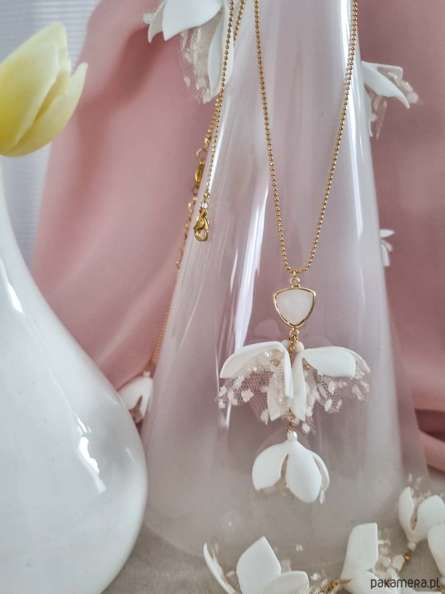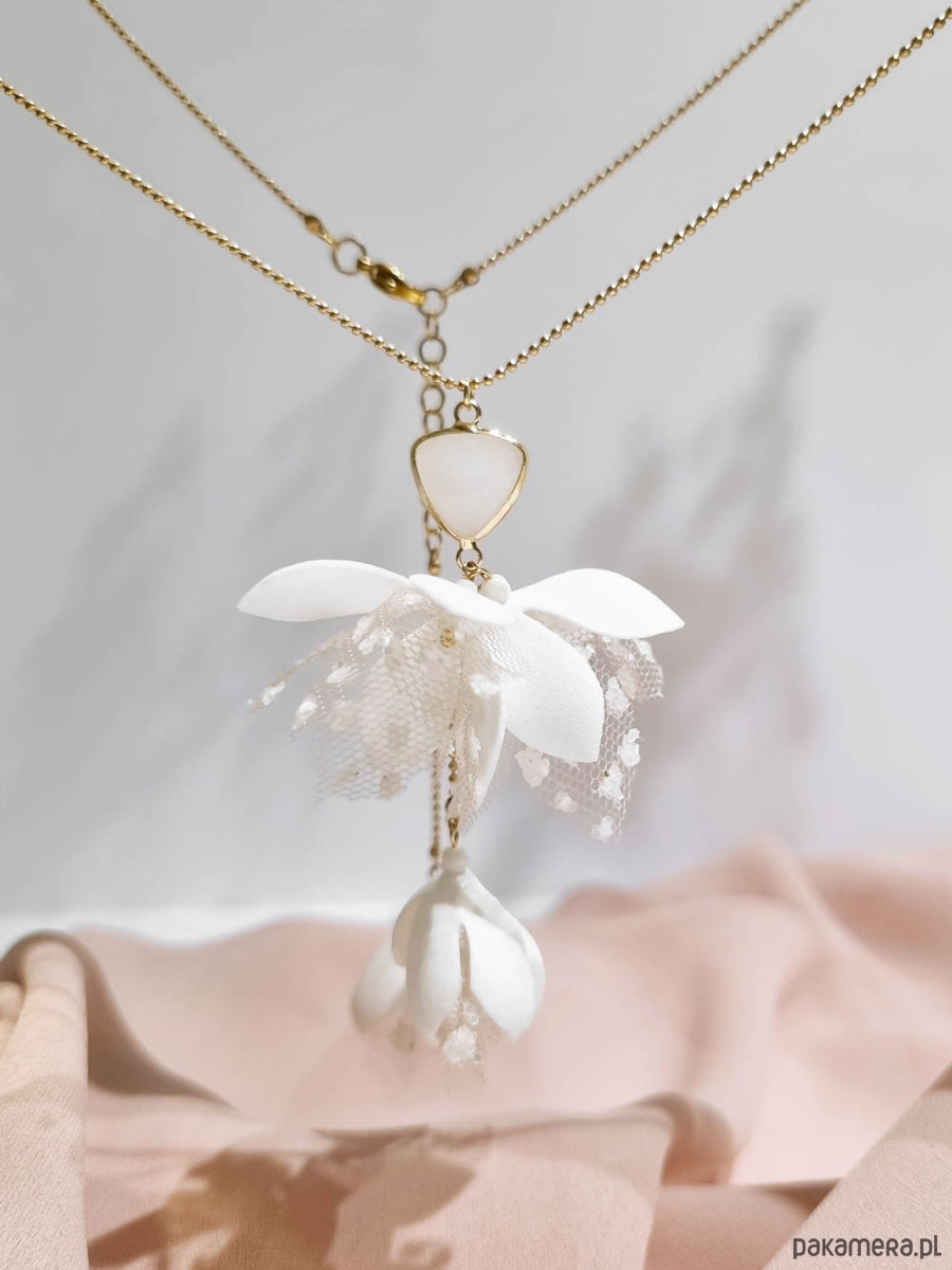 Efektowny naszyjnik z kwiatami z klasycznej pianki w połączeniu z brokatowym tiulem pięknie ozdobi szyję Panny Młodej.