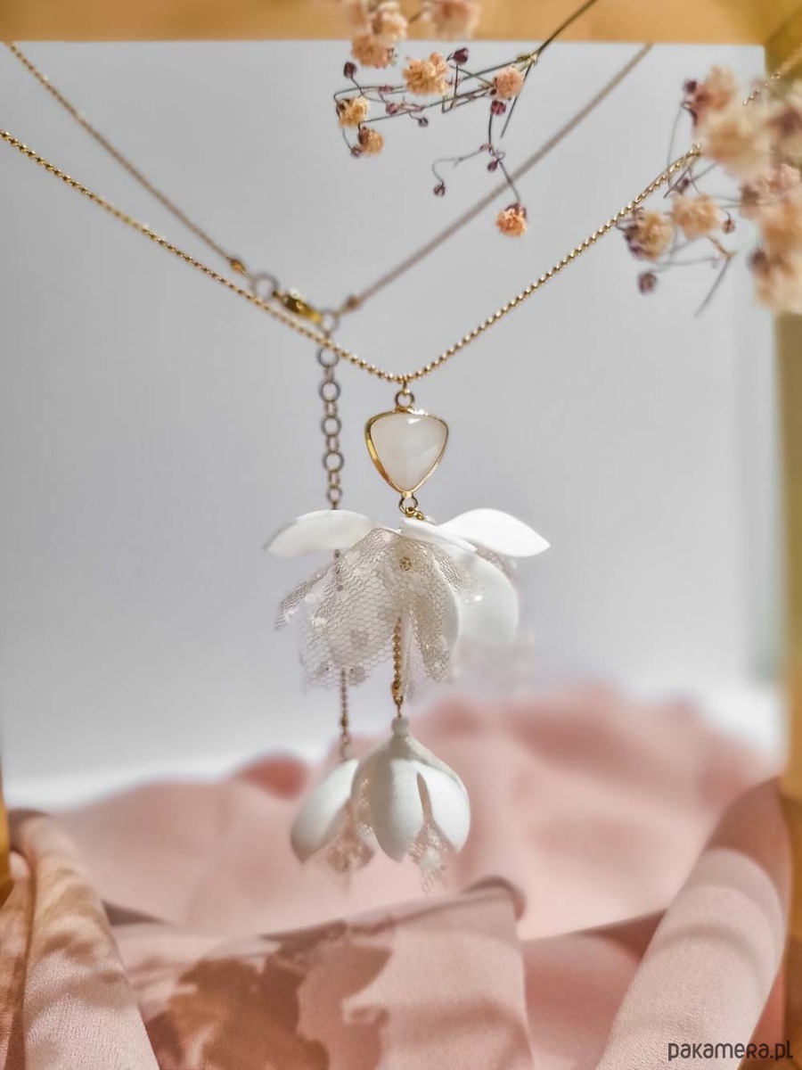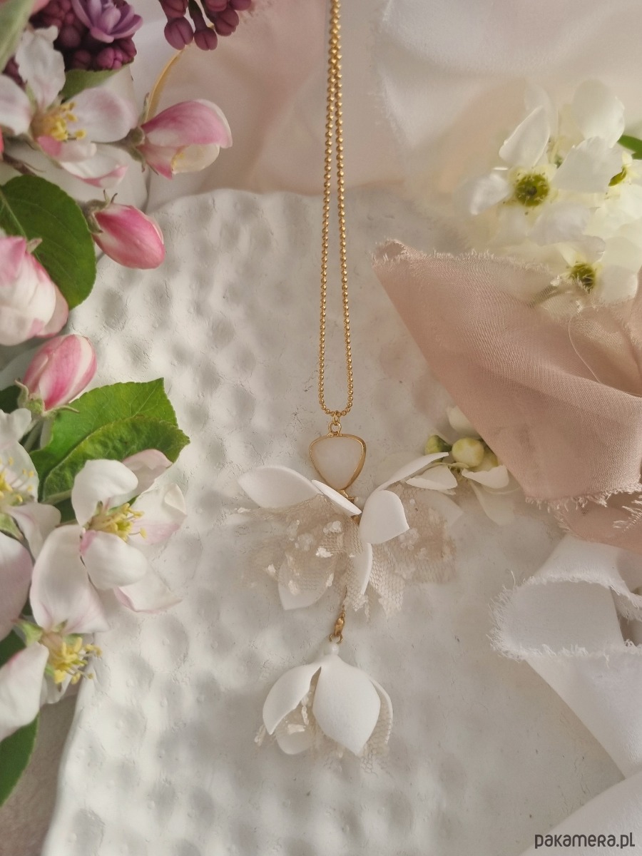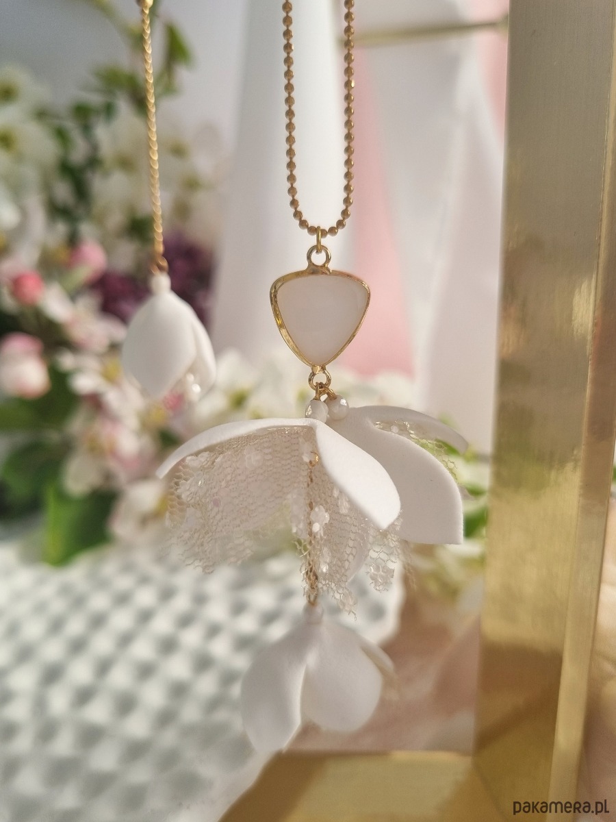 Efektowny naszyjnik z kwiatami z klasycznej pianki w połączeniu z brokatowym tiulem pięknie ozdobi szyję Panny Młodej.