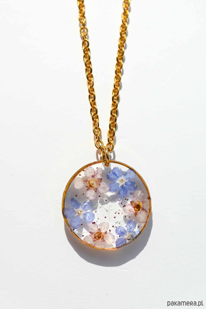 Delikatny naszyjnik z prawdziwymi niezapominajkami i tawułą japońską zatopionymi w żywicy. Ręcznie wykonany, subtelny i romantyczny – idealny na prezent. Wielkość 2,5cm, pakowany na prezent.