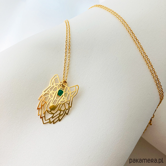 Ten oryginalny srebrny pozłacany naszyjnik z geometryczną zawieszką w kształcie stylizowanej głowy wilka ma unikalny geometryczny kształt. Jest wykonany na podstawie autorskiego projektu, ma niepowtarzalny wzór. Może byc również zawieszony na podwójnym łańcuszku widocznym na jednym ze zdjęć.