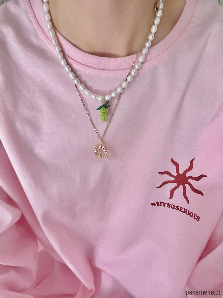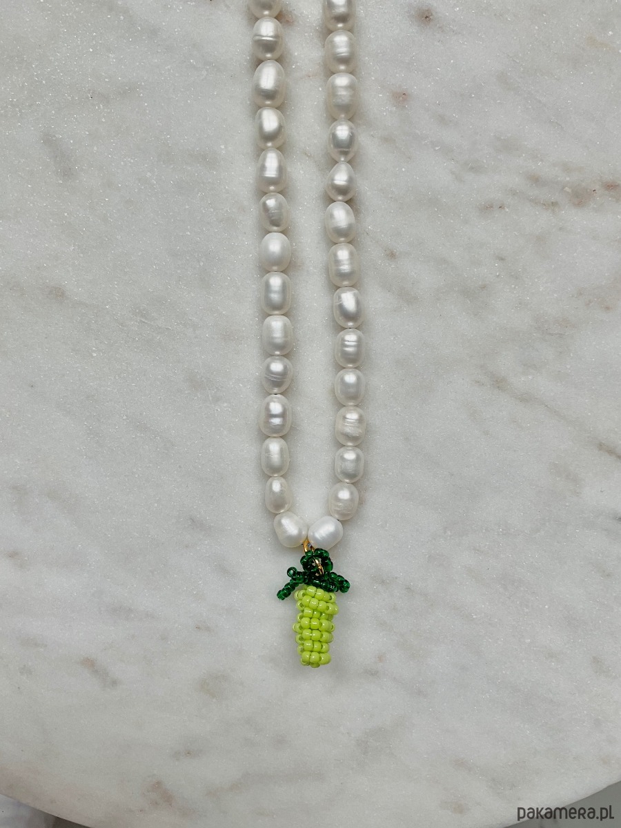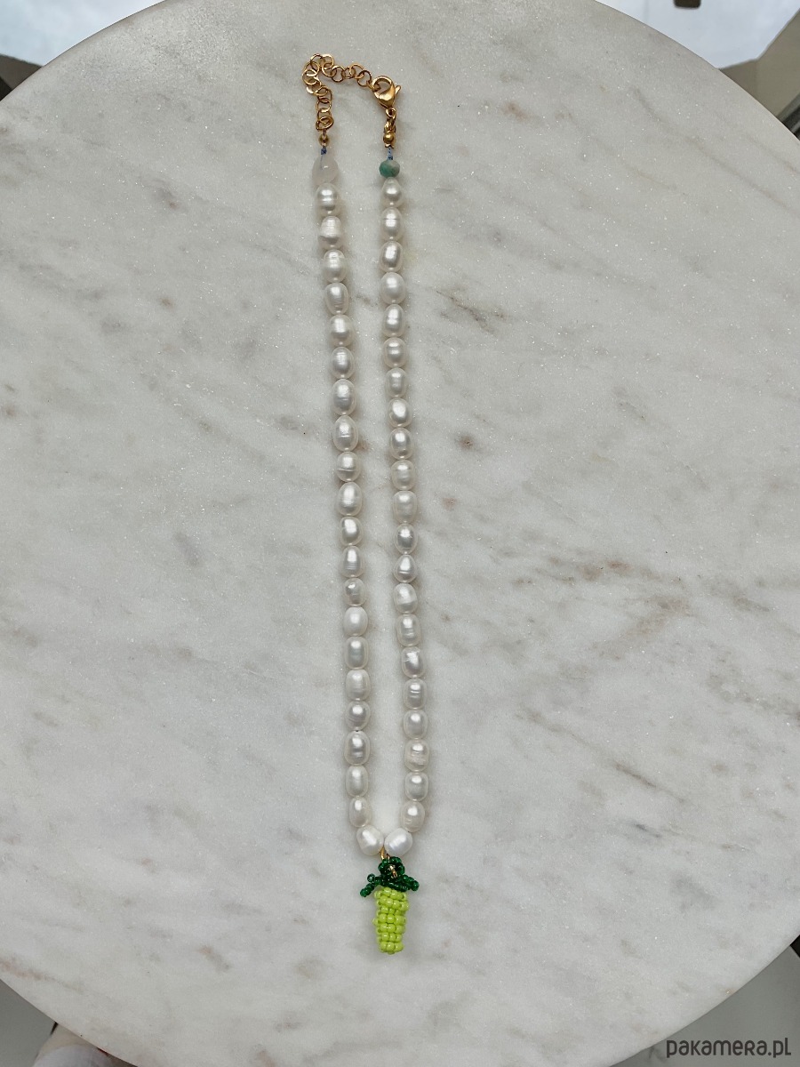 Naszyjnik kobiecy z pereł słodkowodnych z pojedynczą zawieszką zaplecioną ze szklanych koralików w kształcie winogrona.