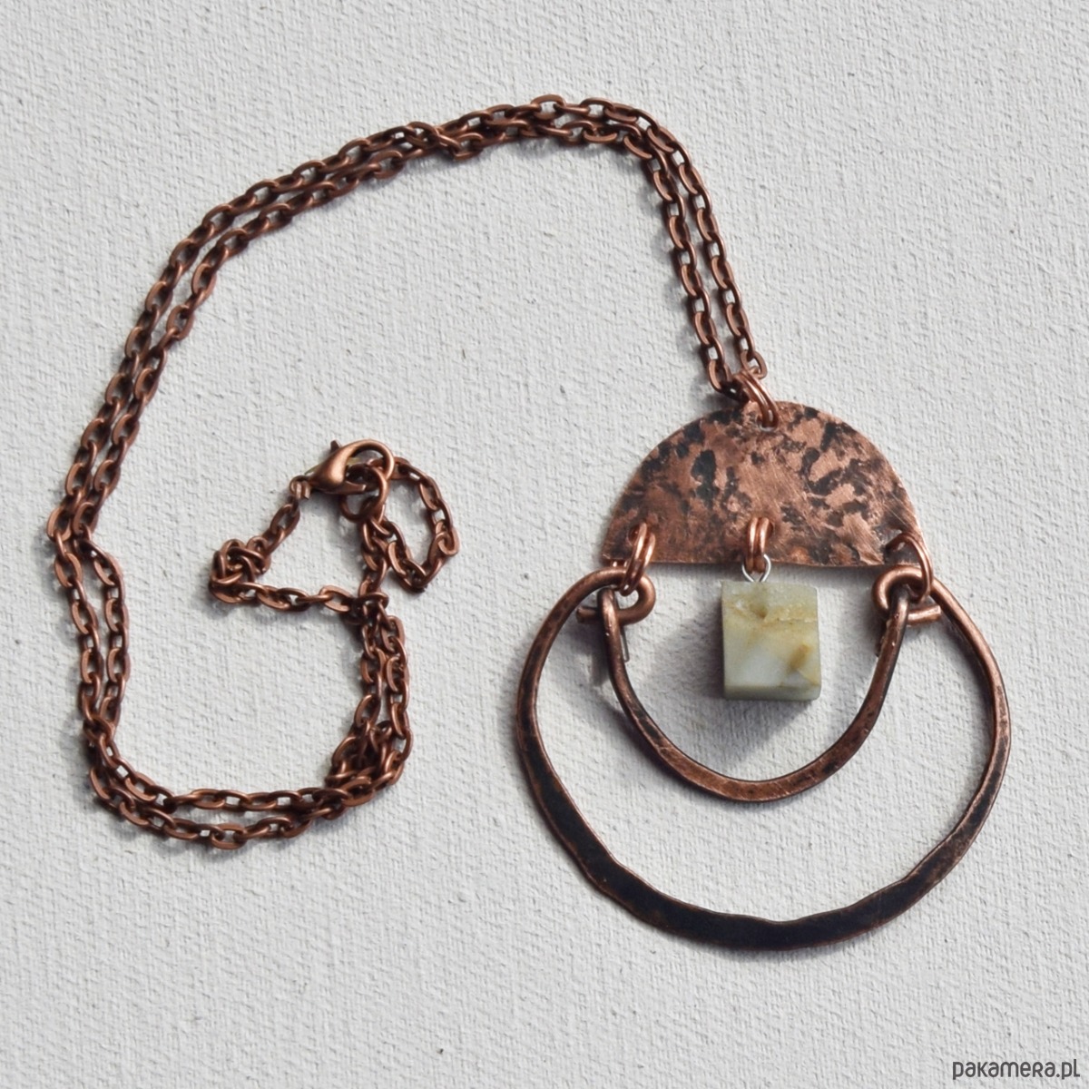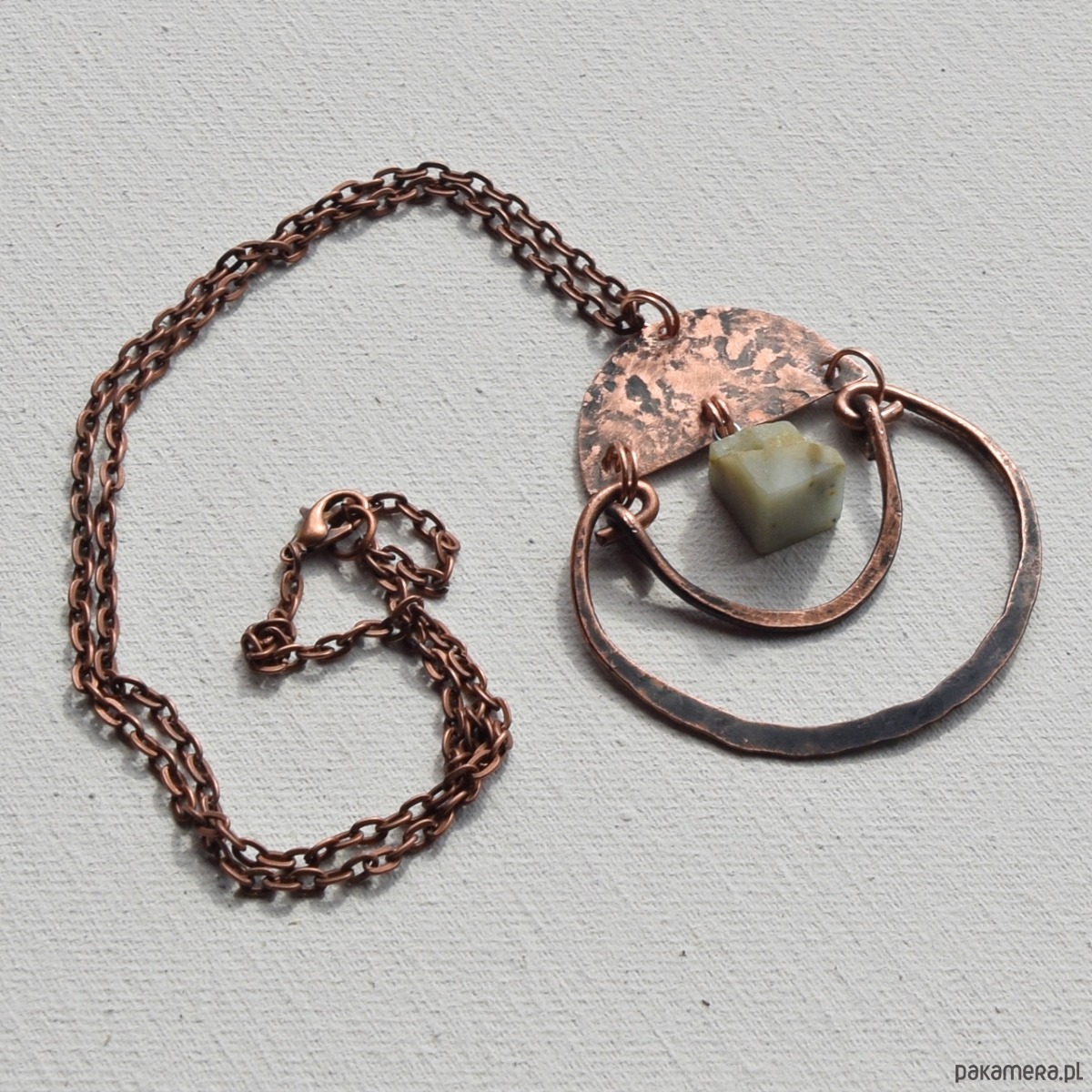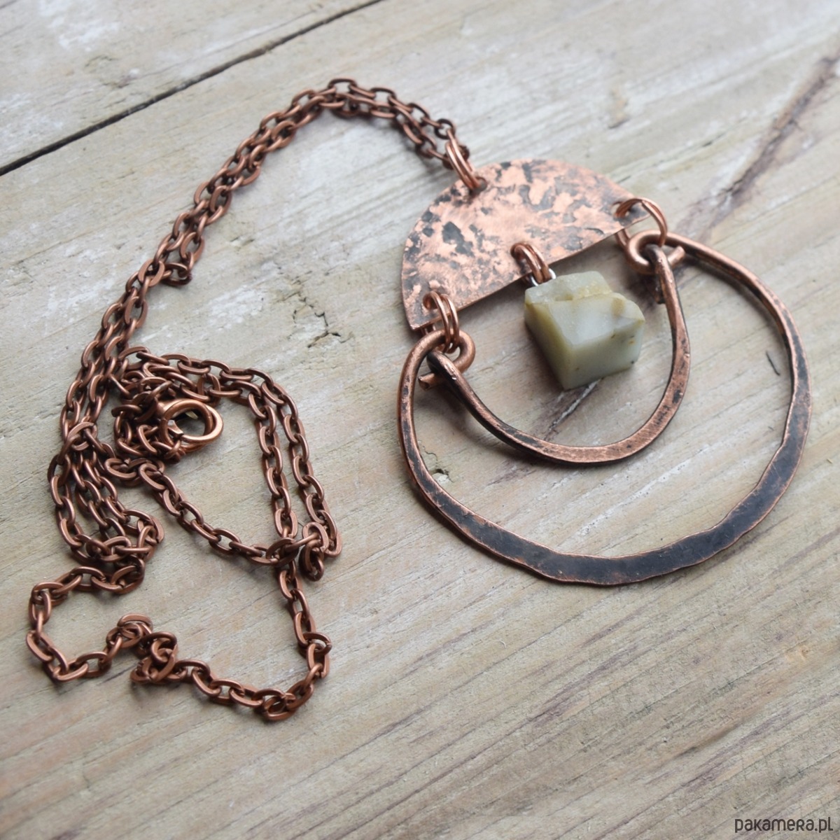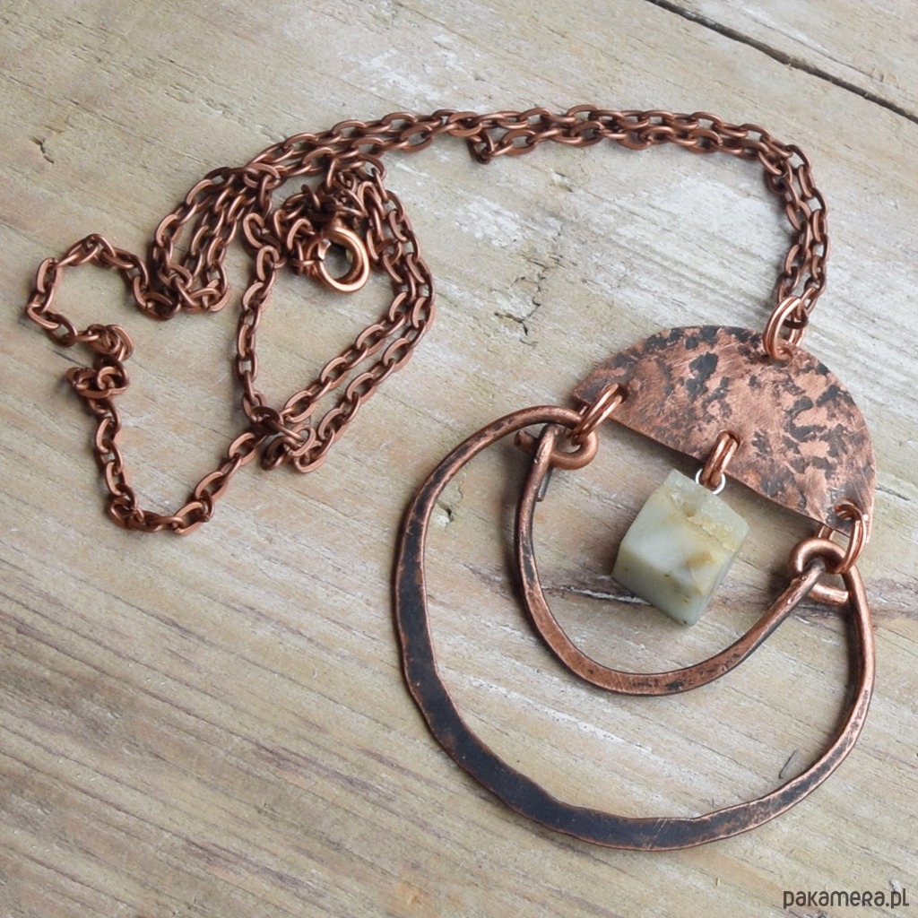 Naszyjnik - wisior wykonany z kutej, oksydowanej miedzi, częściowo przecieranej papierem ściernym, o surowym charakterze stylizowanym na stary, "wykopaliskowy" metal. Tu połączona z amazonitem i łańcuszkiem w kolorze starej miedzi.
