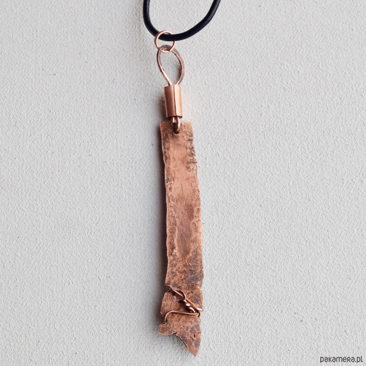 Wisior wykonany z kutej, oksydowanej miedzi, przecieranej papierem ściernym, o surowym charakterze stylizowanym na stary, antyczny, "wykopaliskowy" metal. Tu w połączeniu z lapis lazuli, zawieszony na czarnym rzemieniu.