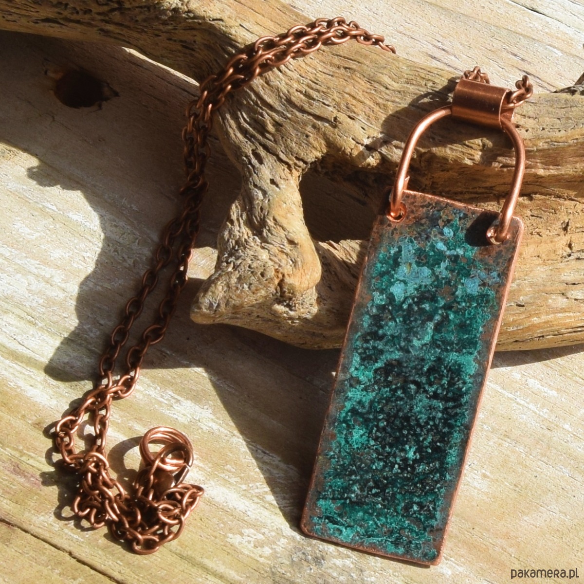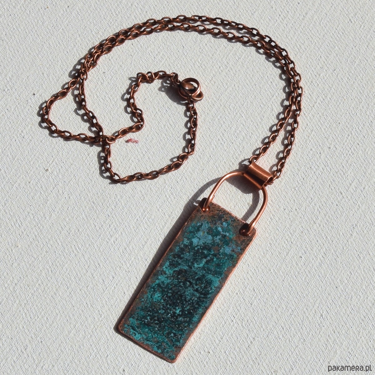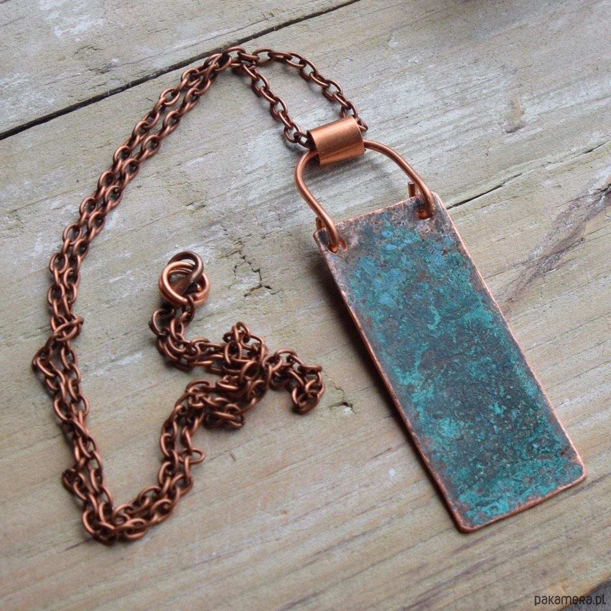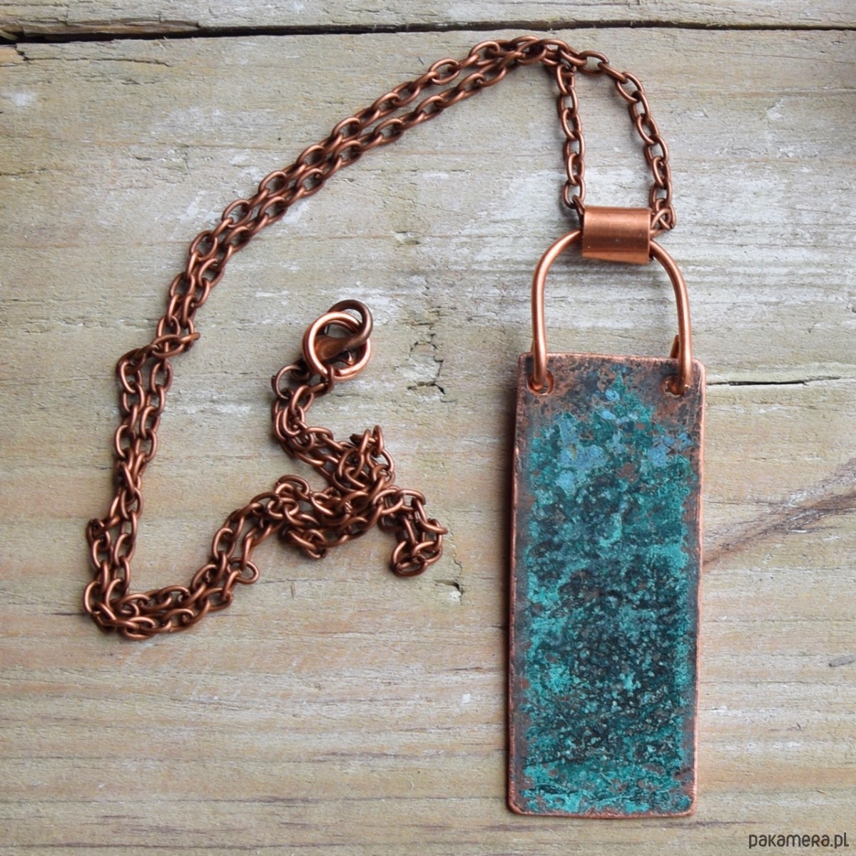 Wisior - naszyjnik wykonany z patynowanej miedzi (naturalna zielona patyna) na łąńcuszku w kolorze starej miedzi.