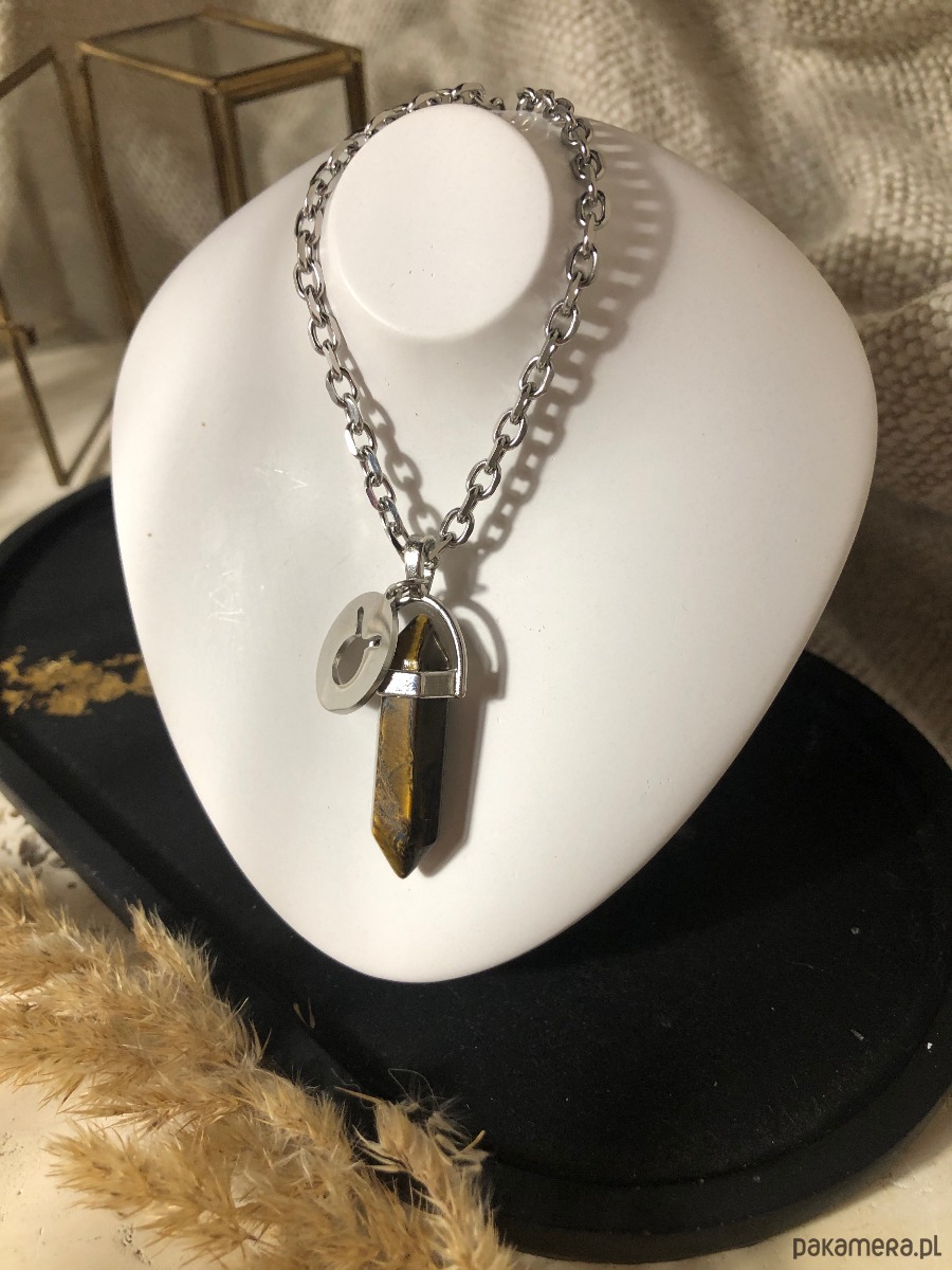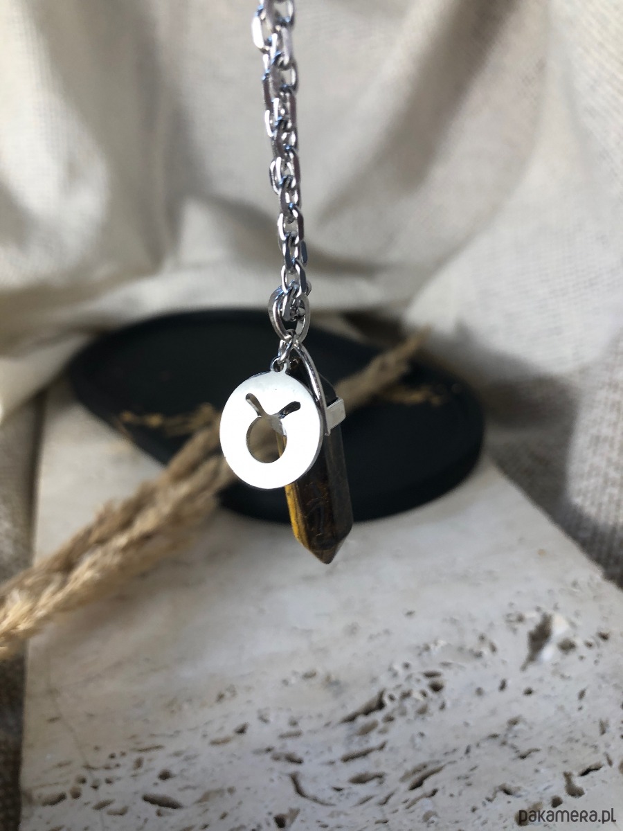 Naszyjnik wykonany z naturalnego kamienia i stali chirurgicznej. Posiada zapięcie typu karabińczyk. Długość naszyjnika to 55 cm. Na łańcuszek nawleczono wisior z tygrysiego oka o długości 4 cm oraz zawieszkę ze znakiem zodiaku Byk o średnicy 1,5 cm.