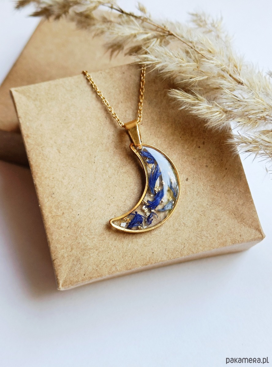 Uroczy wisiorek z zatopionymi płatkami chabra i płatkami złota. Wykonany z wysokiej klasy żywicy, która nie zmienia koloru pod wpływem promieniowania uv oraz wysokiej jakości stali chirurgicznej.