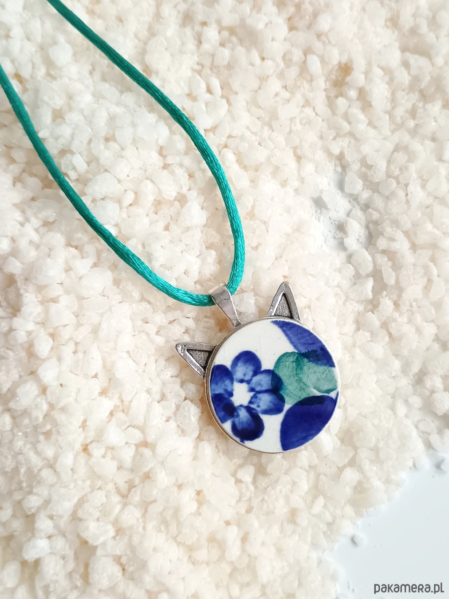Historia fajansu włocławskiego sięga 1873 roku. Zakładów było kilka, zmieniali się właściciele i lokalizacje. Produkcja najbardziej rozwinęła się po II WŚ, kiedy w miejscowych zakładach powstawał nie tylko fajans, ale również porcelit i porcelana. Zróżnicowane było także wzornictwo - produkowano nie tylko naczynia, ale również elementy wyposażenia wnętrz (lampy, świeczniki, żyrandole). Mimo tej różnorodności, najbardziej rozpoznawalnym wyrobem z Włocławka jest talerz w ręcznie malowane kobaltowe kwiaty (z takich najchętniej korzystam :). I mimo, że najdłużej działająca fabryka zakończyła działalność w 1991 roku, dzięki lokalnym inicjatywom produkcja fajansu została wznowiona i trwa do dziś! Oto naszyjnik, który wykonałam z fragmentu fajansu włocławskiego w kolorowe wzory. Fragment oszlifowałam w okrągły kształt i osadziłam w metalowej bazie z kocimi uszami w kolorze zielonym. Ceramikę zeszlifowałam również z grubości - jest cieńsza niż pierwotnie, dzięki czemu wisior nie jest masywny. Brzegi pokryłam lakierem, co sprawia, że nie brudzą się i nie chłoną wilgoci. Do zawieszki dobrałam satynowy sznureczek w kolorze granatowym. Średnica elementu ceramicznego: 26 mm. Długość sznureczka w całości: ok. 80 cm (naszyjnik zakłada się przez głowę). Upcykling - nie reprodukuję wykorzystywanych wzorów, niczego nie domalowuję - wykorzystuję wyłącznie oryginalne naczynia i motywy, które się na nich znajdują. Tym samym, stłuczce z odzysku nadaję nowe życie.